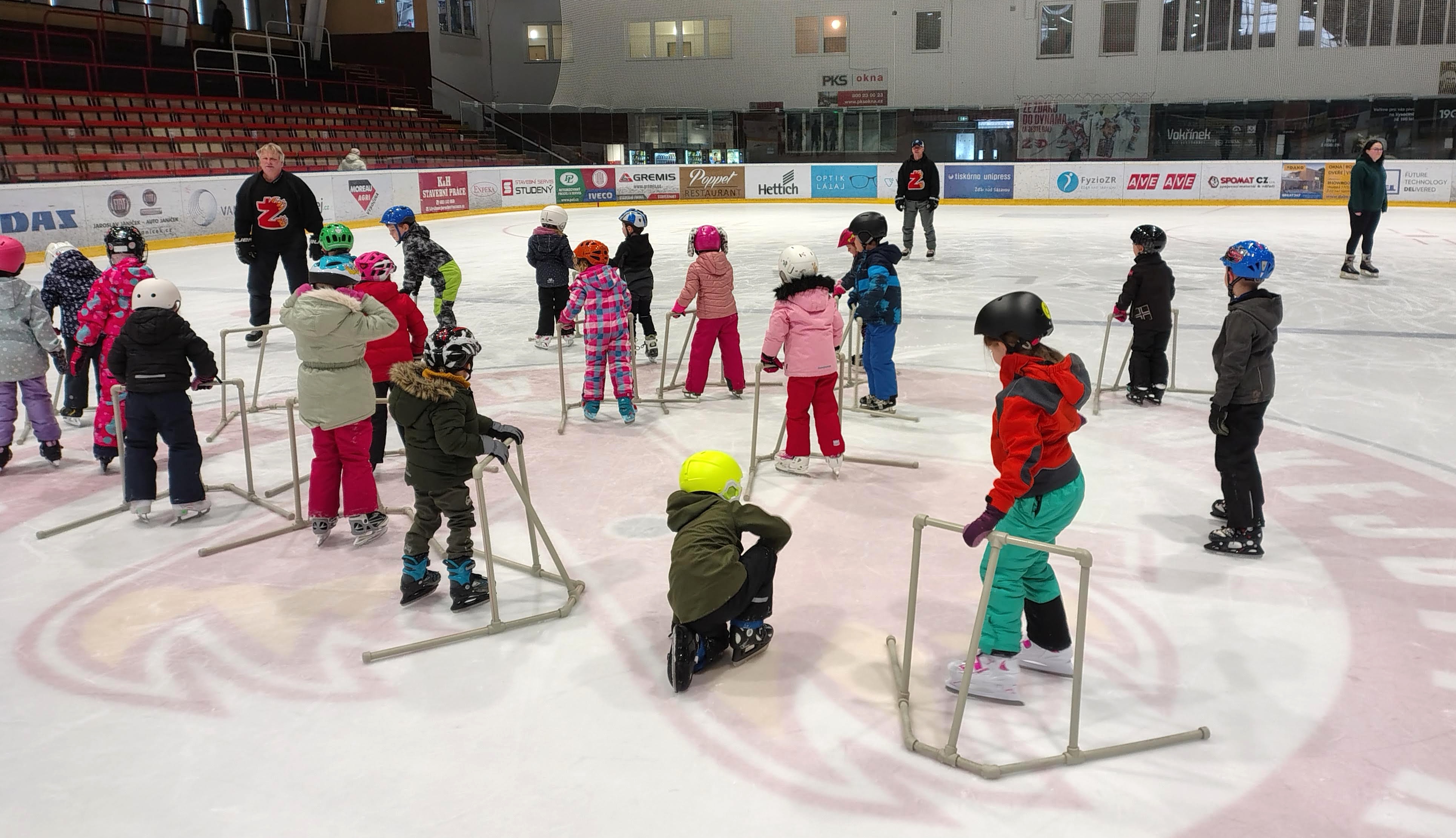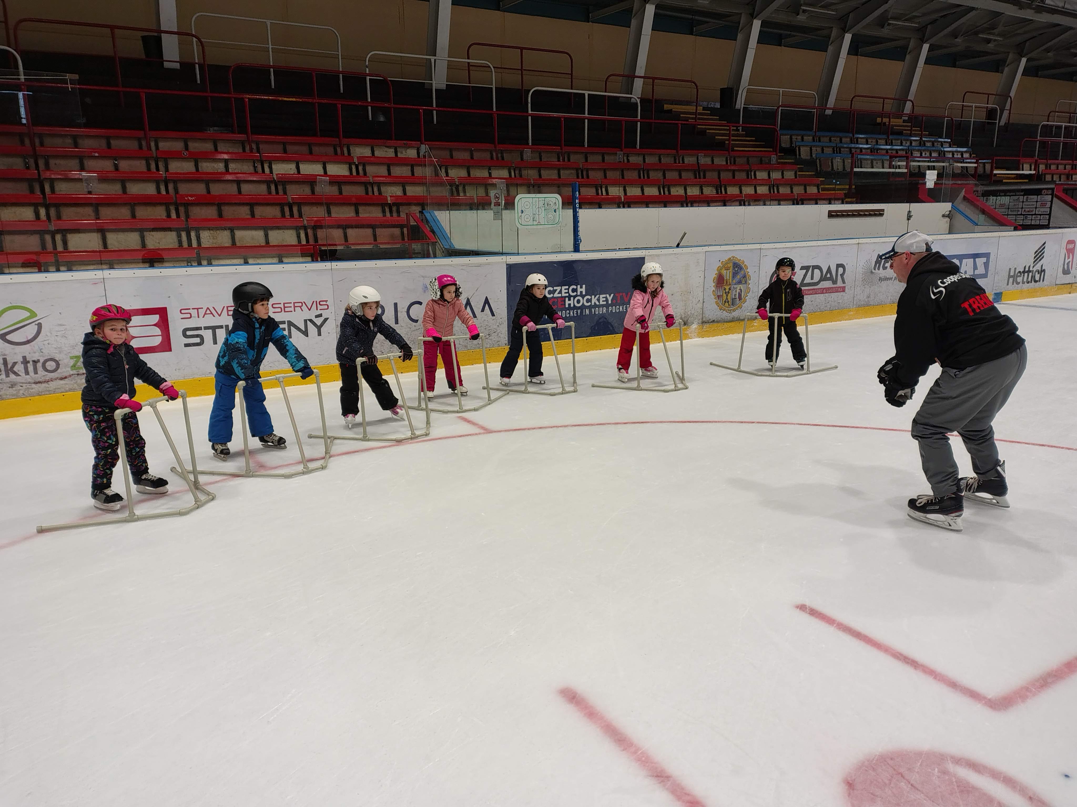 Instruktoři rozdělili děti do skupin, dle jejich možností a ke každému malému bruslaři přistupují individuálně.