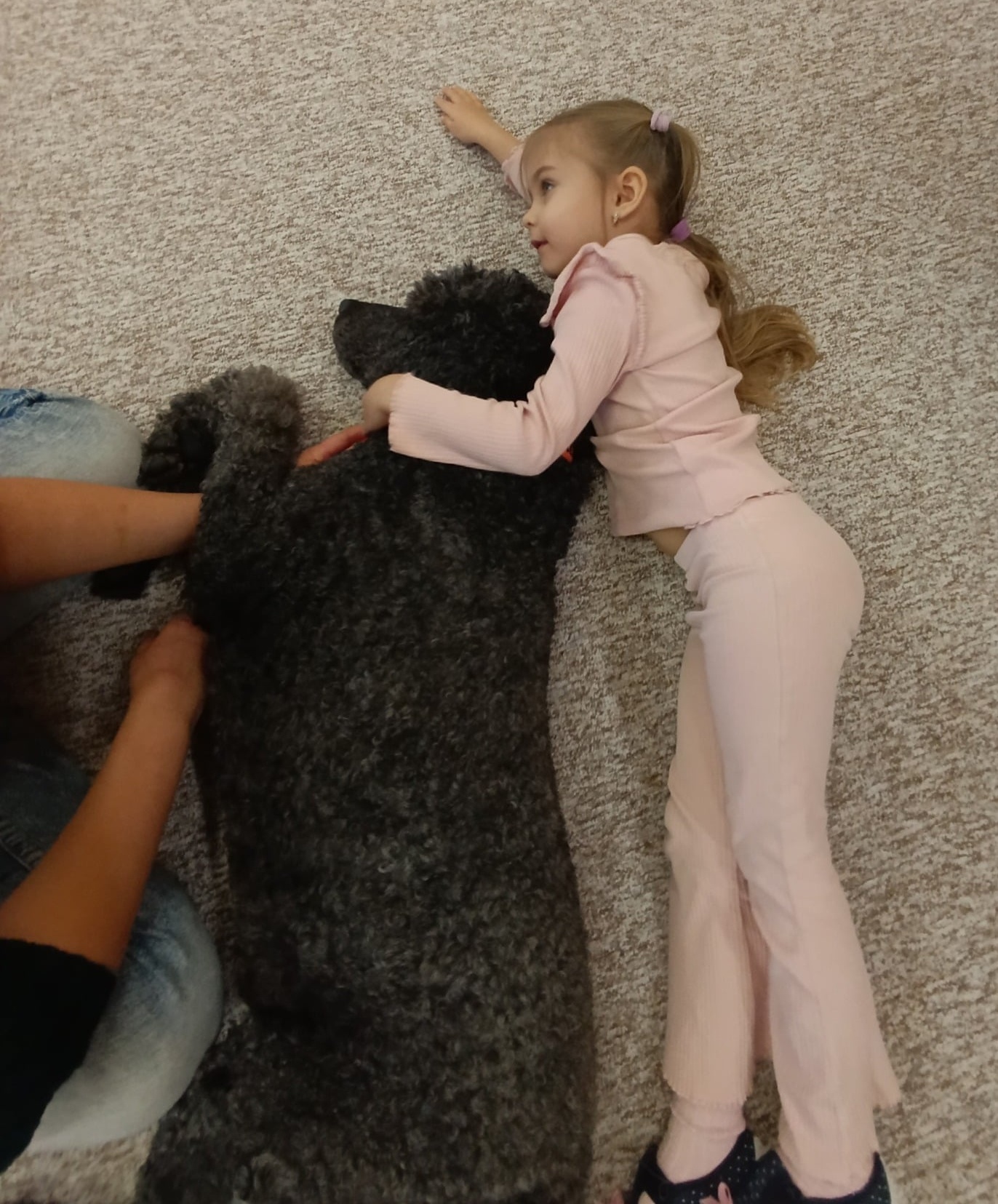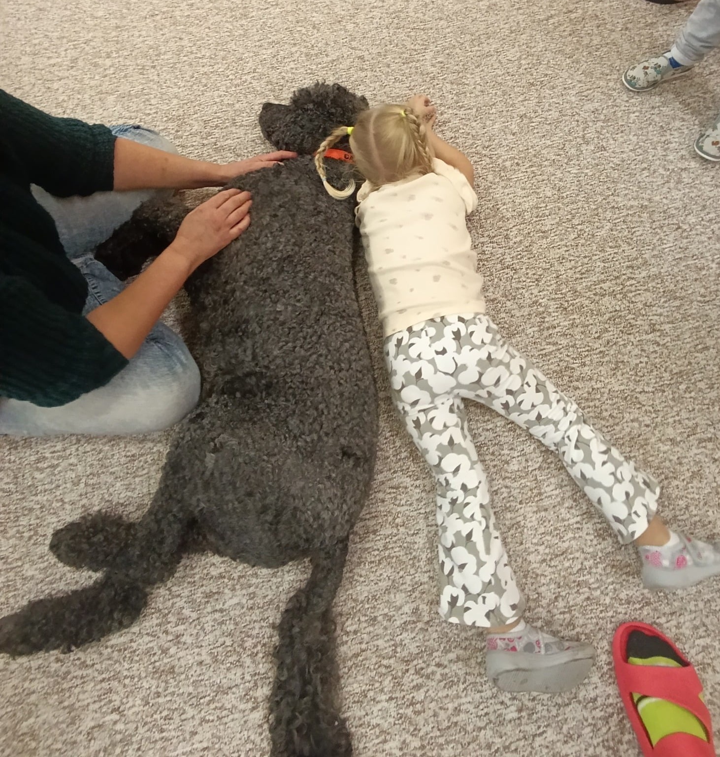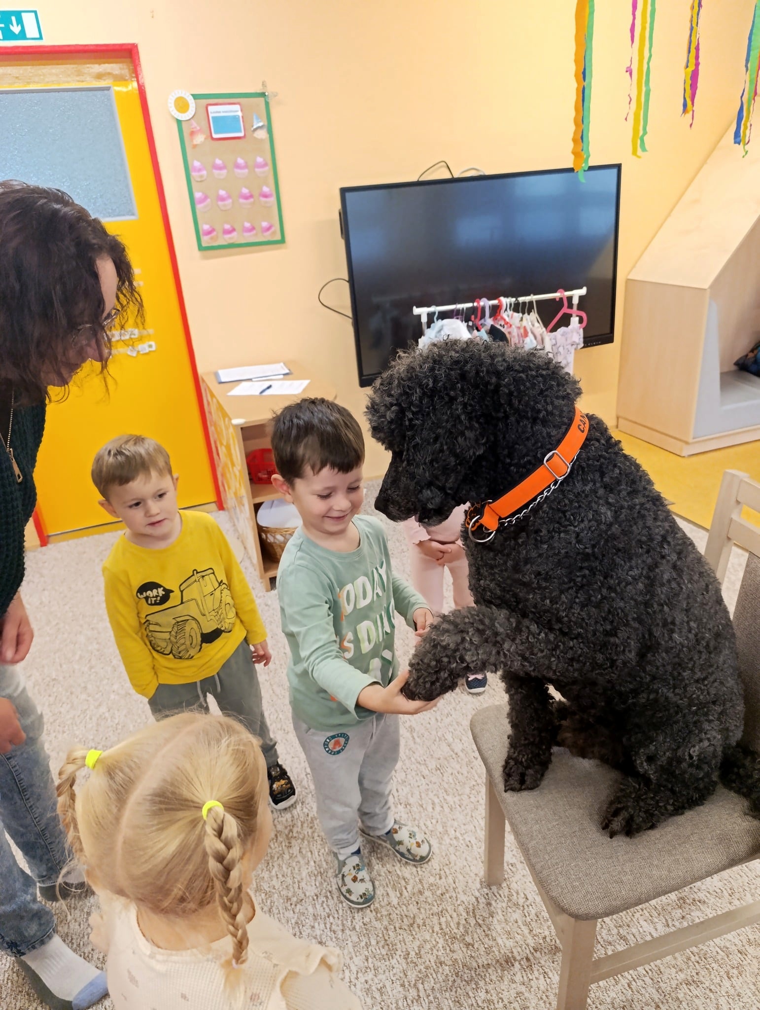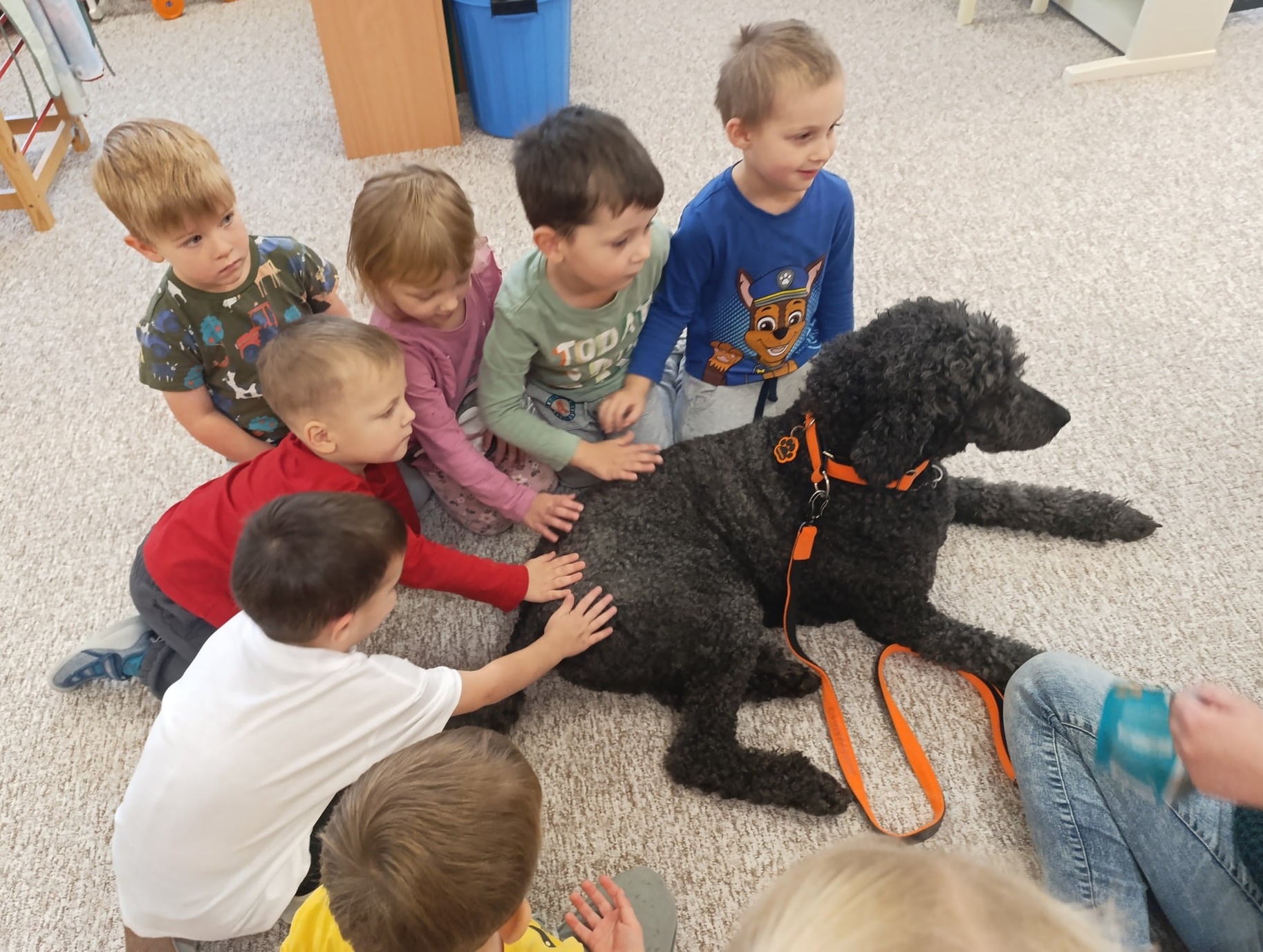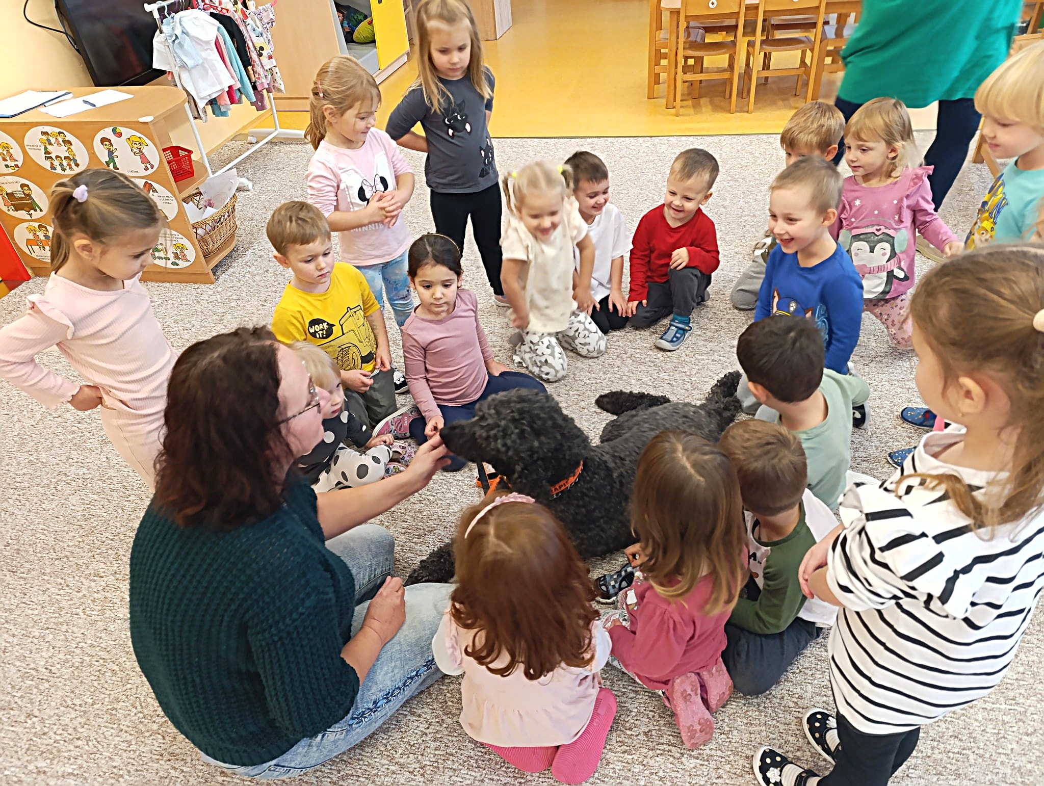 Nejen že jim předvedl doslova psí kusy – proskakoval obručí a podával dětem pac za psí dobrůtky, ale děti si vyzkoušely techniku polohování, kdy si k Antoniovi mohly jen přilehnout, nebo si na něj položit část svého těla (ruku, nohu, hlavu).