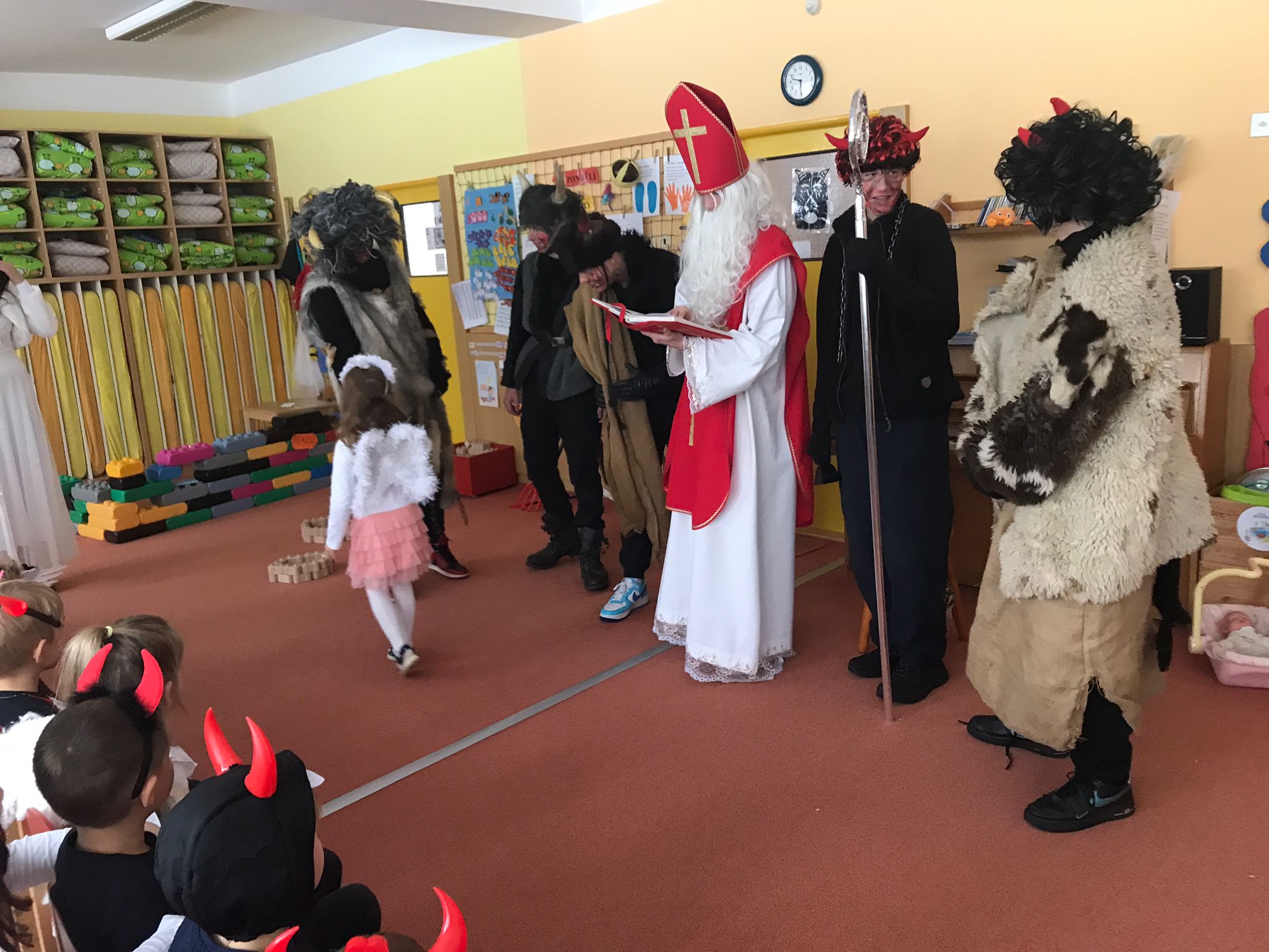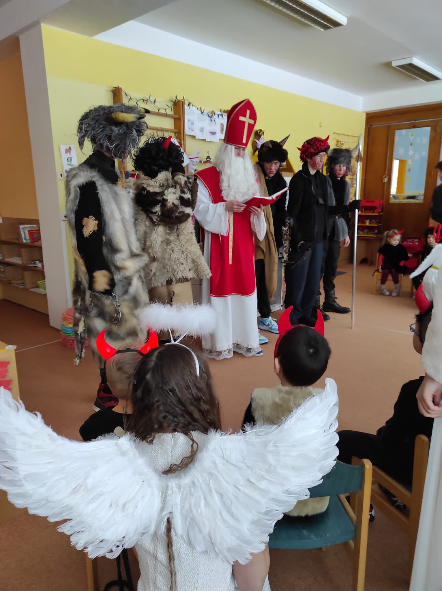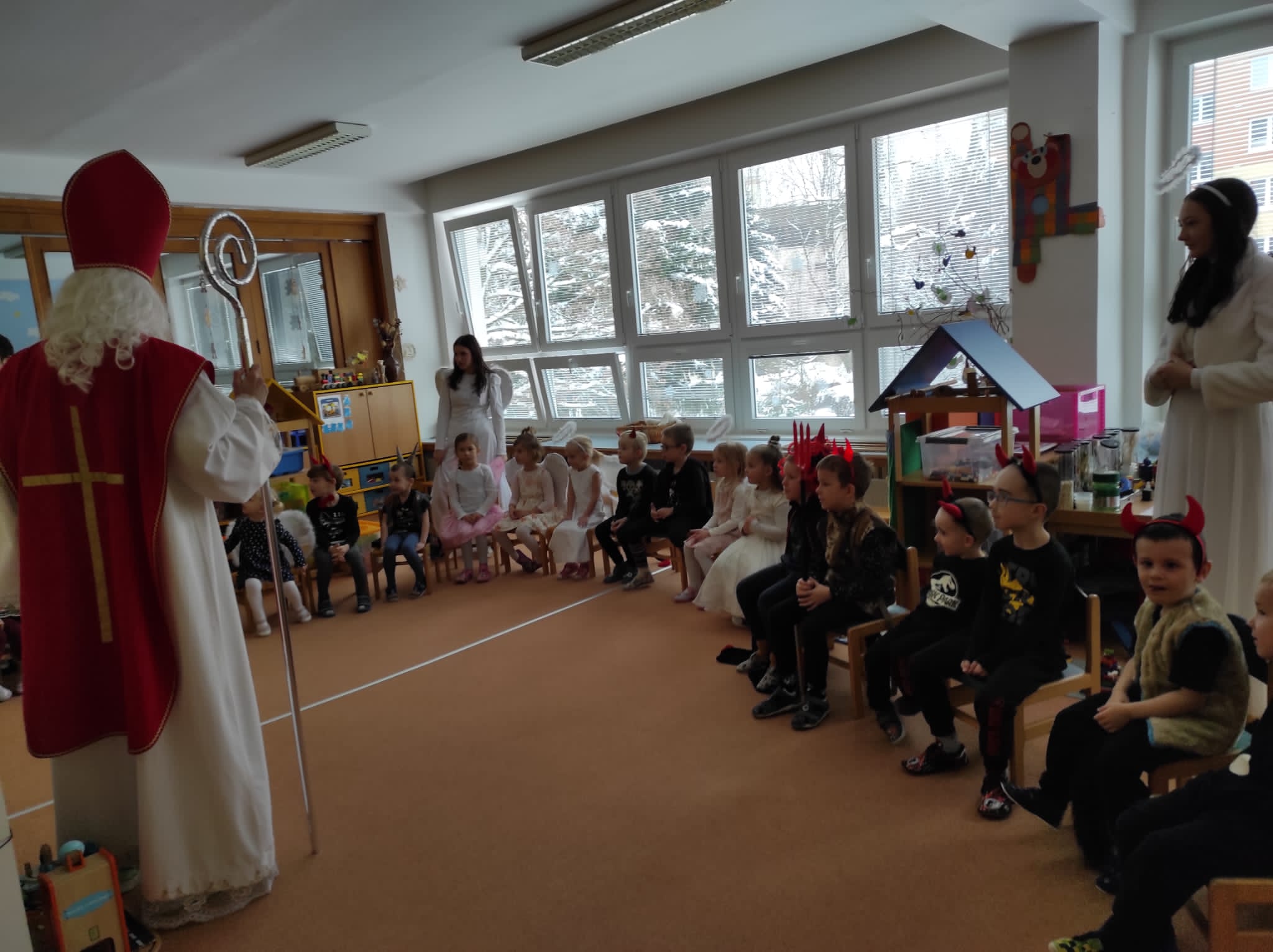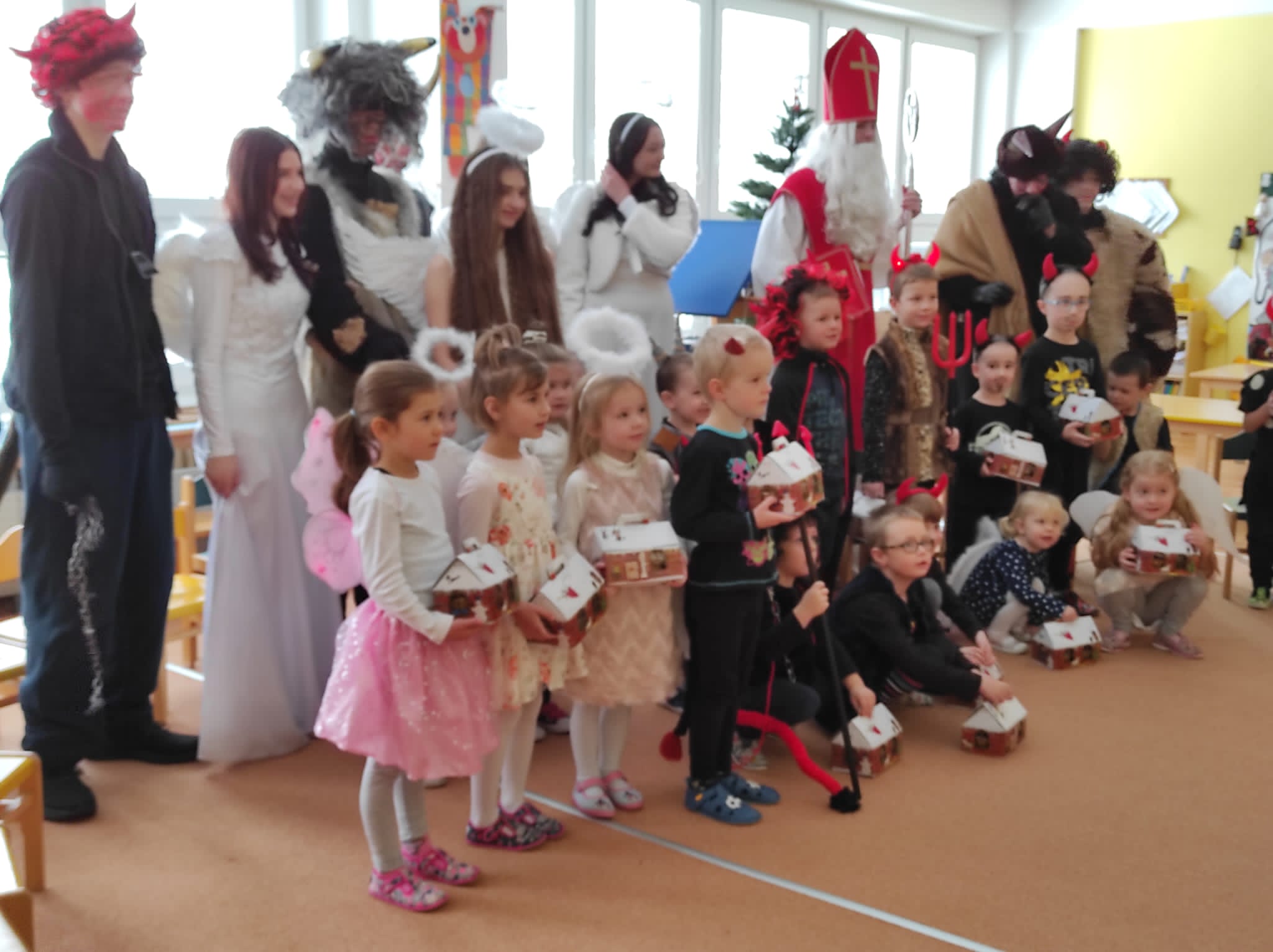 Minulý týden byl ve znamení čertů a andílků. Celý týden jsme si povídali o Mikuláši, hráli různé hry, pekli, zdobili stromeček a v úterý nás navštívil Mikuláš s čerty a anděly. Děti dostaly i mikulášskou nadílku.
