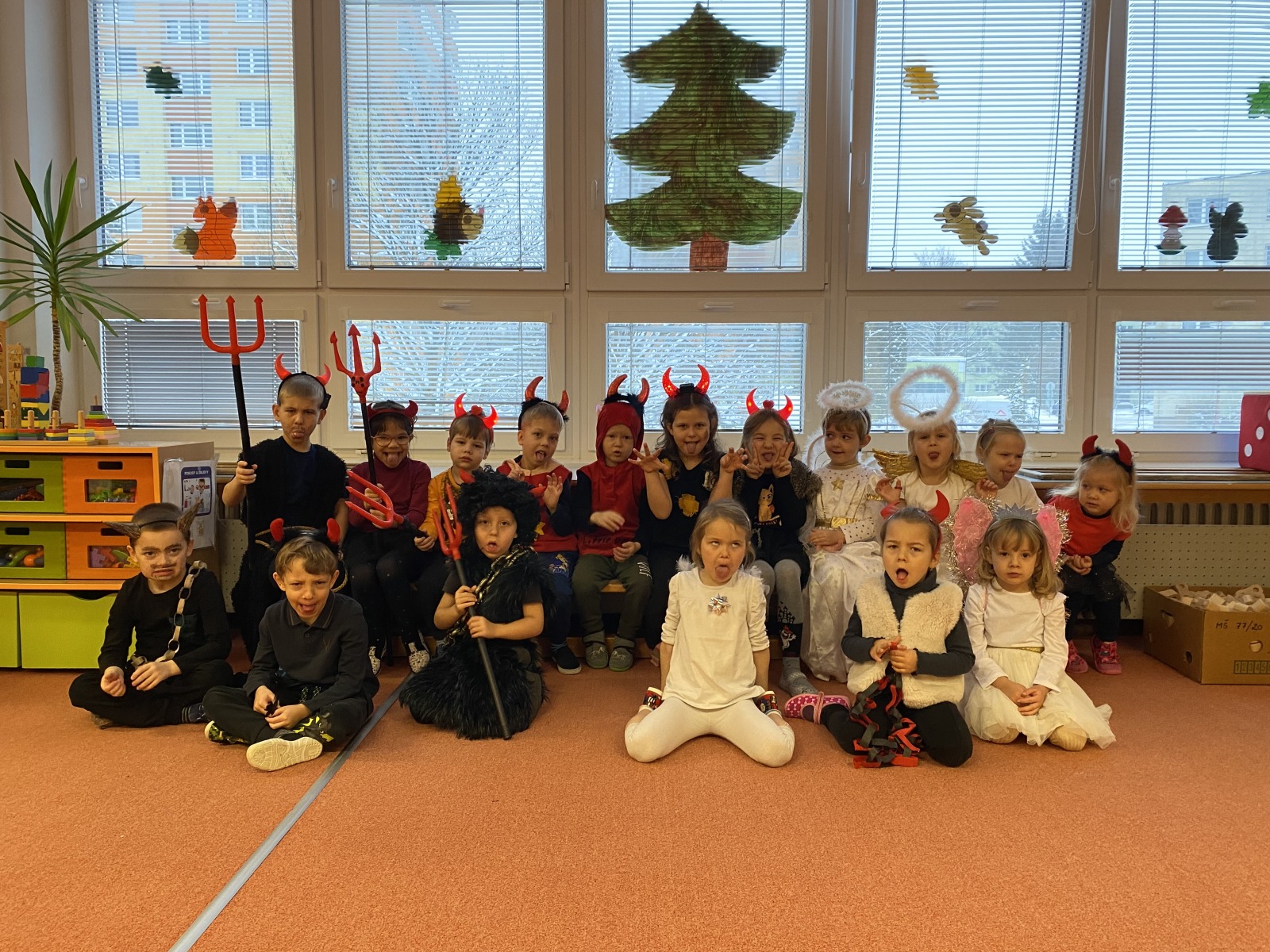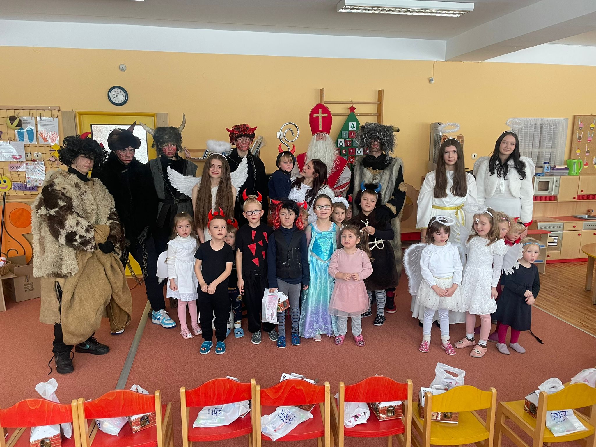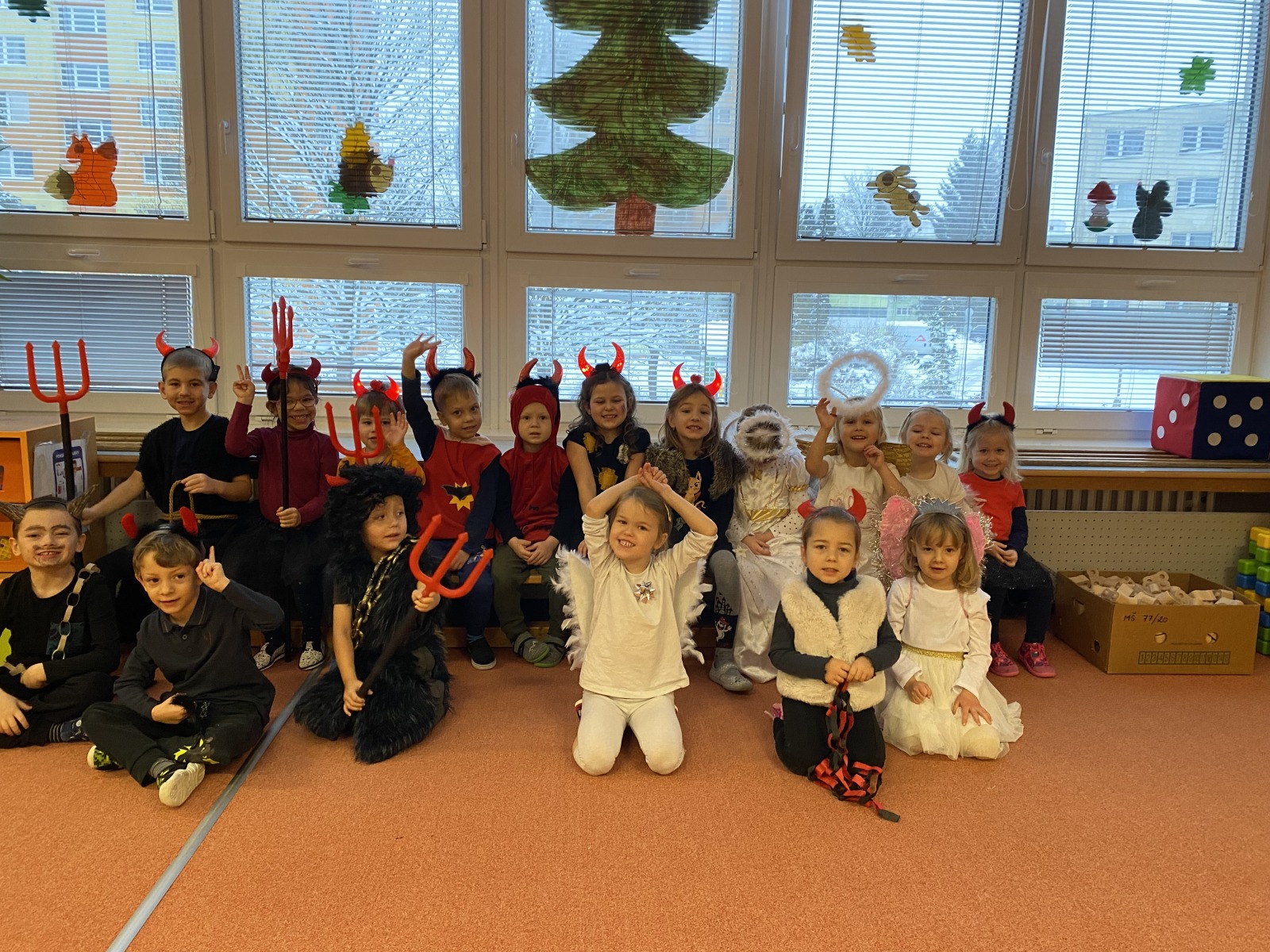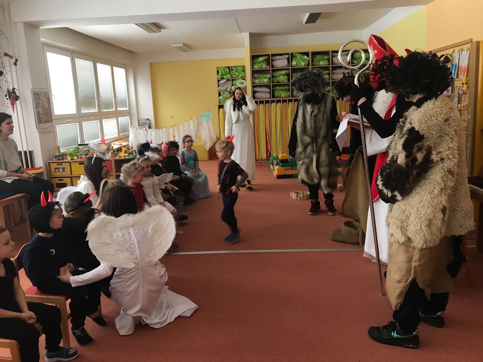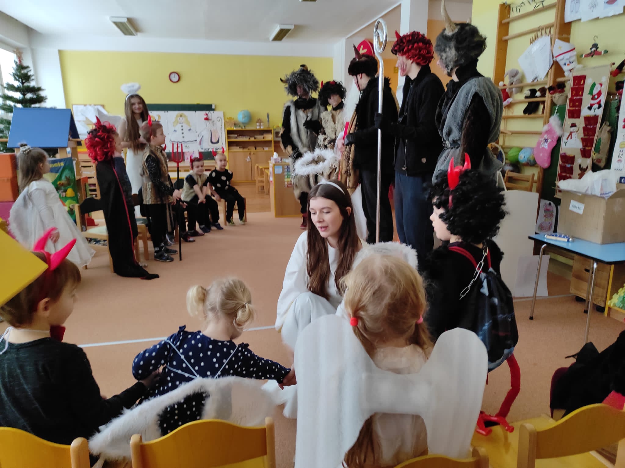 Minulý týden byl ve znamení čertů a andílků. Celý týden jsme si povídali o Mikuláši, hráli různé hry, pekli, zdobili stromeček a v úterý nás navštívil Mikuláš s čerty a anděly. Děti dostaly i mikulášskou nadílku.