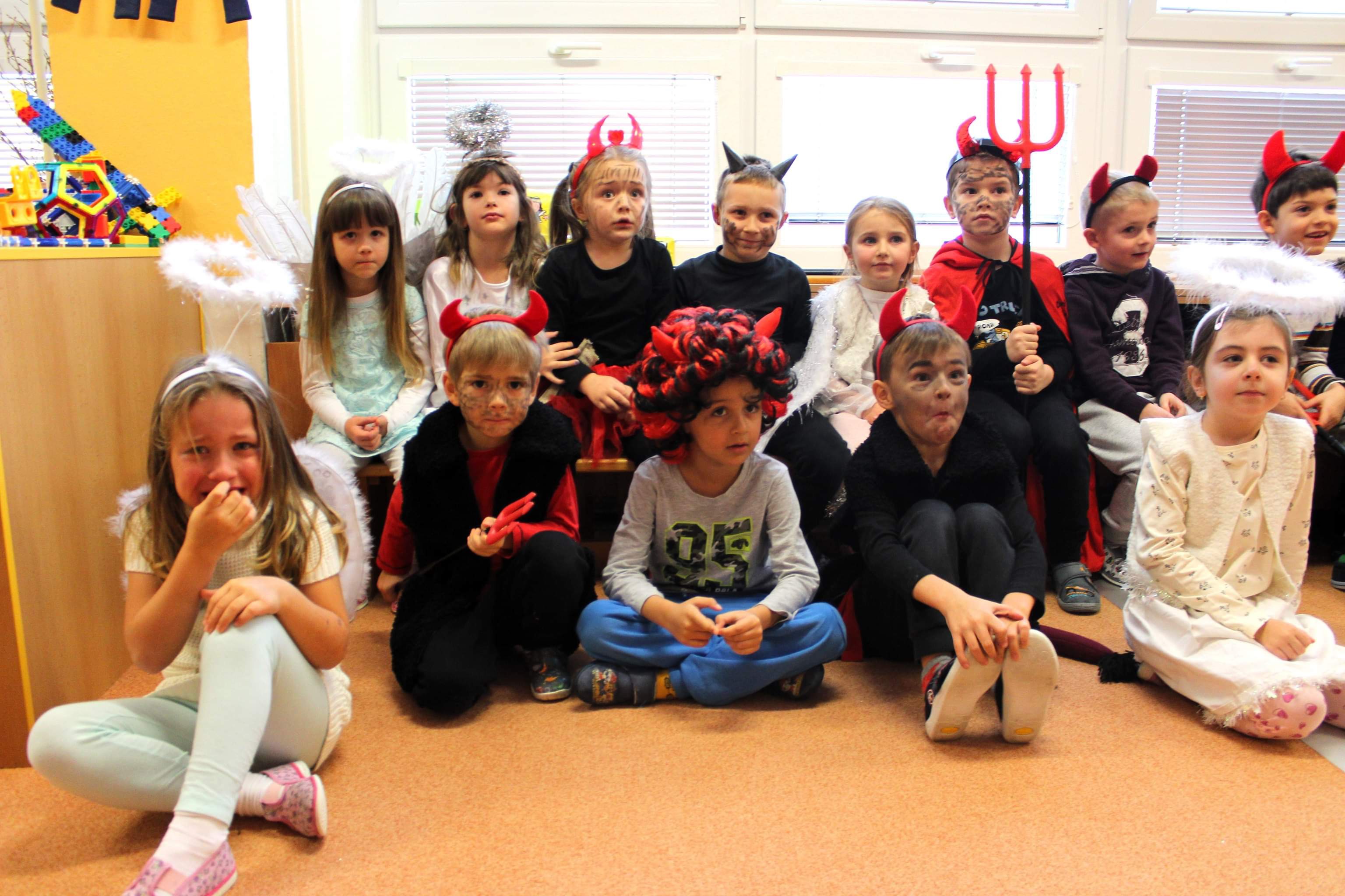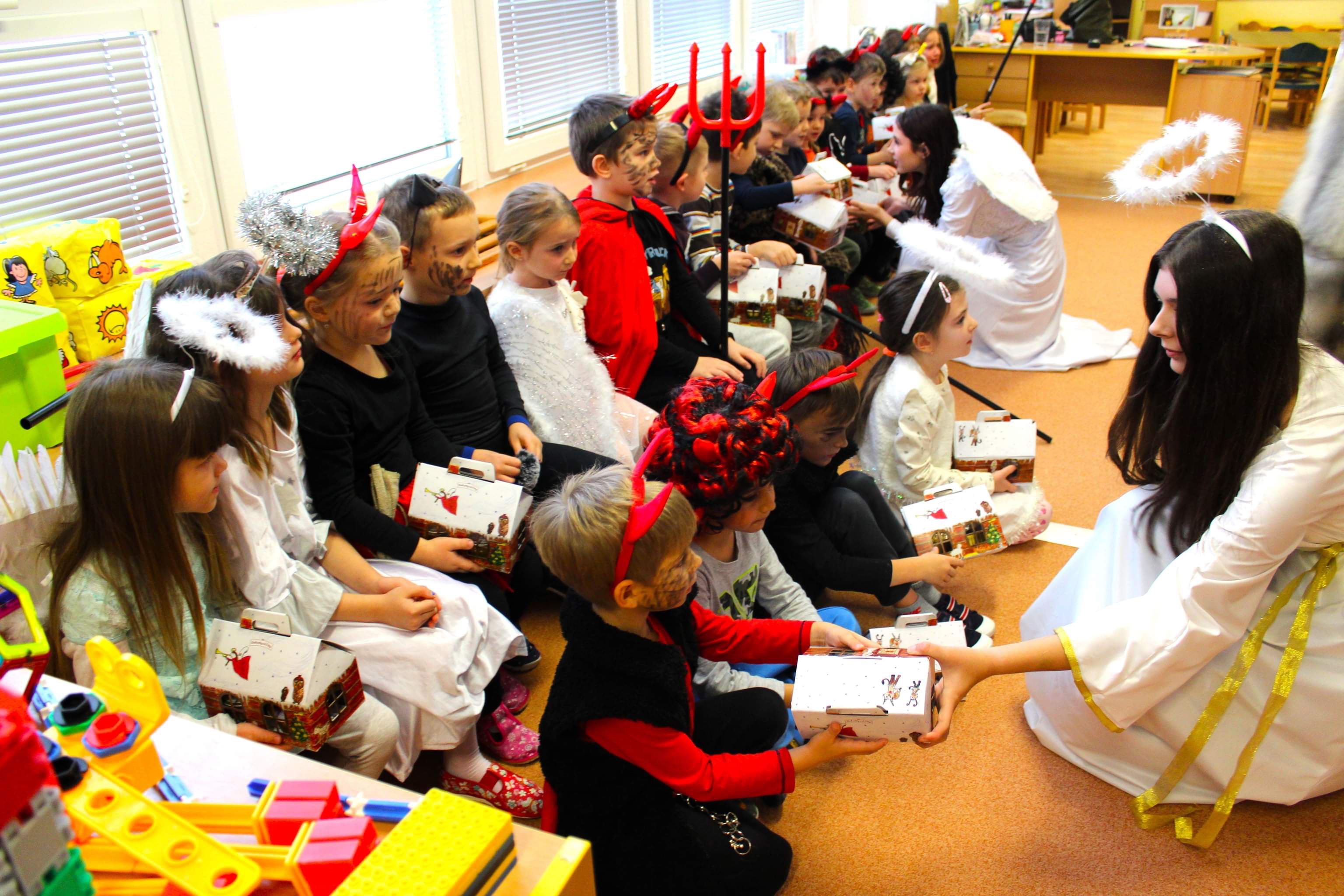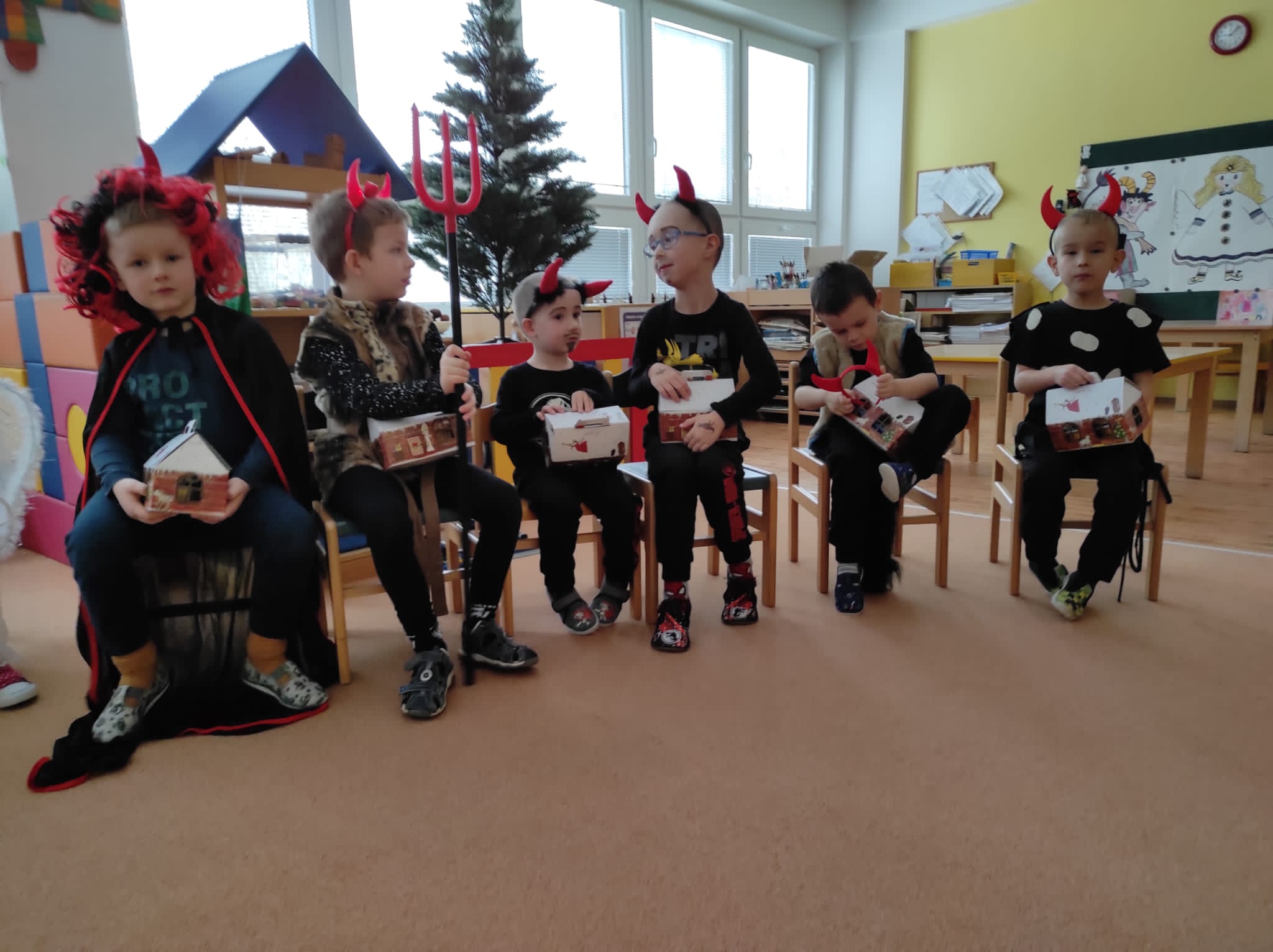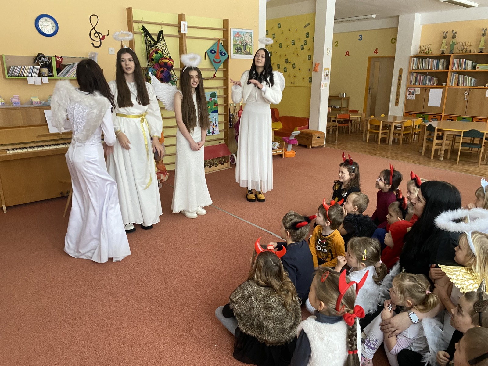 Minulý týden byl ve znamení čertů a andílků. Celý týden jsme si povídali o Mikuláši, hráli různé hry, pekli, zdobili stromeček a v úterý nás navštívil Mikuláš s čerty a anděly. Děti dostaly i mikulášskou nadílku.