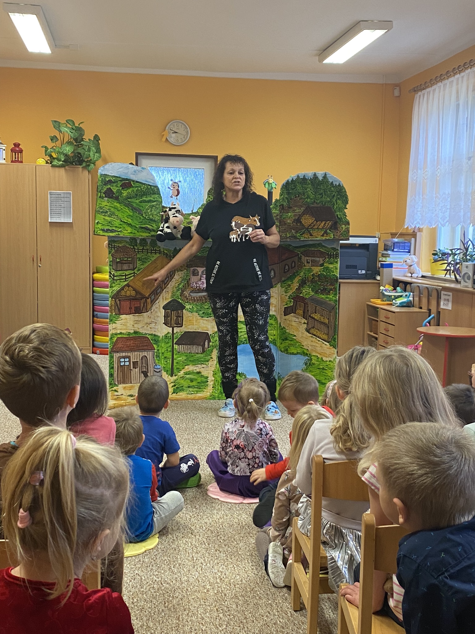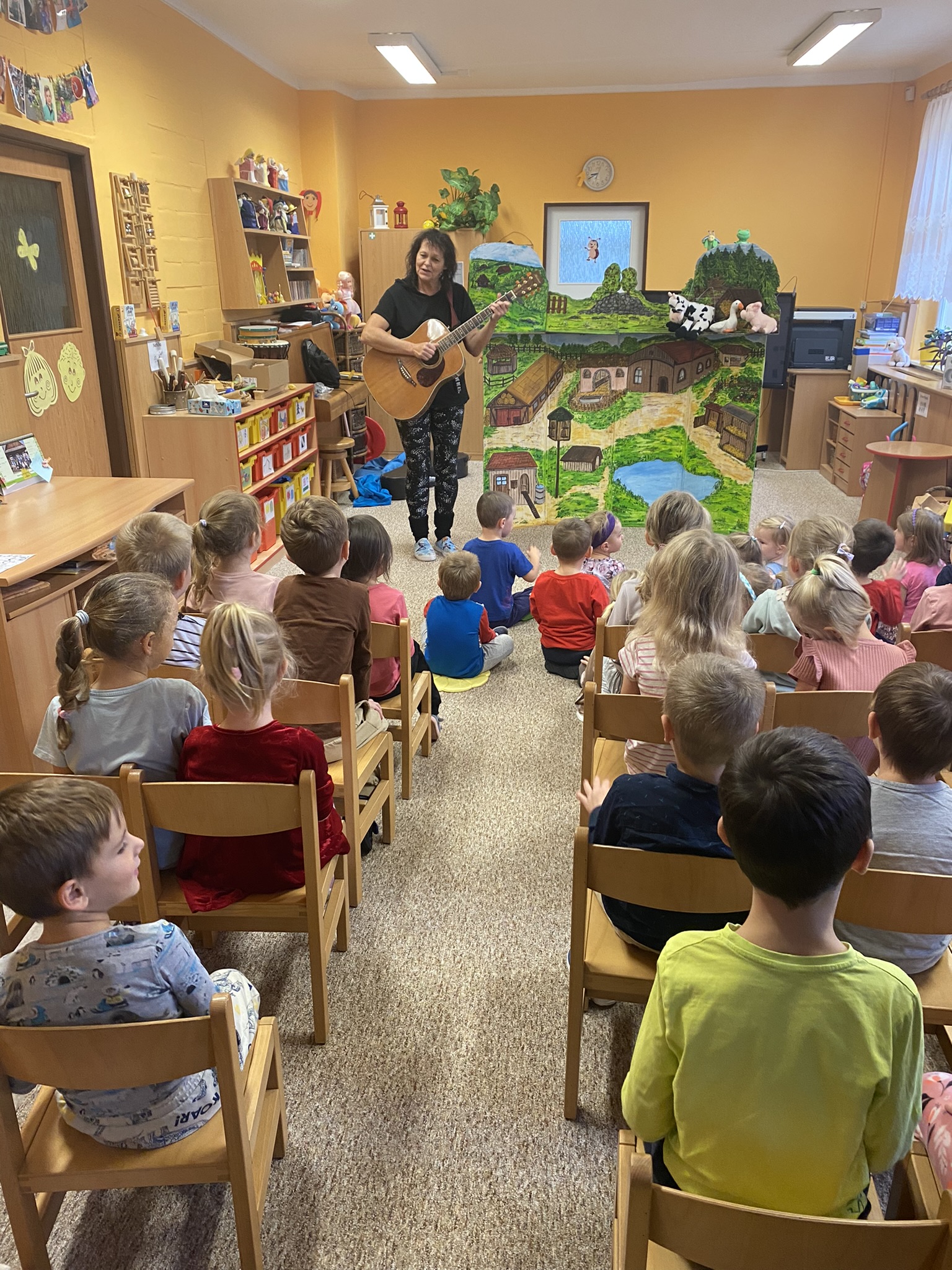 Děti si s paní divadelnicí zazpívaly s kytarou a zopakovaly si názvy členů rodiny domácích a hospodářských zvířátek.