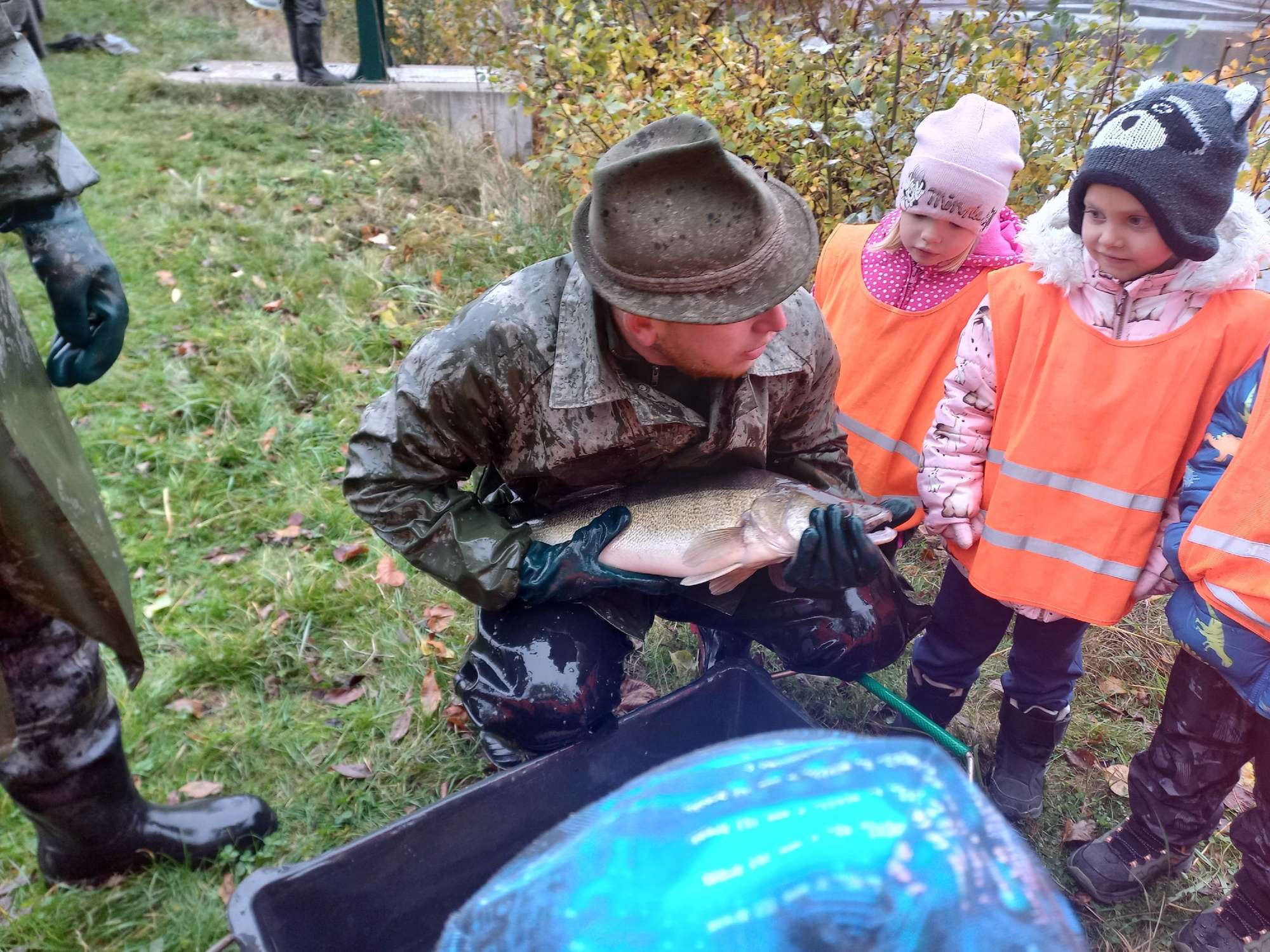 Rybáři dětem donesli v kádi ukázat raky a jiné ryby.