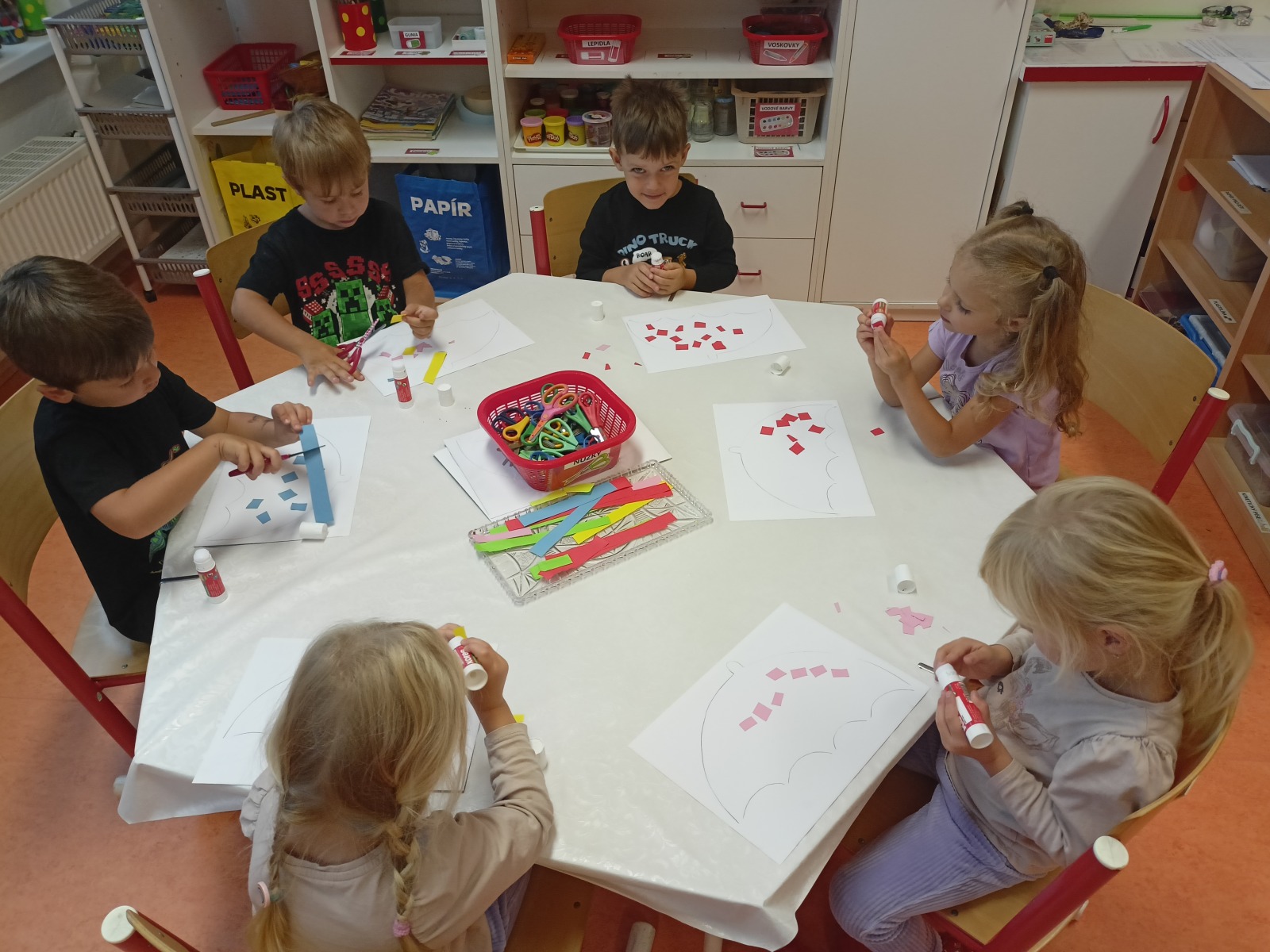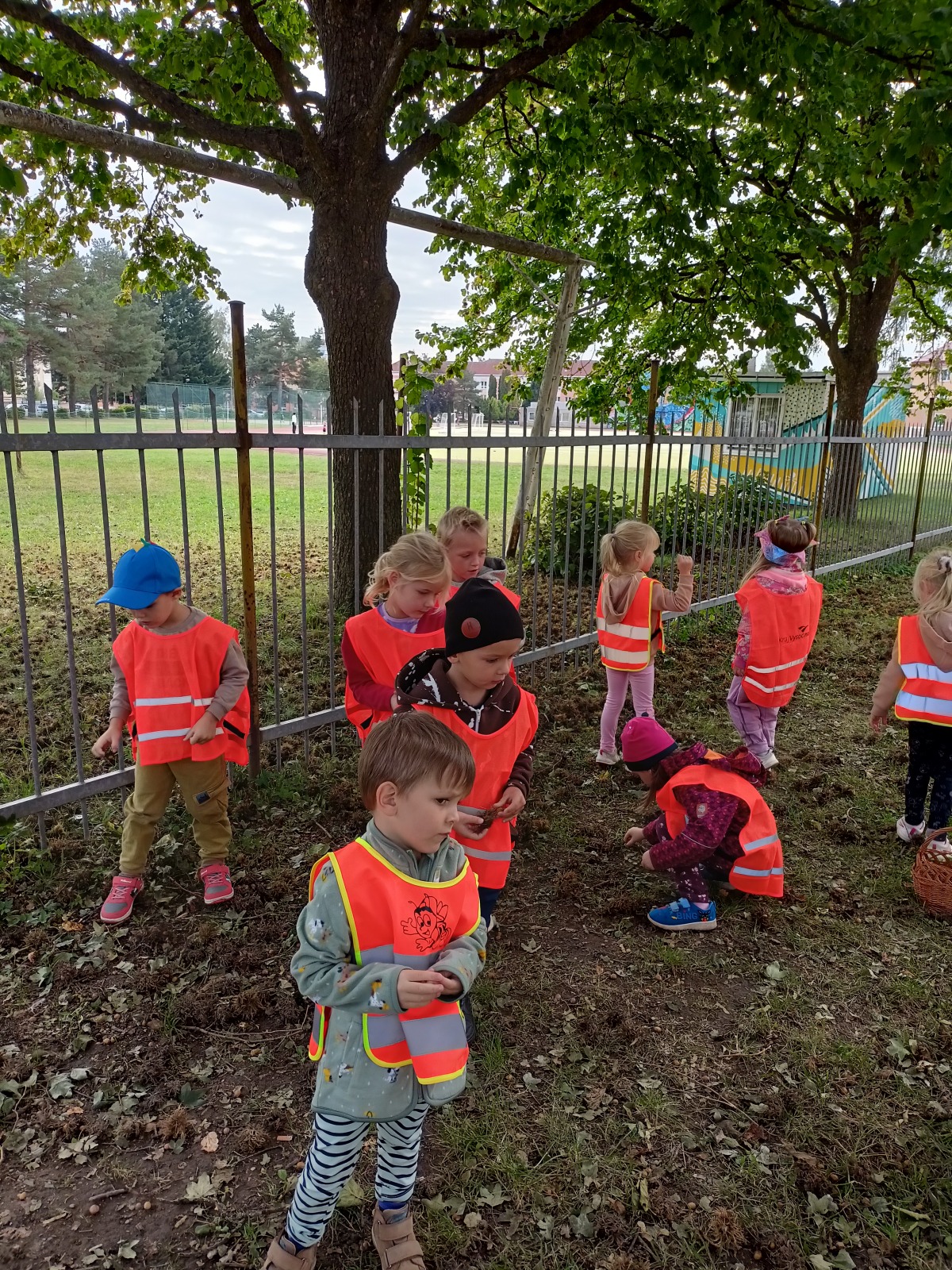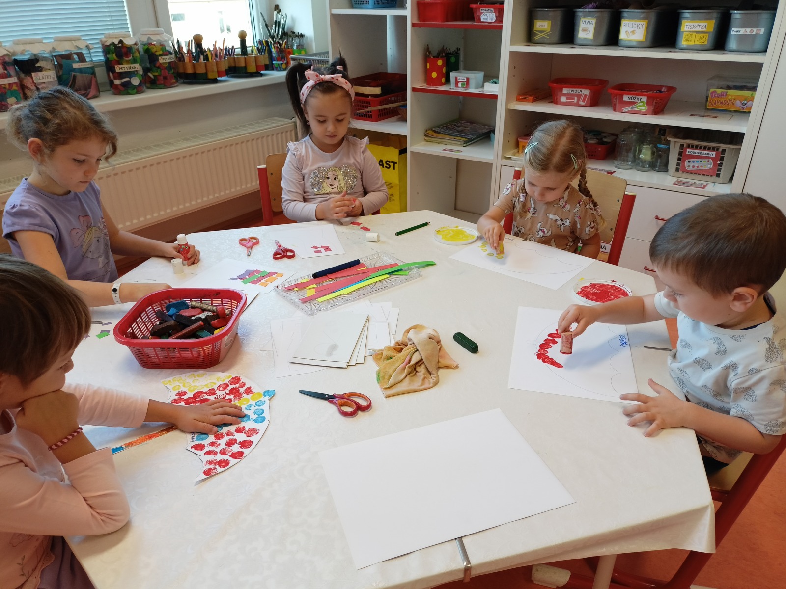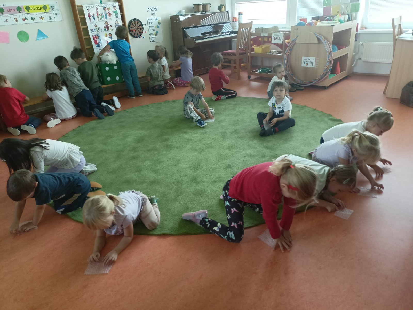 Tato říkanka provázela Vrabčáky celý týden. Děti procvičovaly jemnou motoriku ruky s využitím říkanky a různých zábavných cvičení (hra s kolíčky, práce s bublinkovou fólií, dotykové hry…), pojmenovávaly prsty a vymýšlely, co vše ruce dovedou . Společně si děti vyzkoušely nabídky v centrech aktivit – např. tupování deštníků, zdobení gumáků, šroubování víček a matiček, třídění hříbečků, poznávání hmatem, točení káči. Předškoláčci v pracovních listech poznávali tvary. Na vycházce jsme společně posbírali spadané oříšky, které určitě využijeme při podzimním tvoření .