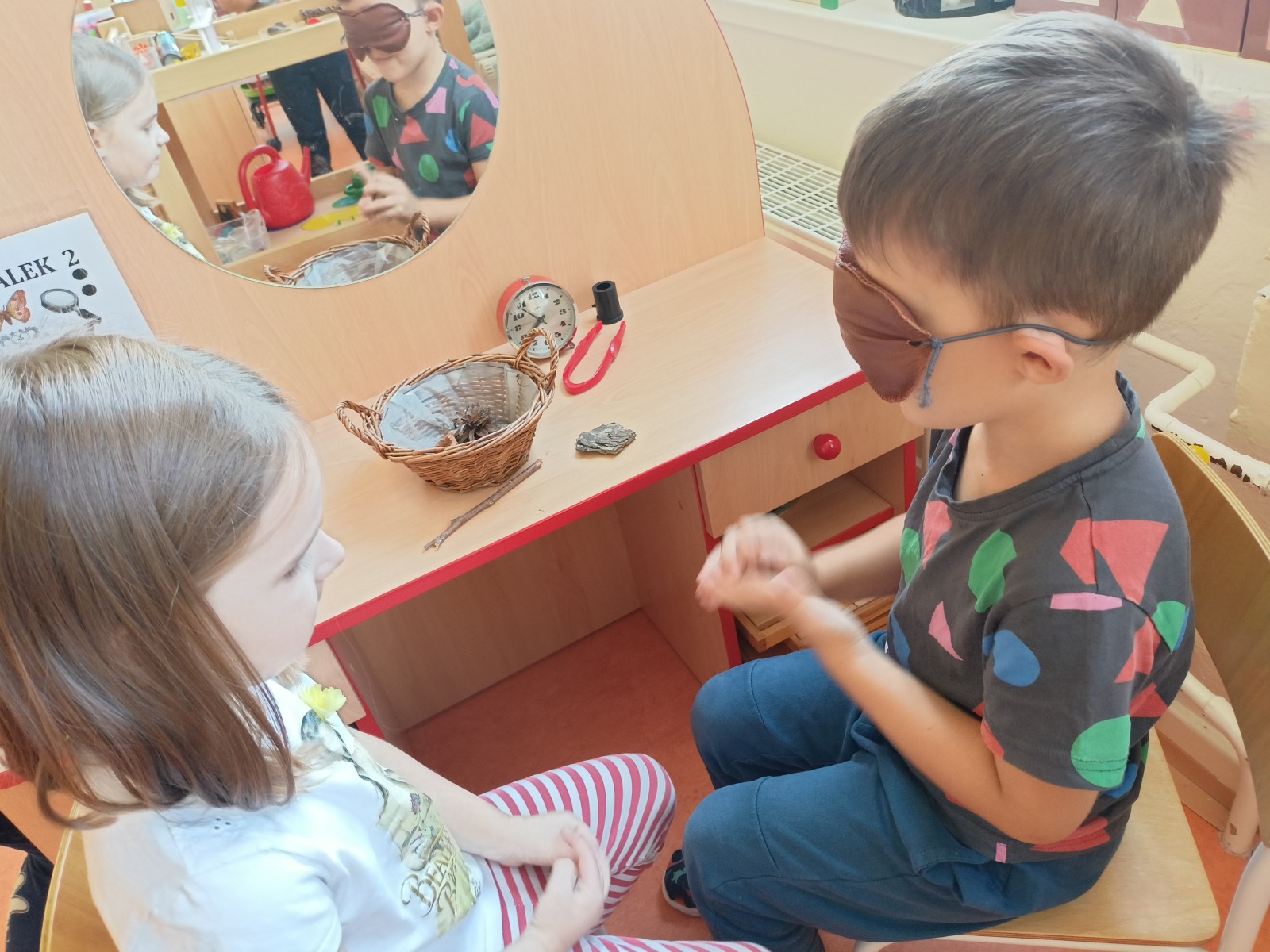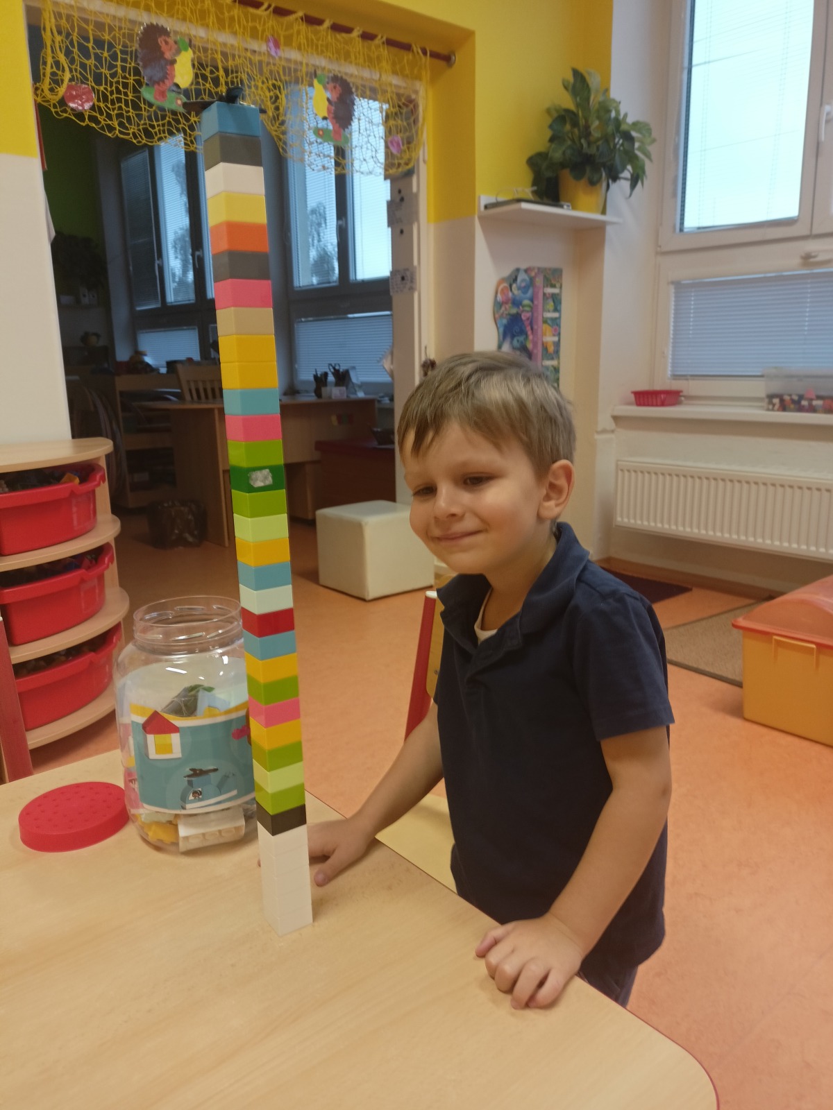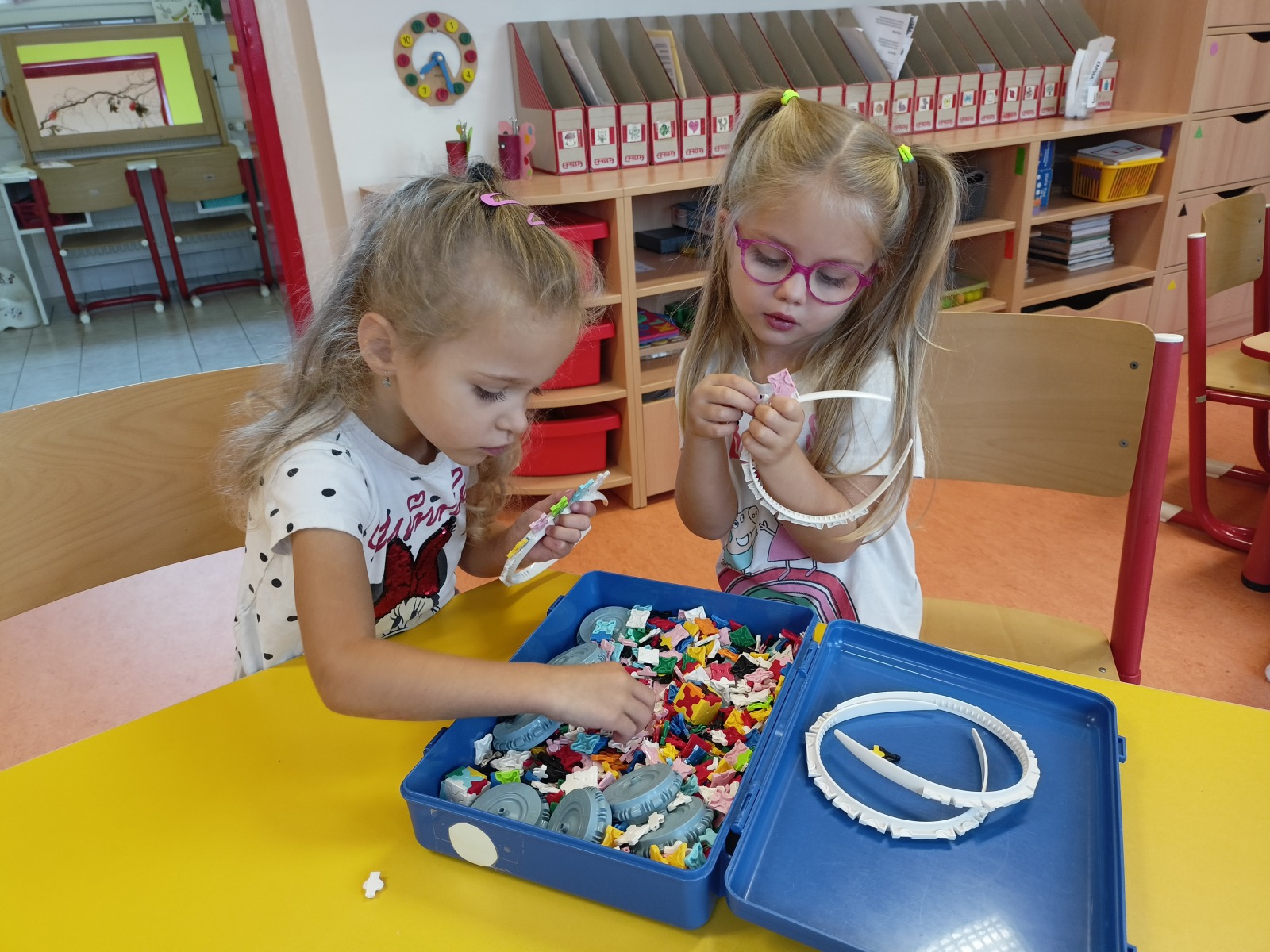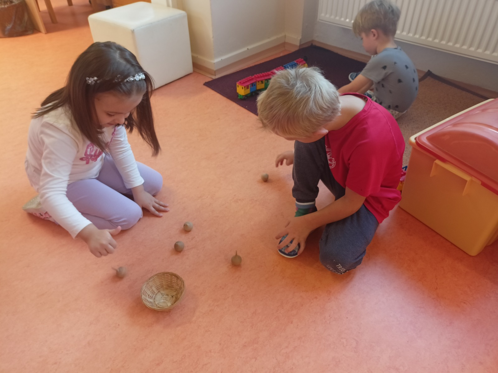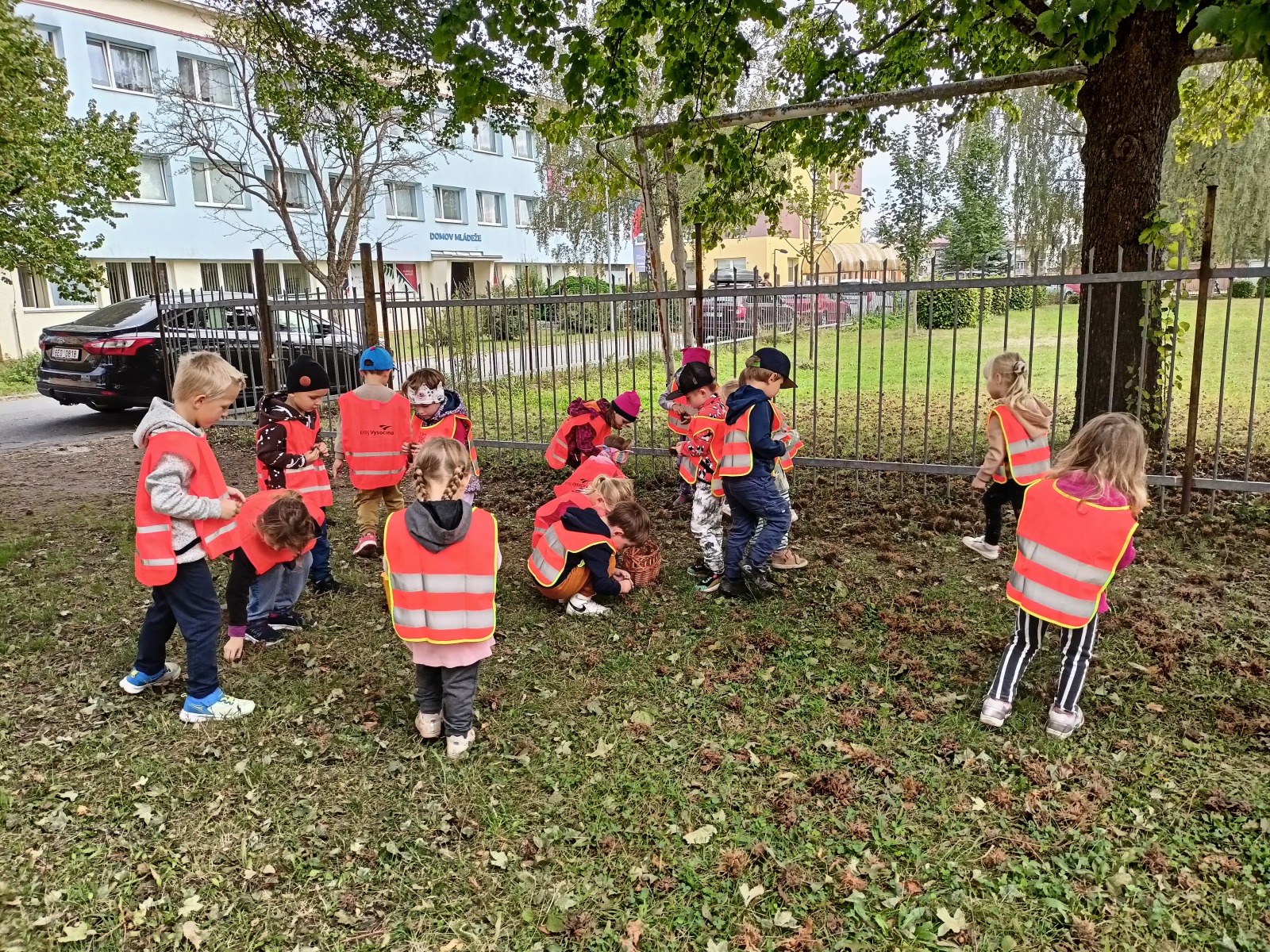 Tato říkanka provázela Vrabčáky celý týden. Děti procvičovaly jemnou motoriku ruky s využitím říkanky a různých zábavných cvičení (hra s kolíčky, práce s bublinkovou fólií, dotykové hry…), pojmenovávaly prsty a vymýšlely, co vše ruce dovedou . Společně si děti vyzkoušely nabídky v centrech aktivit – např. tupování deštníků, zdobení gumáků, šroubování víček a matiček, třídění hříbečků, poznávání hmatem, točení káči. Předškoláčci v pracovních listech poznávali tvary. Na vycházce jsme společně posbírali spadané oříšky, které určitě využijeme při podzimním tvoření .