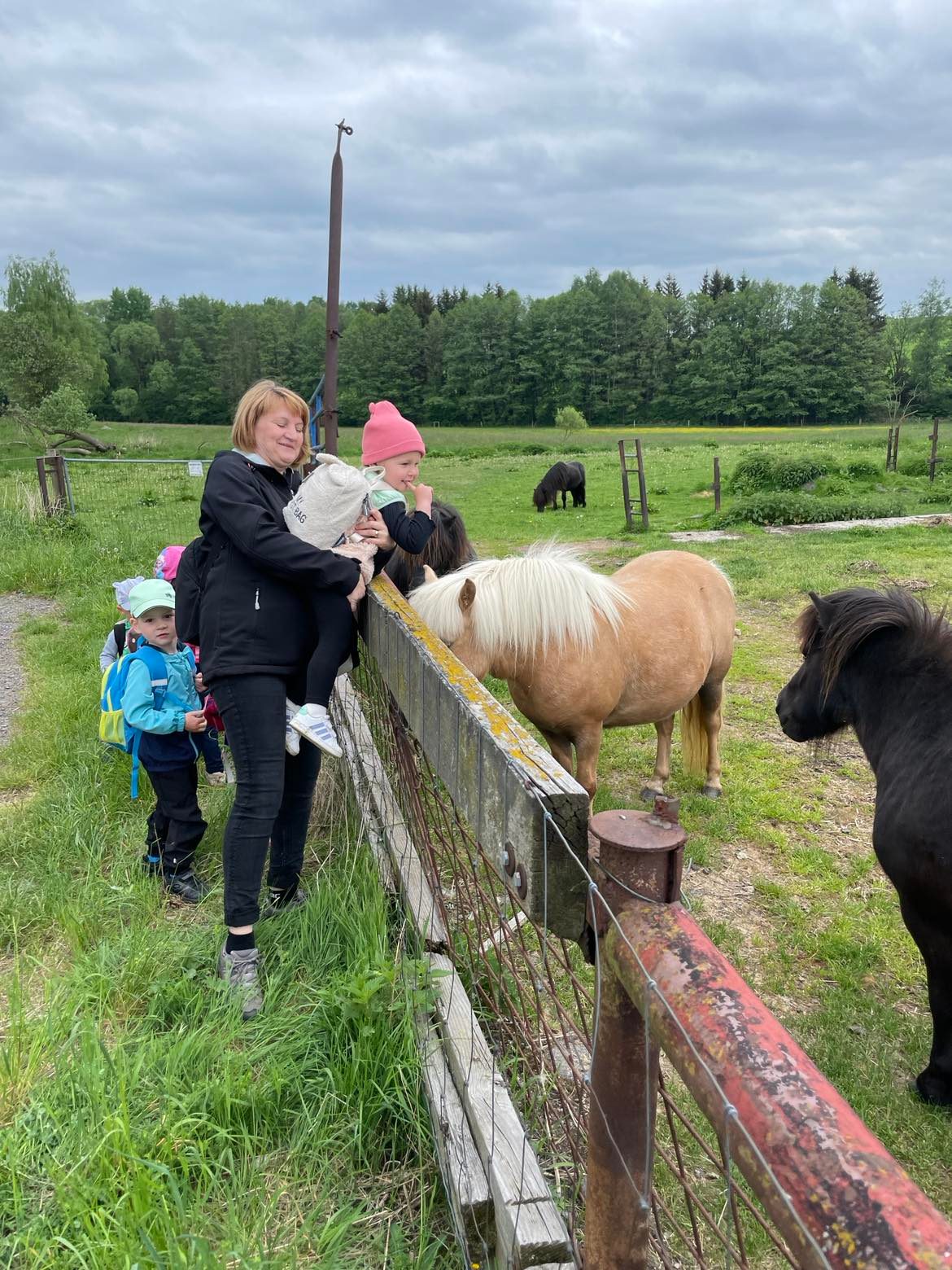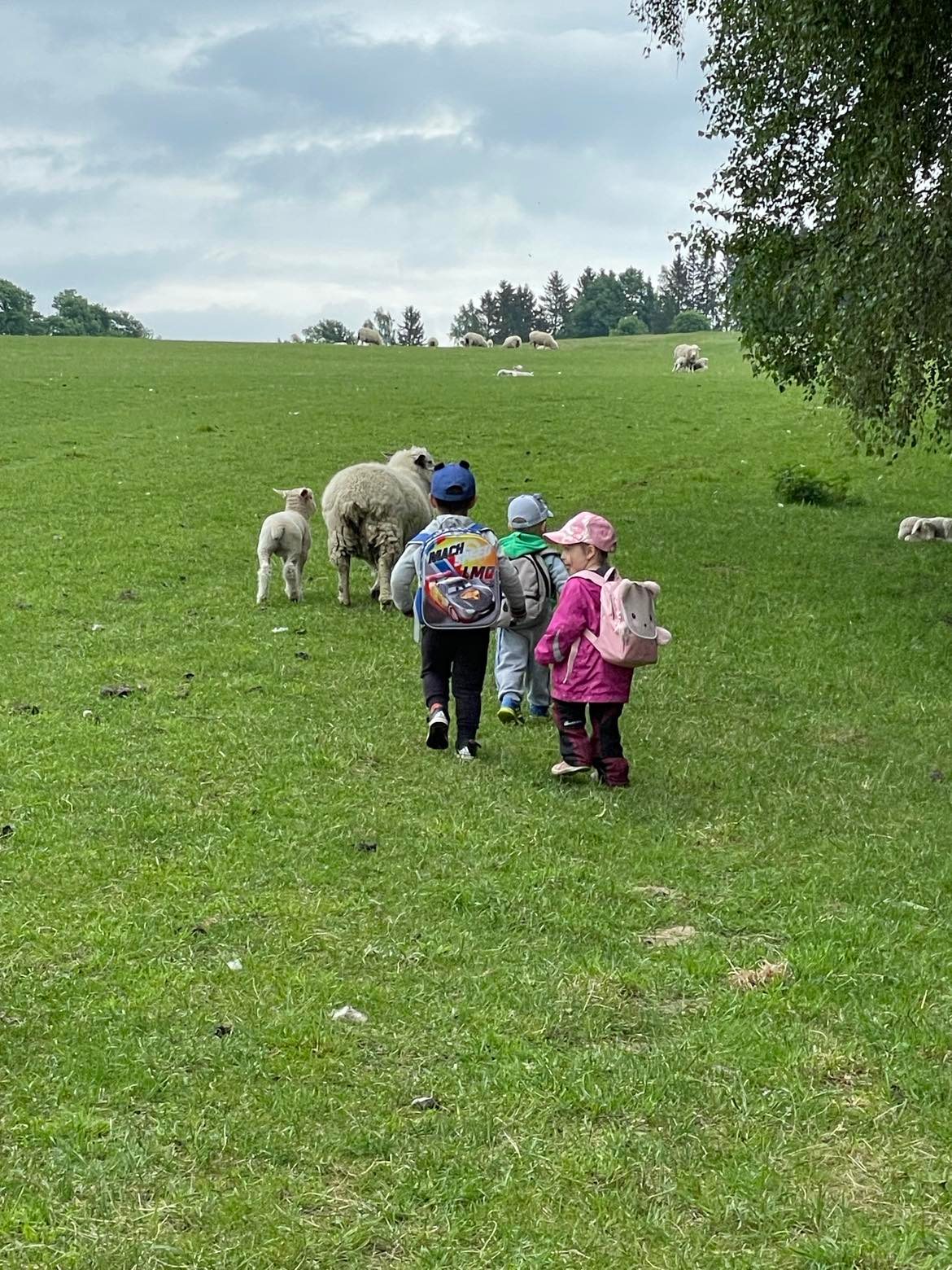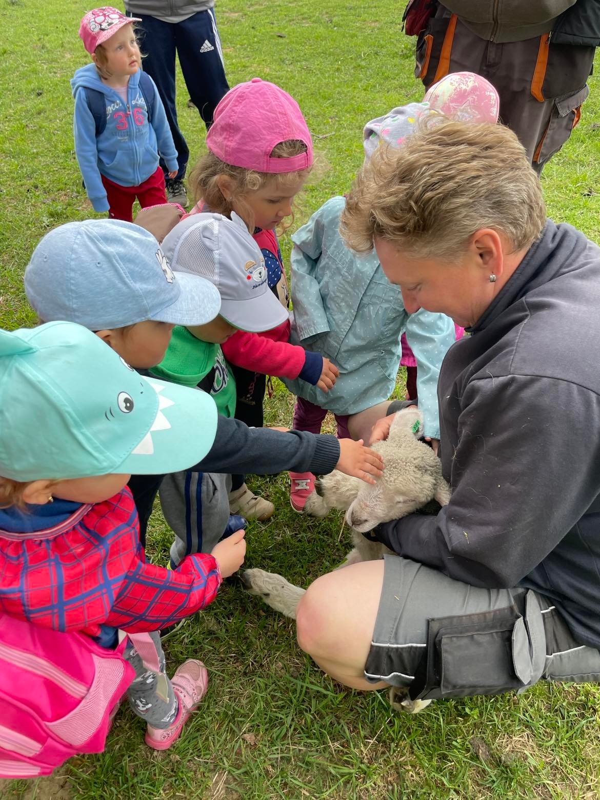 Na pastvině Sdružení Krajina děti hladily jehňátka, svezly se na ponících, viděly, jak se krmí jehňátka.
