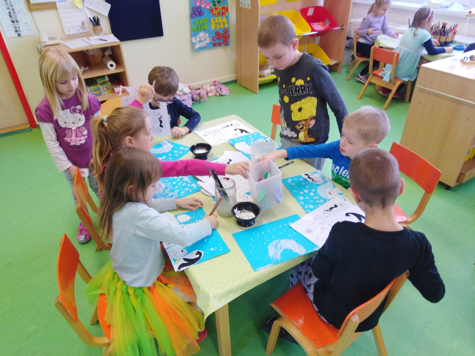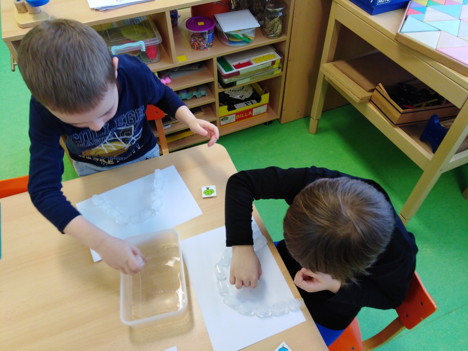 Děti hrály pohybovou hru: „Na tající kru“, kde procvičovaly reakci na smluvený signál a také pracovaly v centrech aktivit. V Kutílkovi zkoušely pokusy s vodou – stavěly iglú z ledových kostek, pozorovaly tání ledu a využily kostky cukru k stavění eskymáckých domečků.