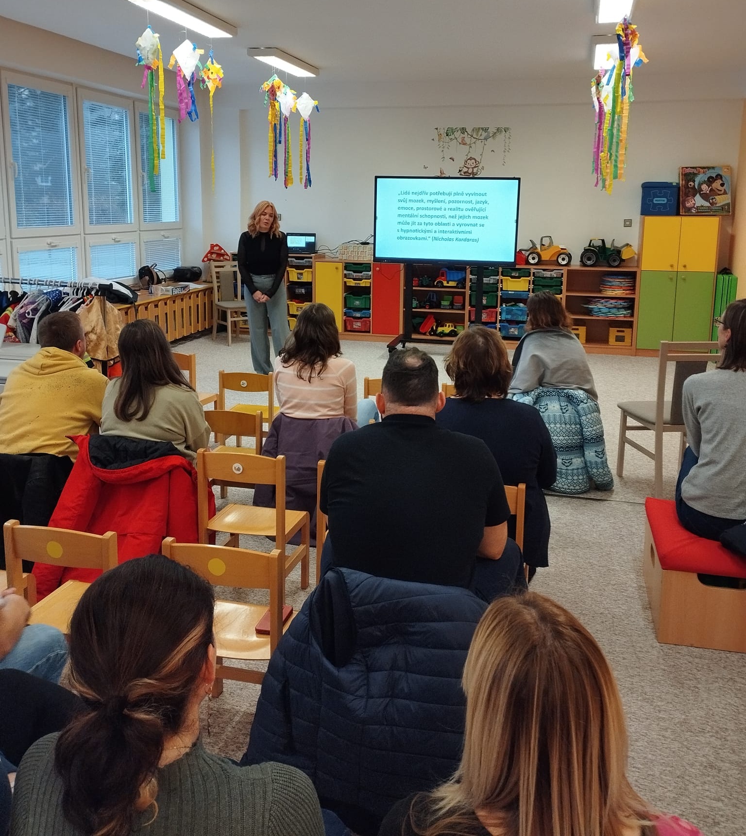 Paní psycholožka všem přítomným předala informace o vlivu digitálních technologií na dospělé, dospívající a na děti. Posluchači se dozvěděli praktické tipy jak předcházet závislosti na digitálních technologiích, jak nastavit pravidla při jejich používání pro své děti a spousty dalších užitečných rad.