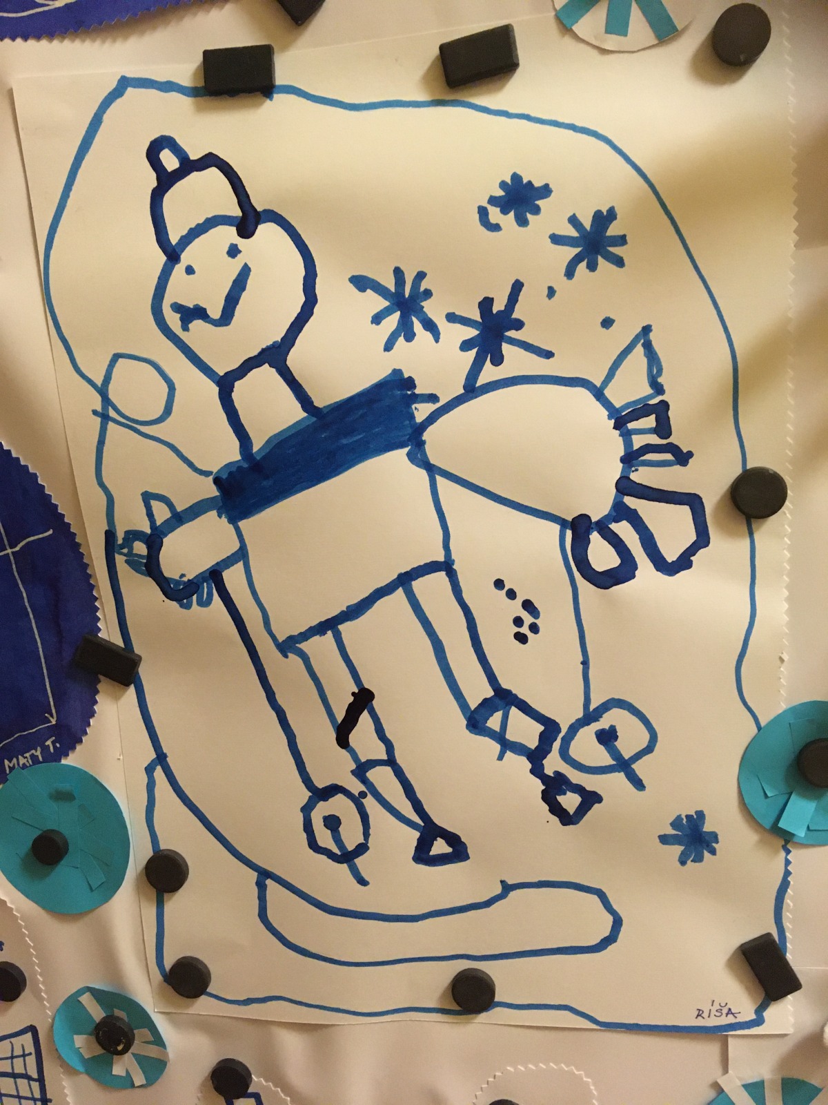 Zimní sporty se pokusily také výtvarně ztvárnit s využitím modré tuše a zmizíku.