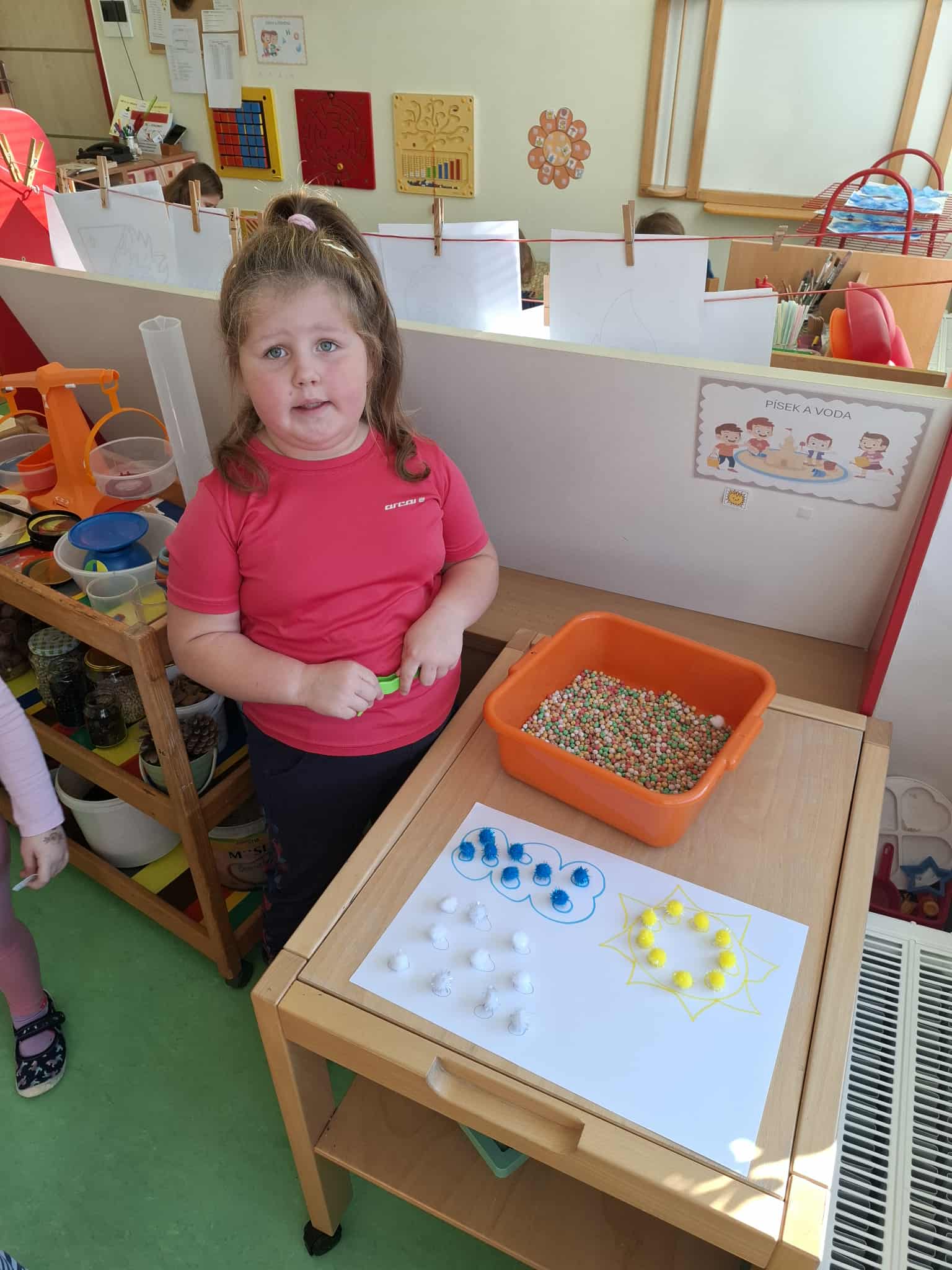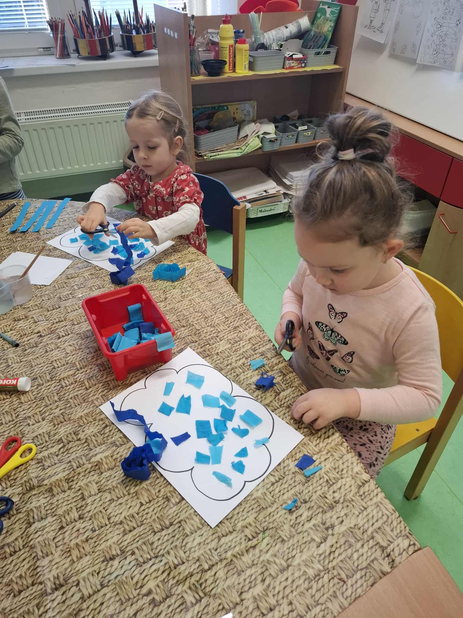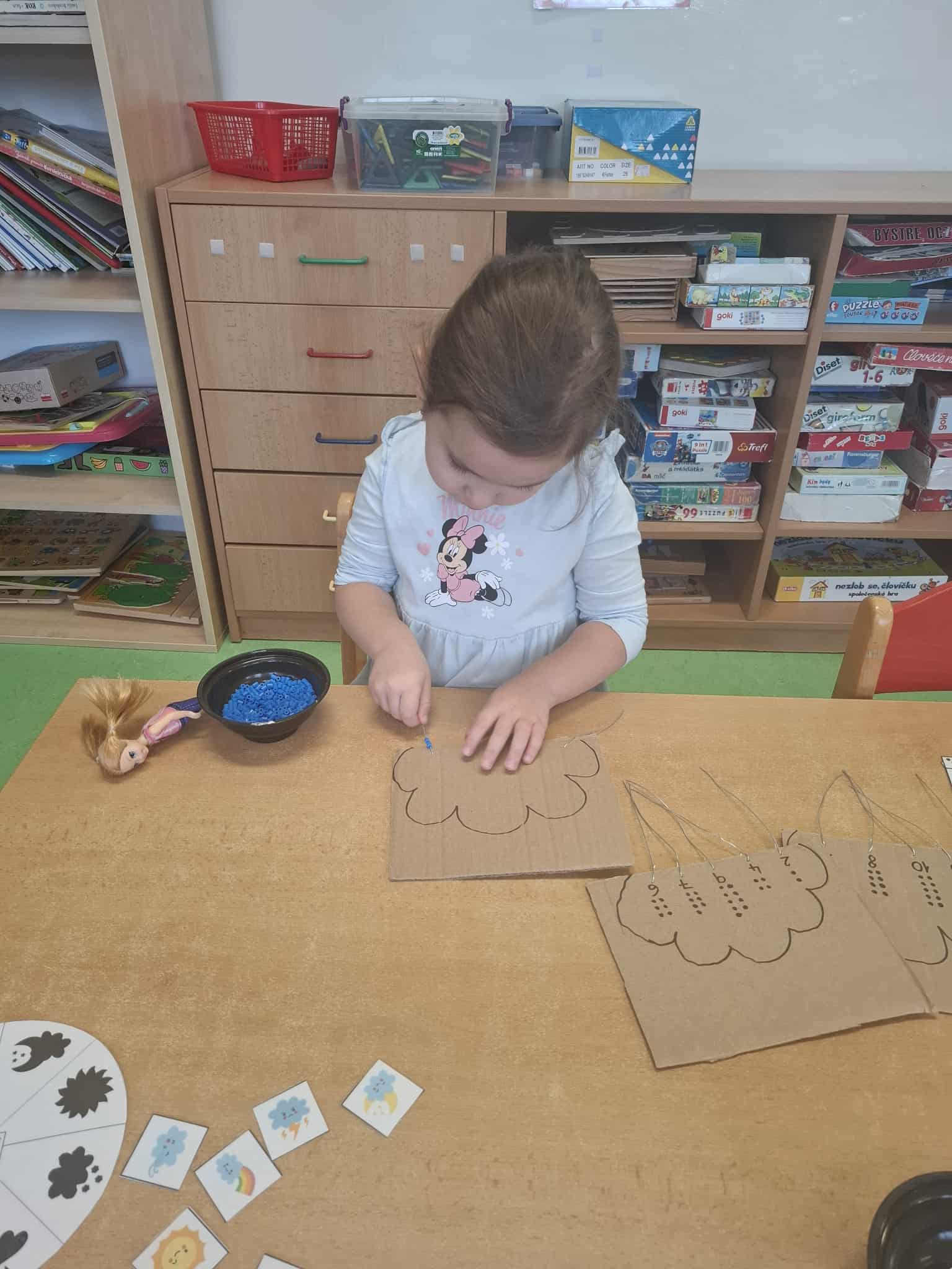 V centru Pokusy a objevy vyráběly vlastní mraky, v Ateliéru tvořily kapky deště. Jemnou motoriku si procvičovaly v Manipulačních a stolních hrách, kde navlékaly dešťové kapky na mrak.