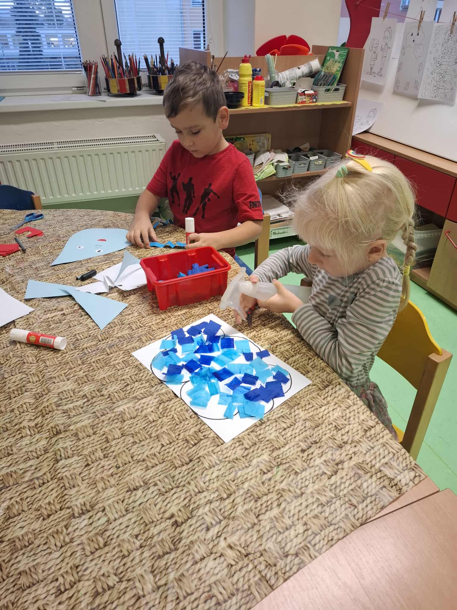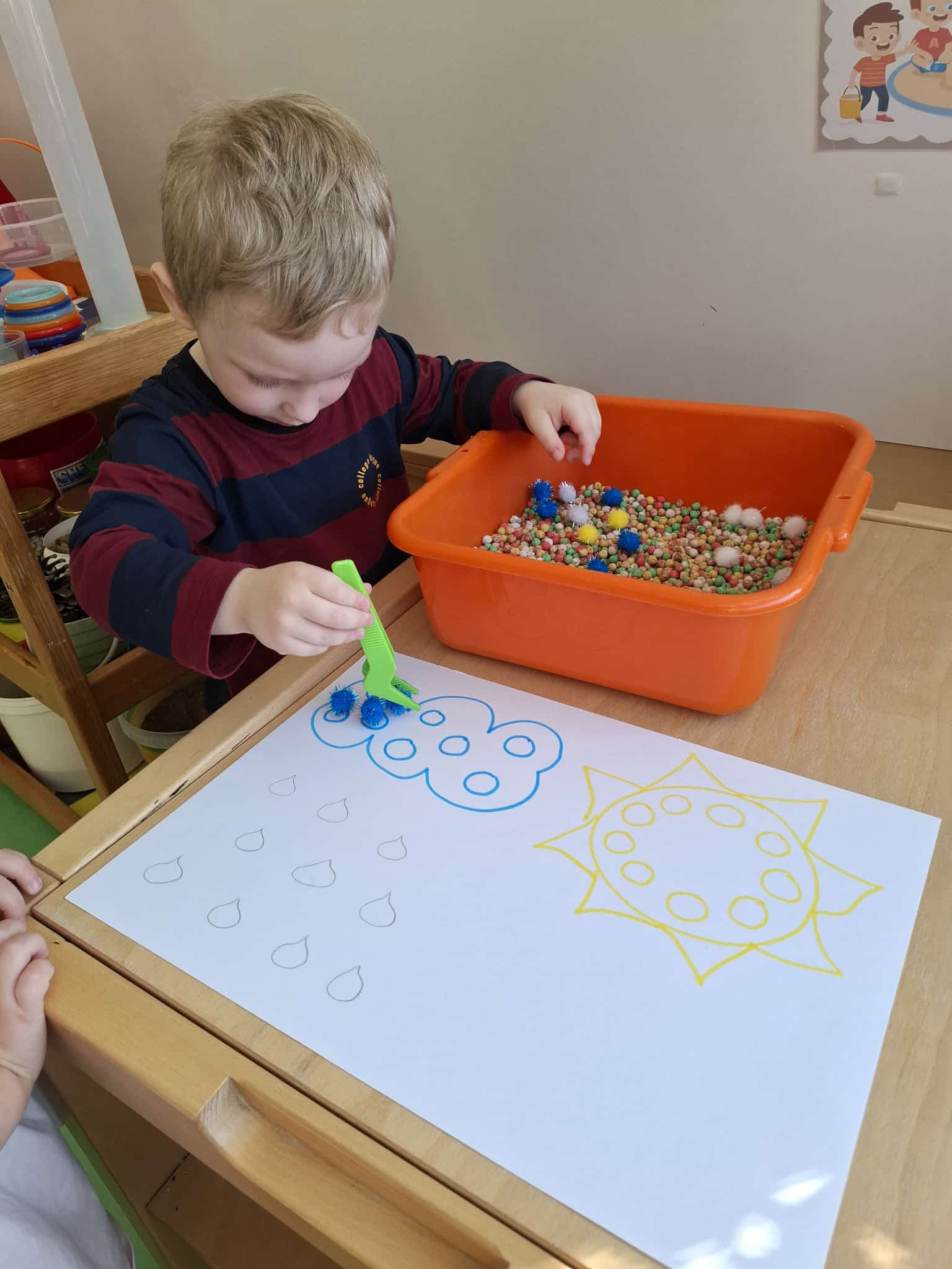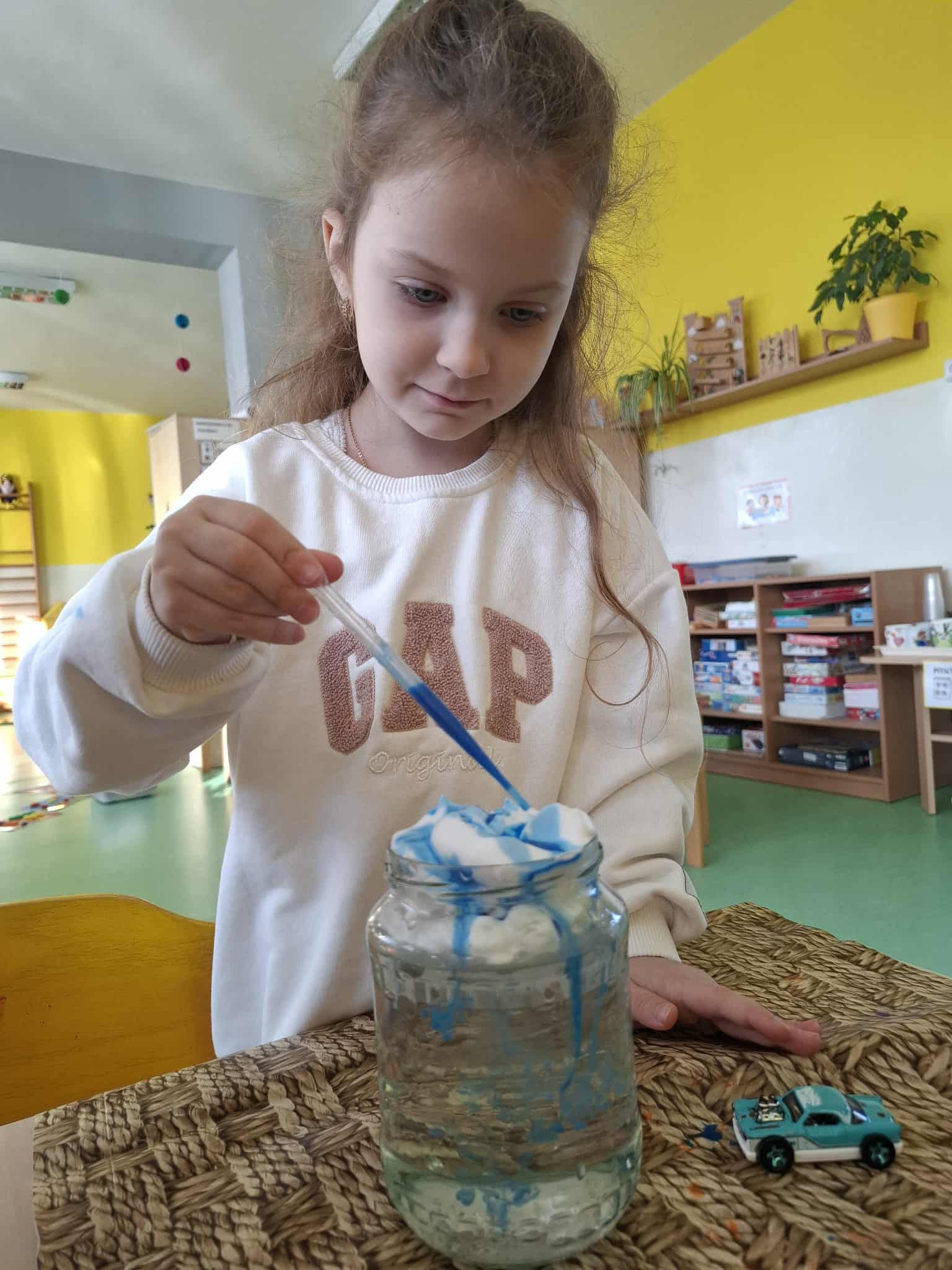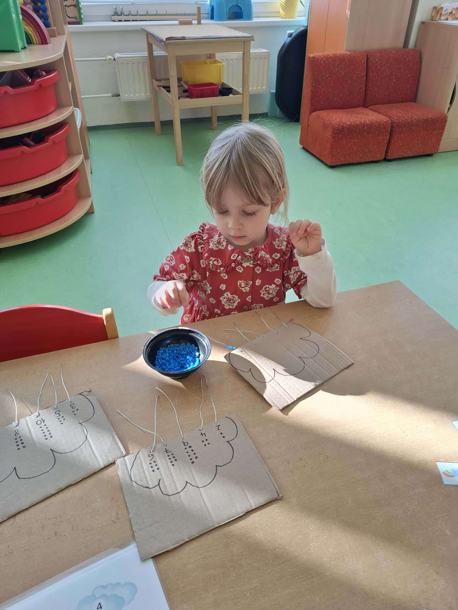 V centru Pokusy a objevy vyráběly vlastní mraky, v Ateliéru tvořily kapky deště. Jemnou motoriku si procvičovaly v Manipulačních a stolních hrách, kde navlékaly dešťové kapky na mrak.