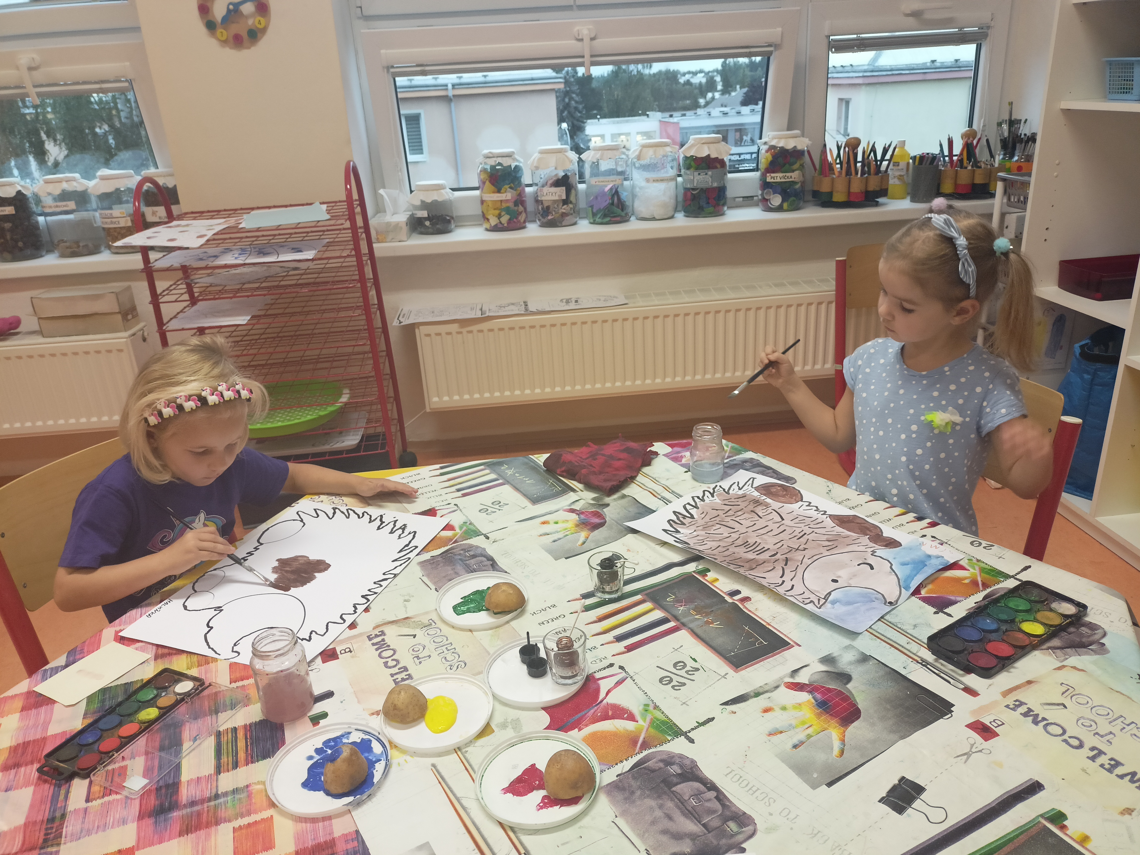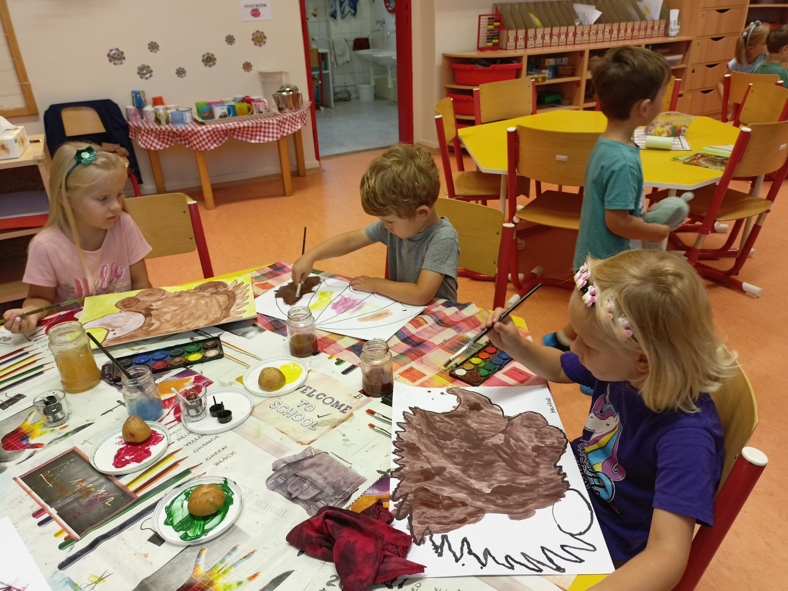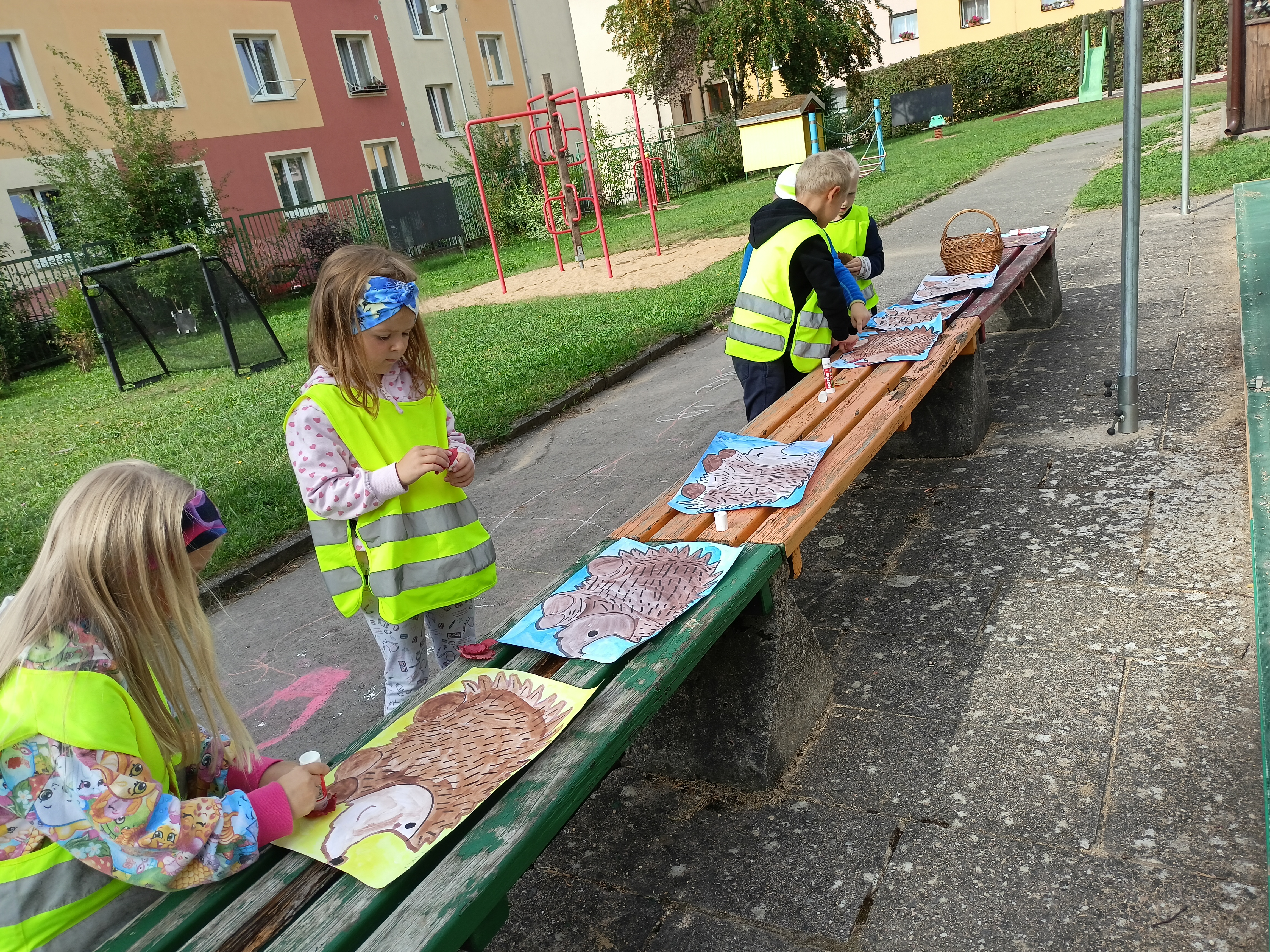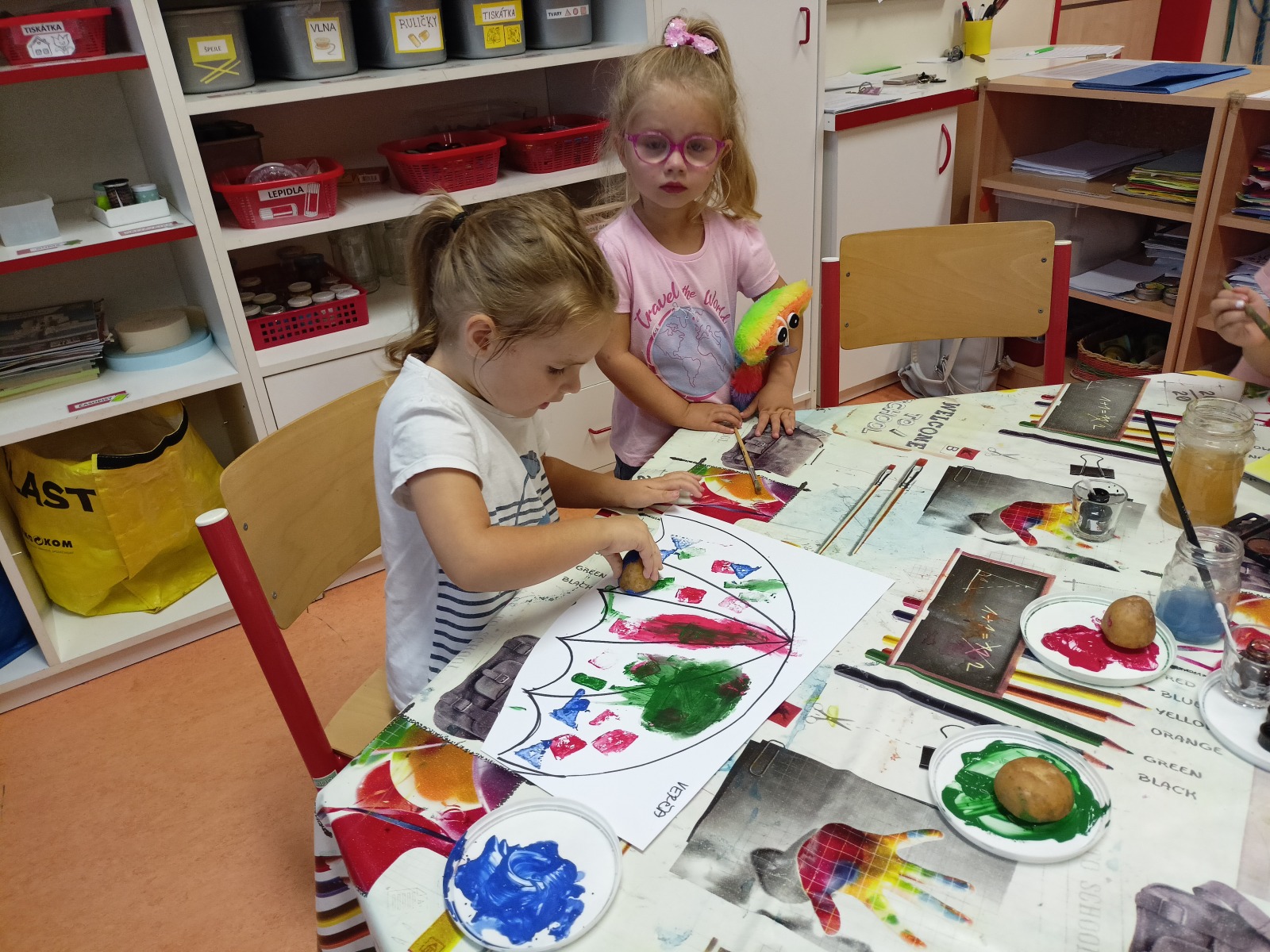 BARVIČKA – mladší děti tupovaly bramb. tiskátky deštníky, starší obkreslovaly tvar ježka, cvičily čáry (bodliny), malovaly barvou.