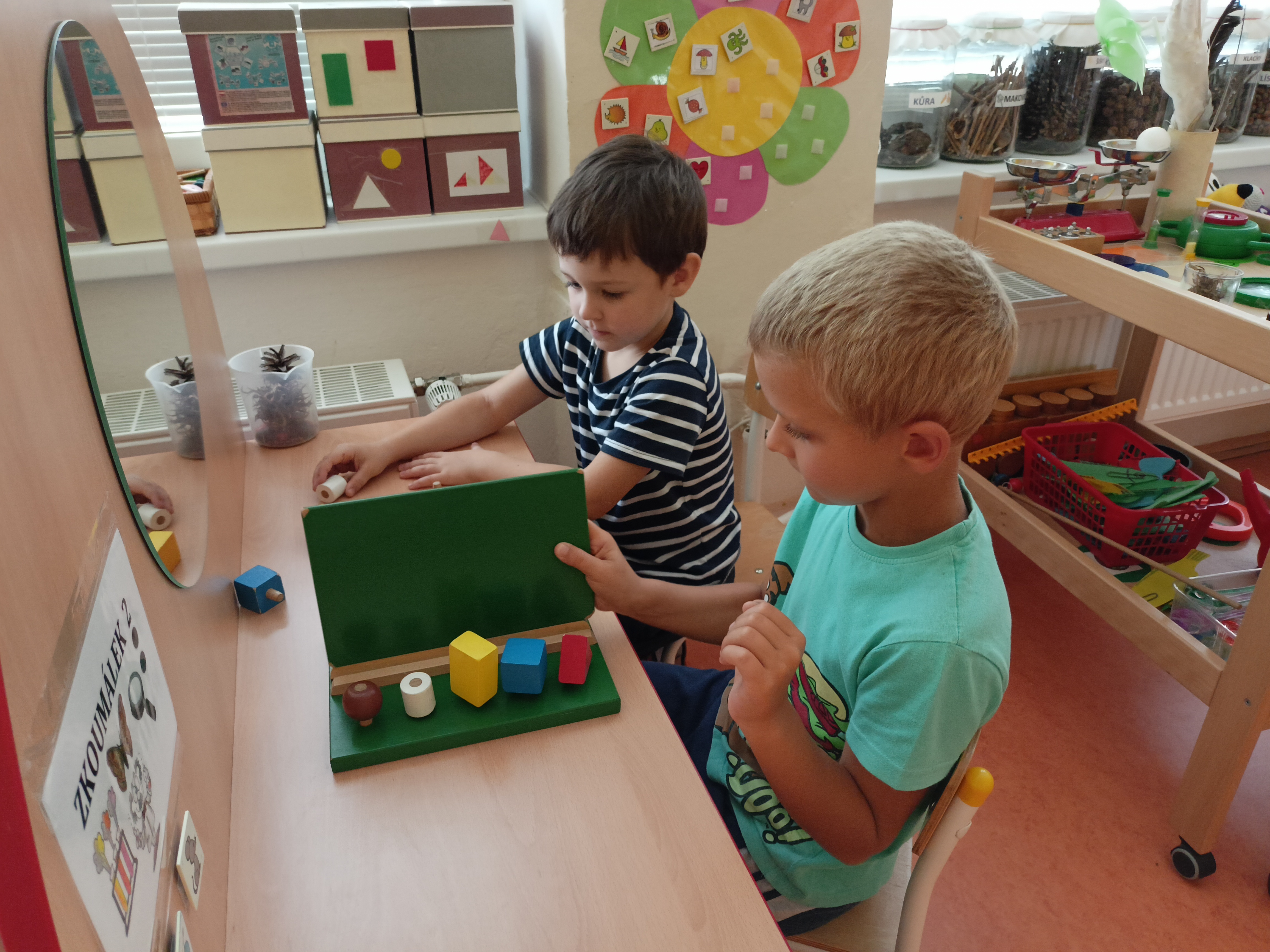 ZKOUMÁLEK – děti poznávaly podle hmatu přírodniny a cvičily paměť při hře s tvary.