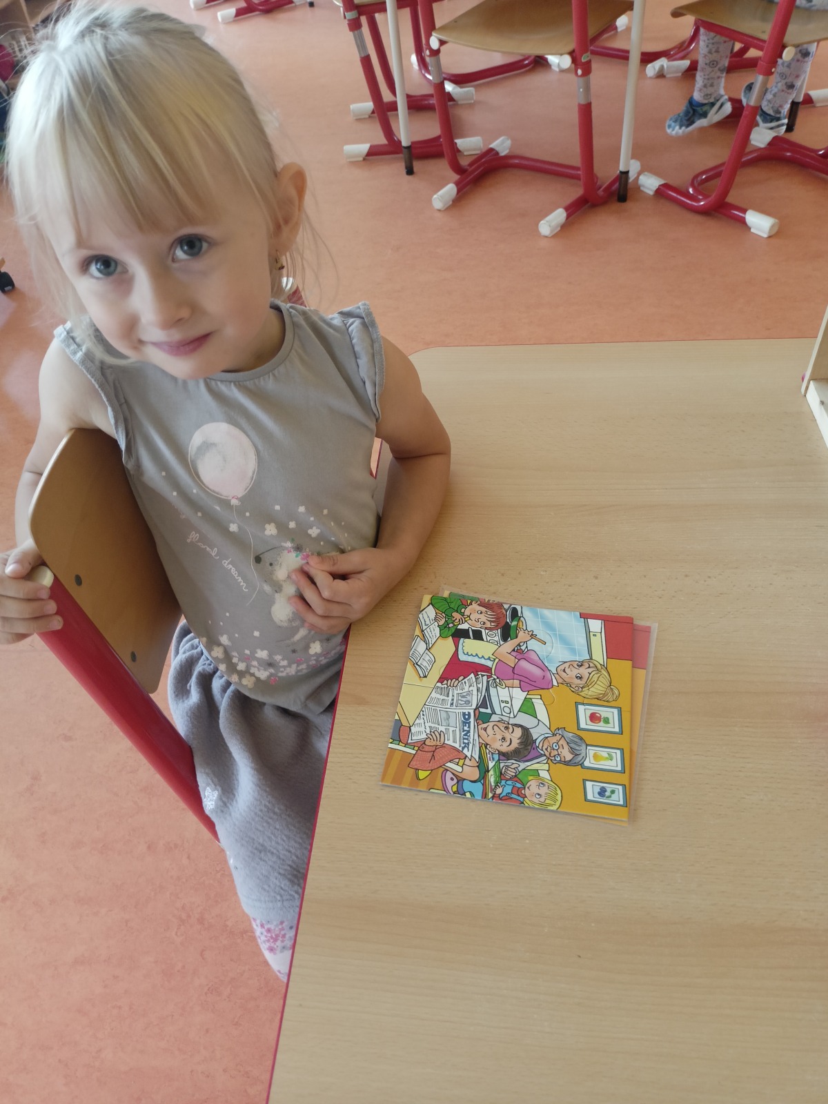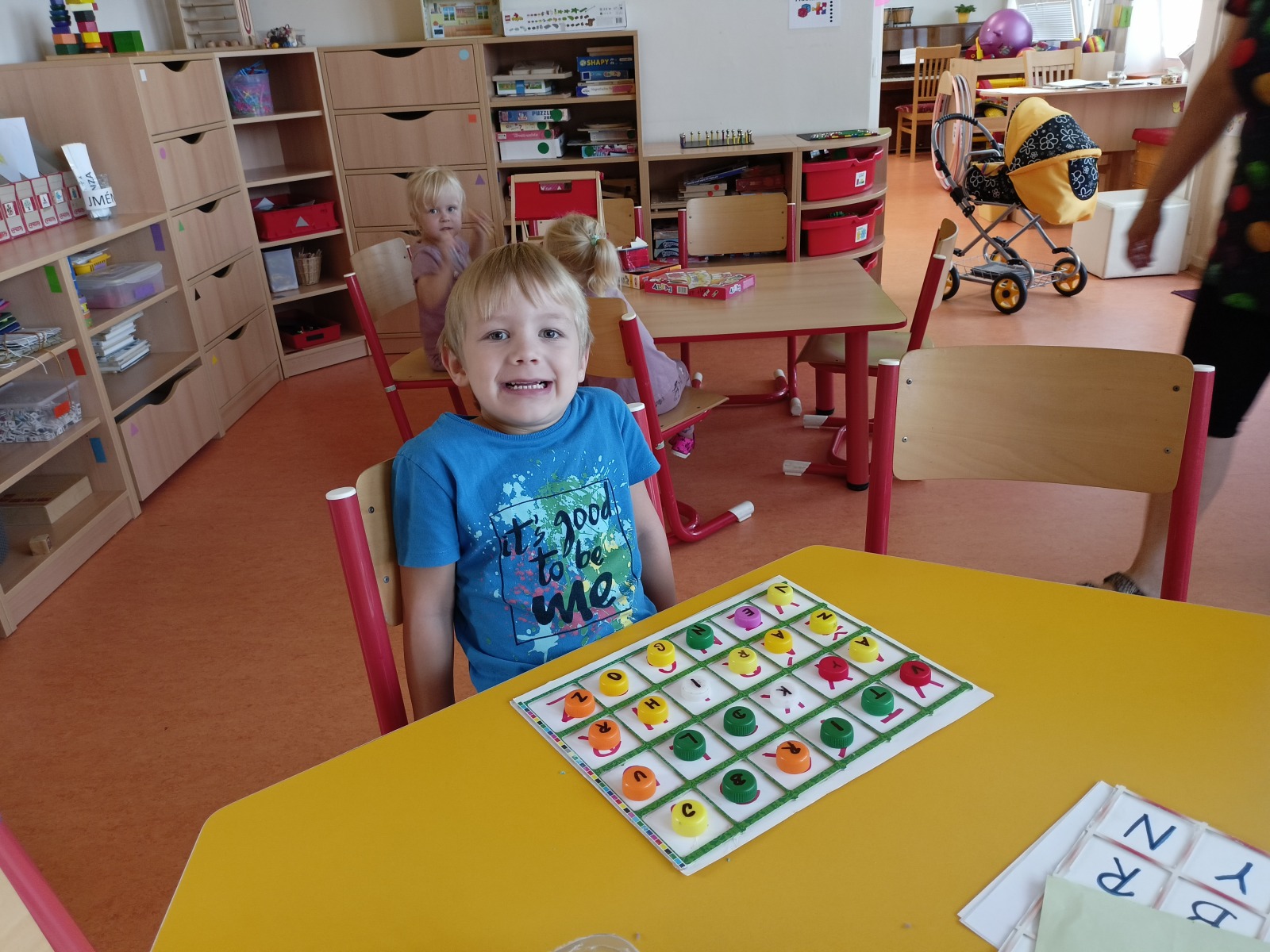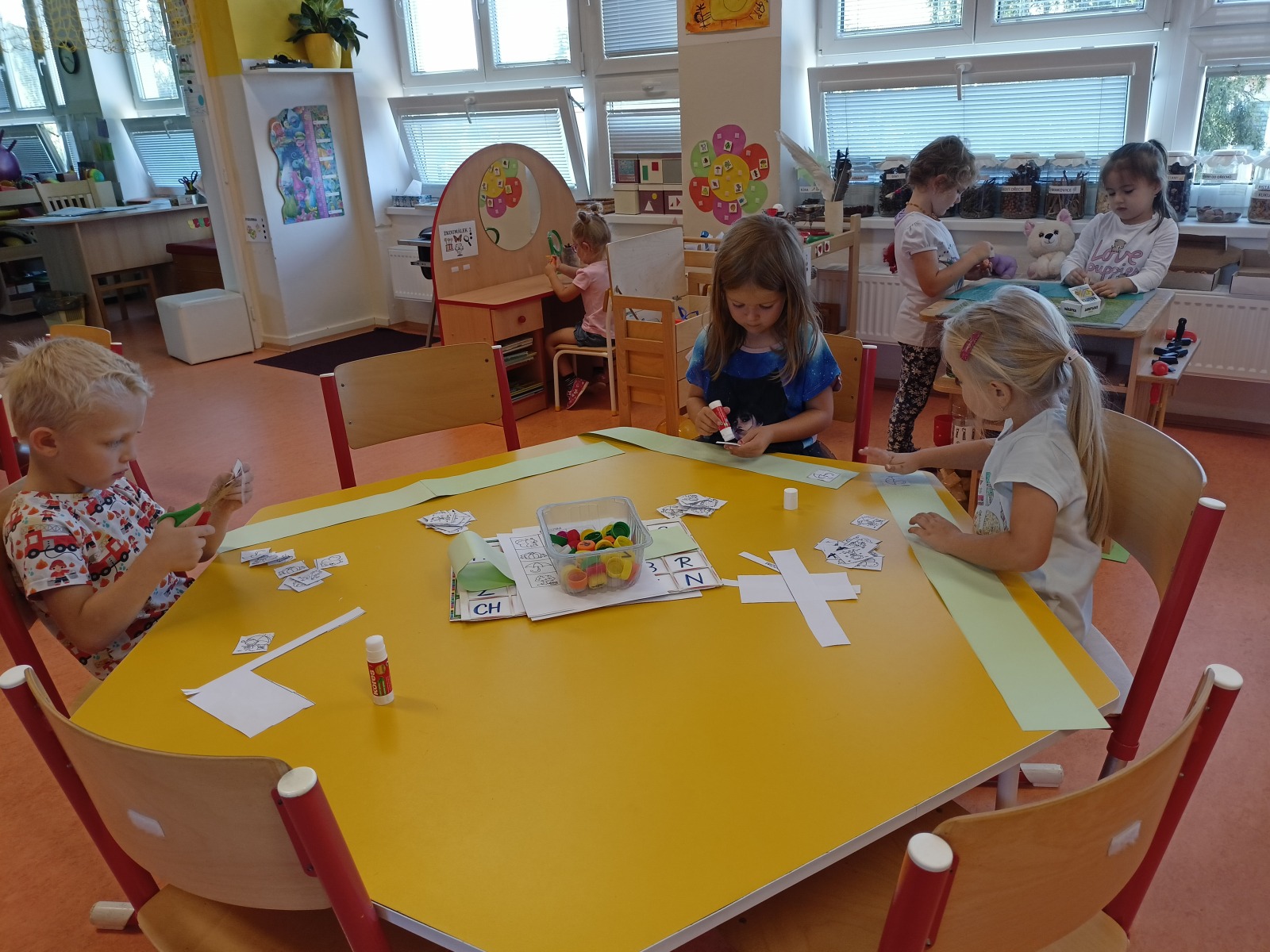 ŠKOLIČKA - předškoláčci cvičili zrakové vnímání poznáváním písmenek, stříhali obrázky a doplňovali puntíky podle počtu slabik – vytleskávání.