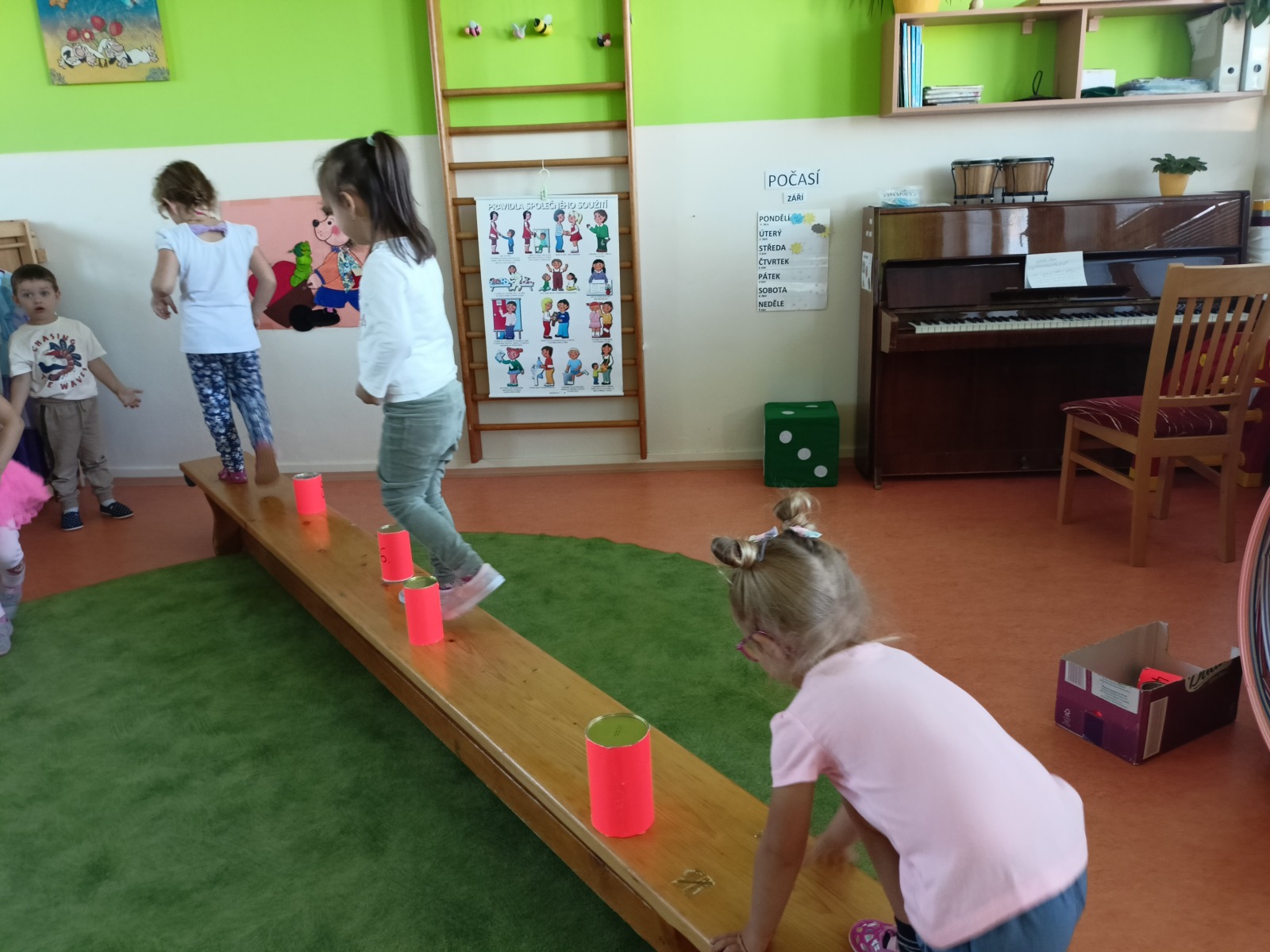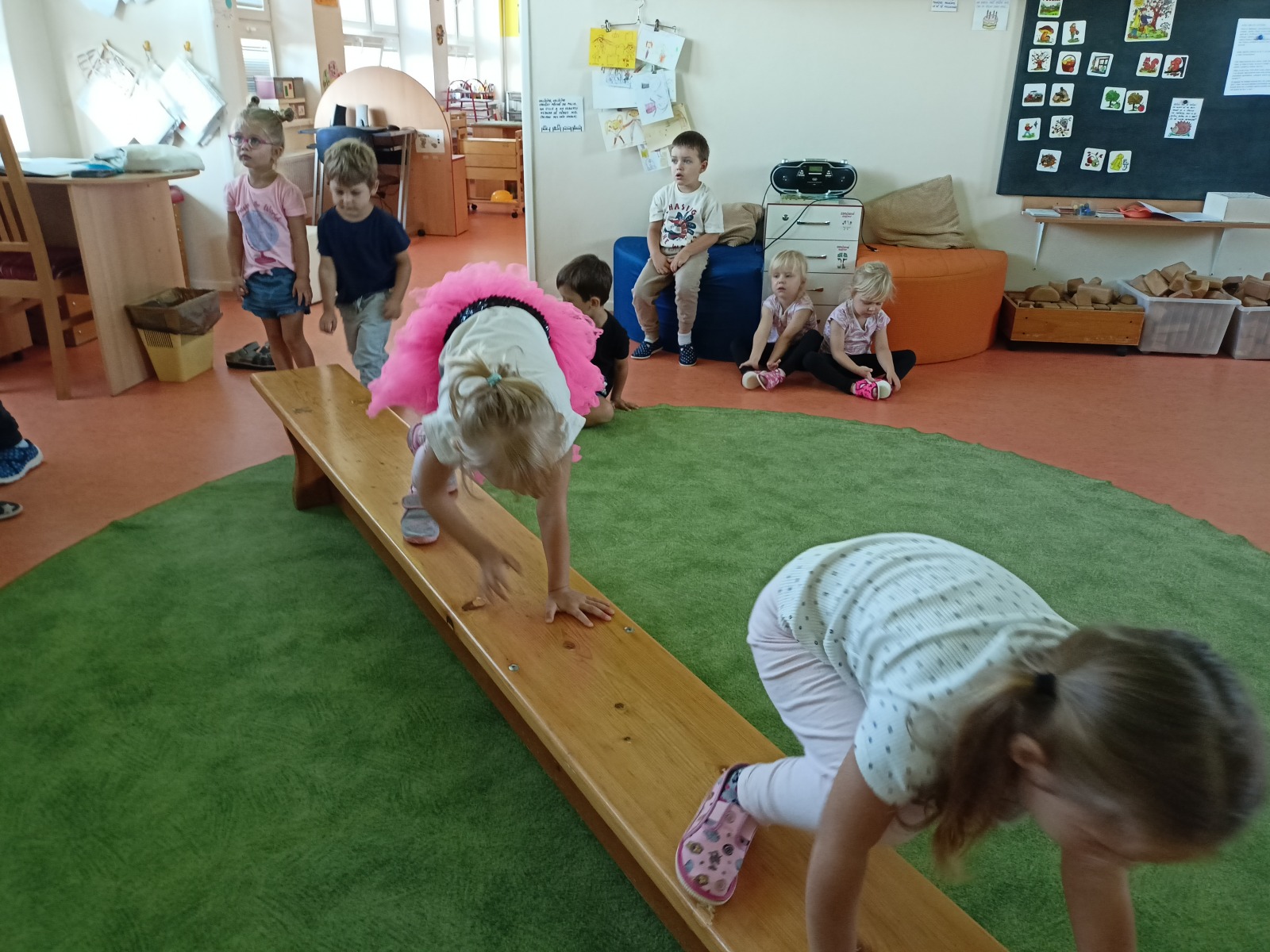 SPORTÍK – děti cvičily na lavičce přecházení, překračování, lezení.