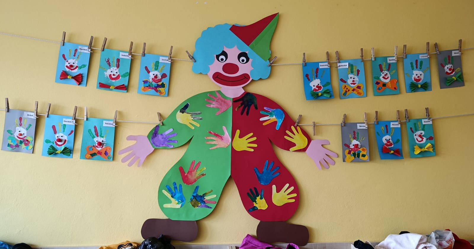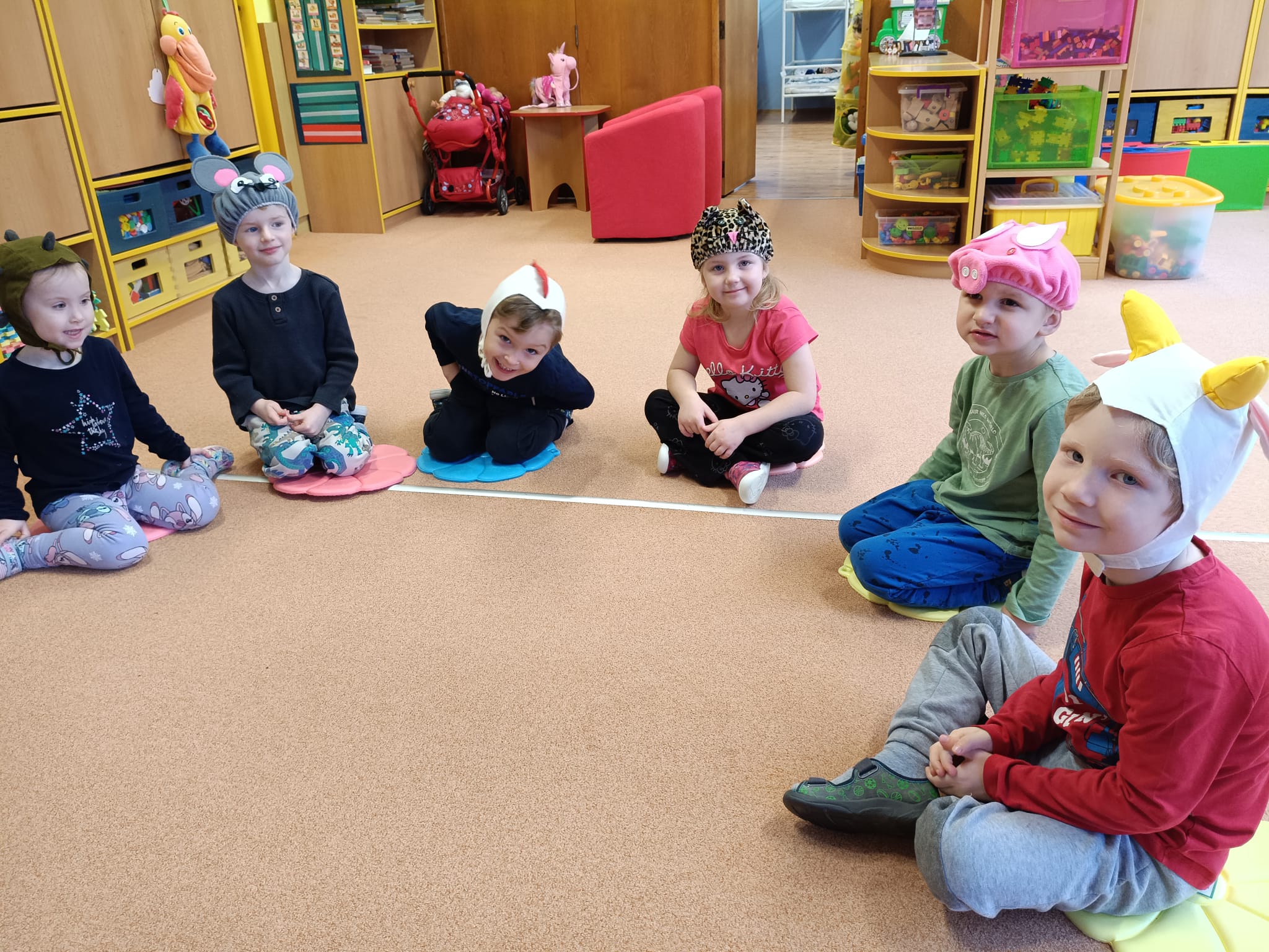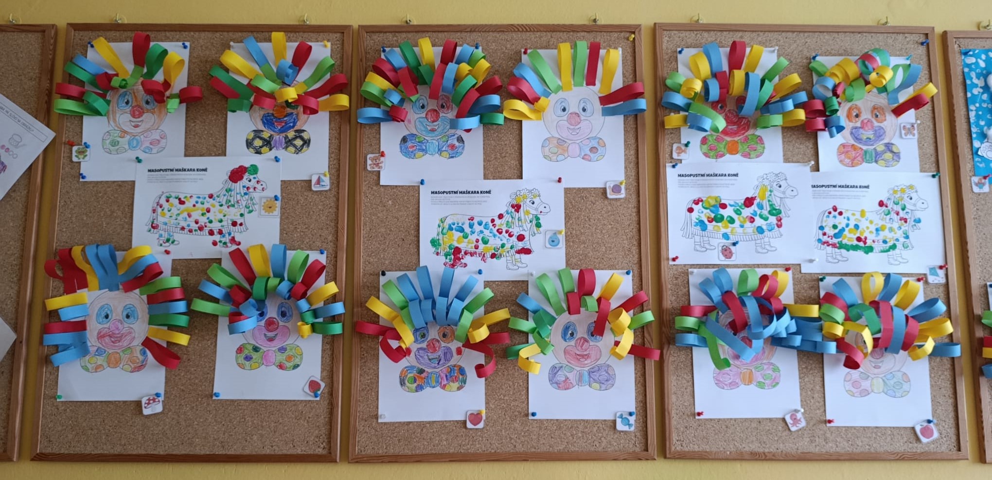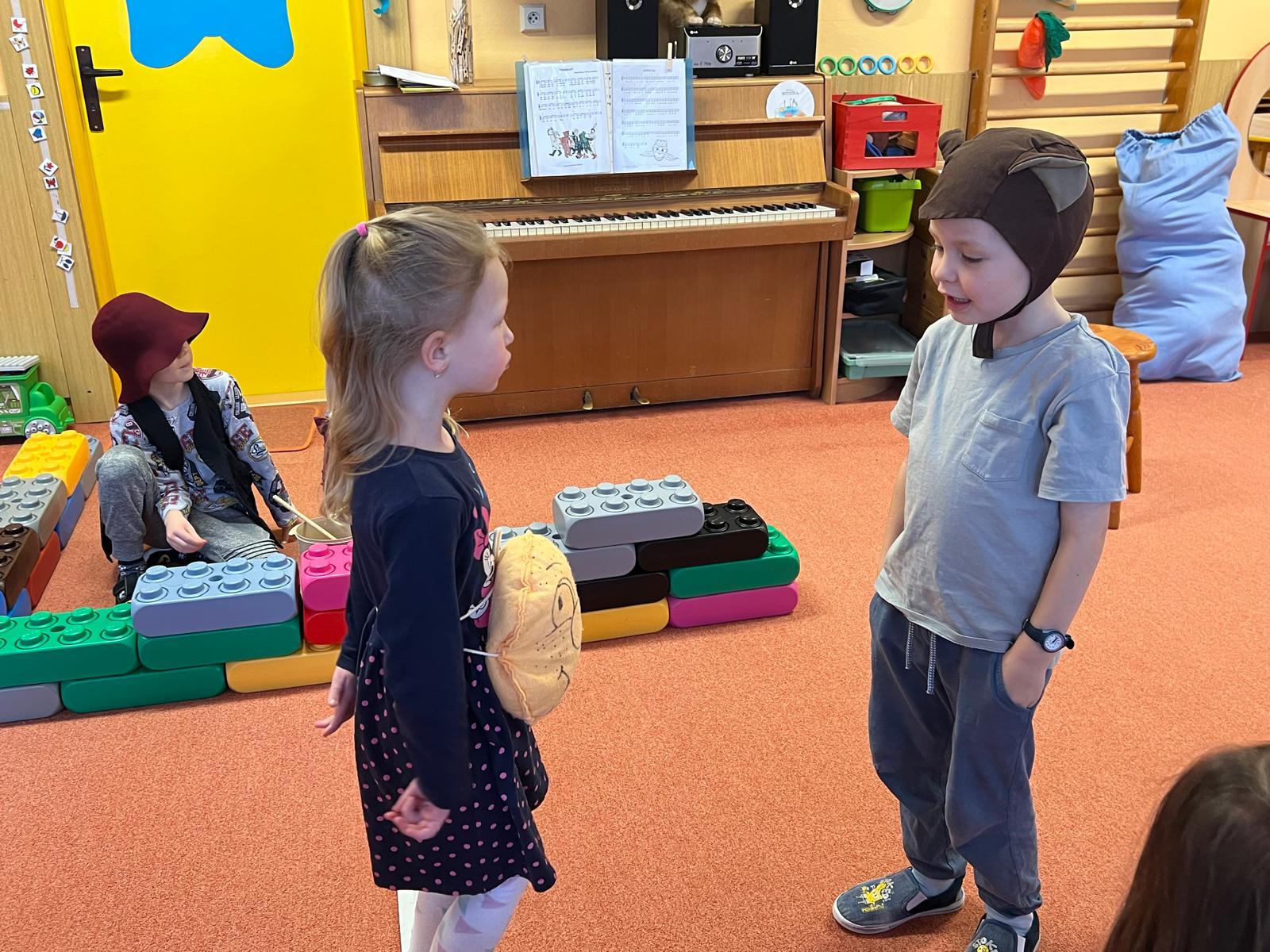 Medvídci se učili veselé karnevalové písničky a s nadšením se zapojili do dramatizace pohádky „O Koblížkovi“. Při jejím ztvárnění rozvíjeli řeč, spolupráci i fantazii a s radostí se vžívali do jednotlivých rolí. Vytvořili také velký model šaška, kterému ozdobili šaty otisky svých ručiček.