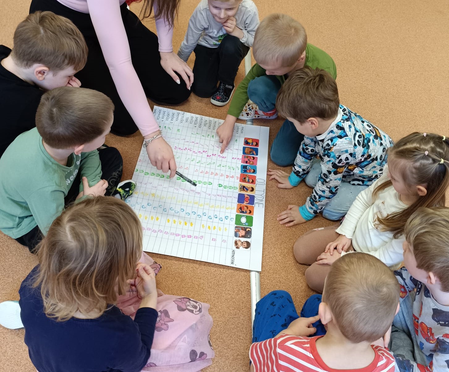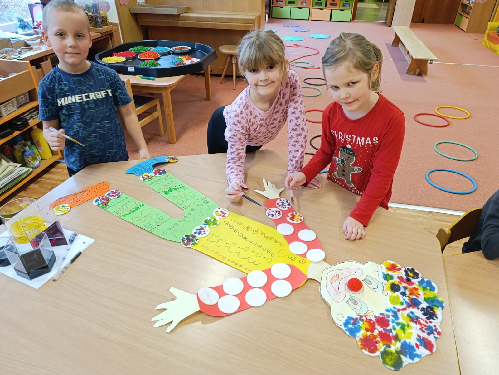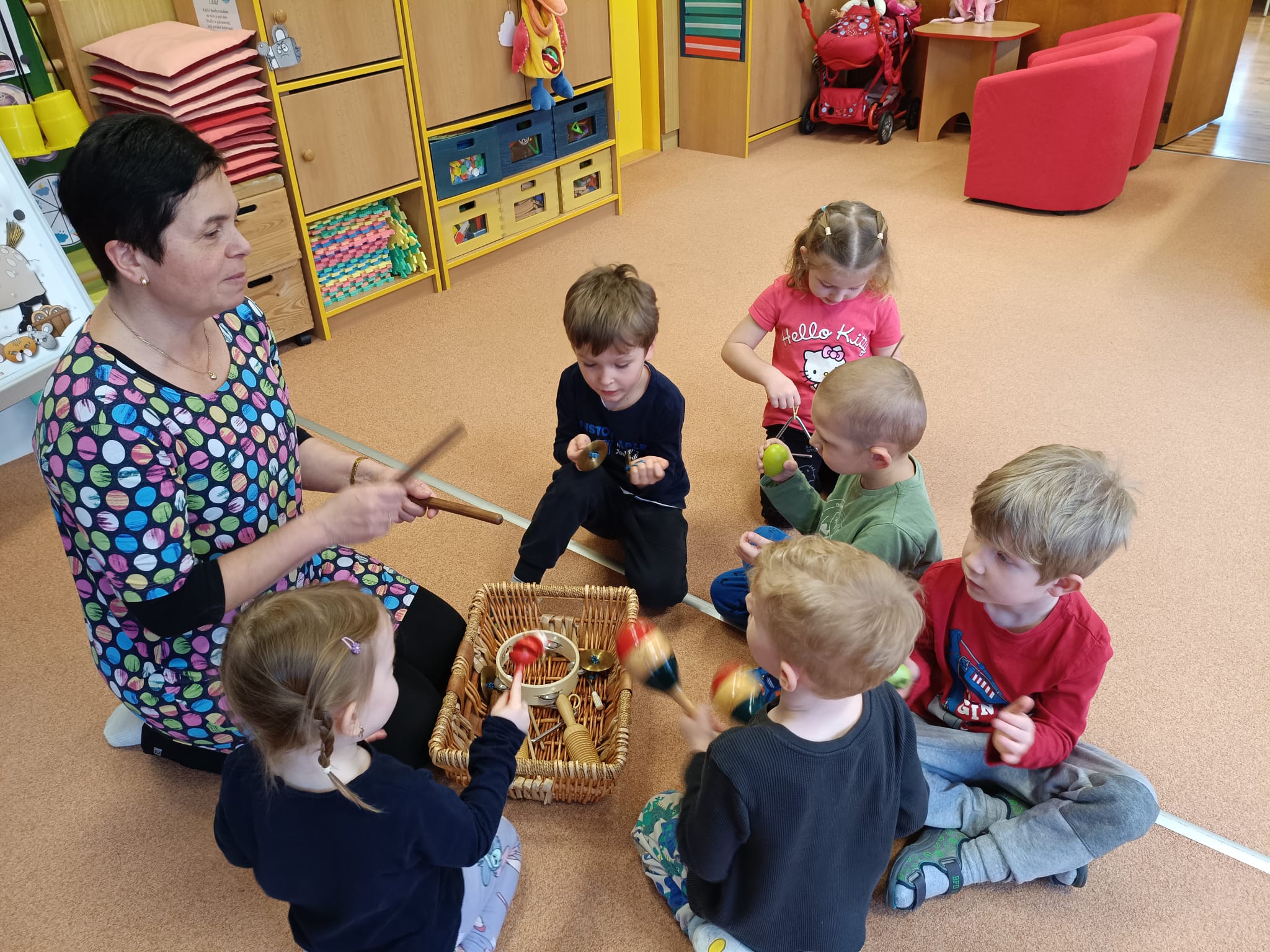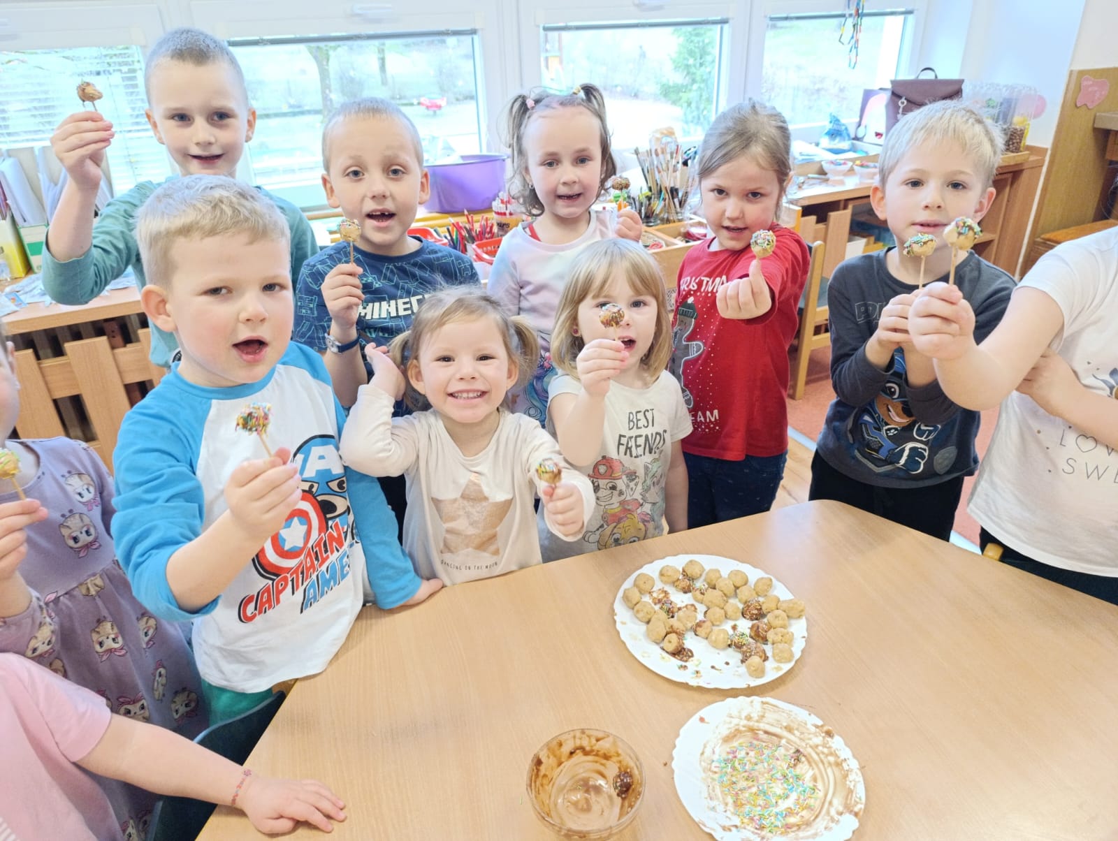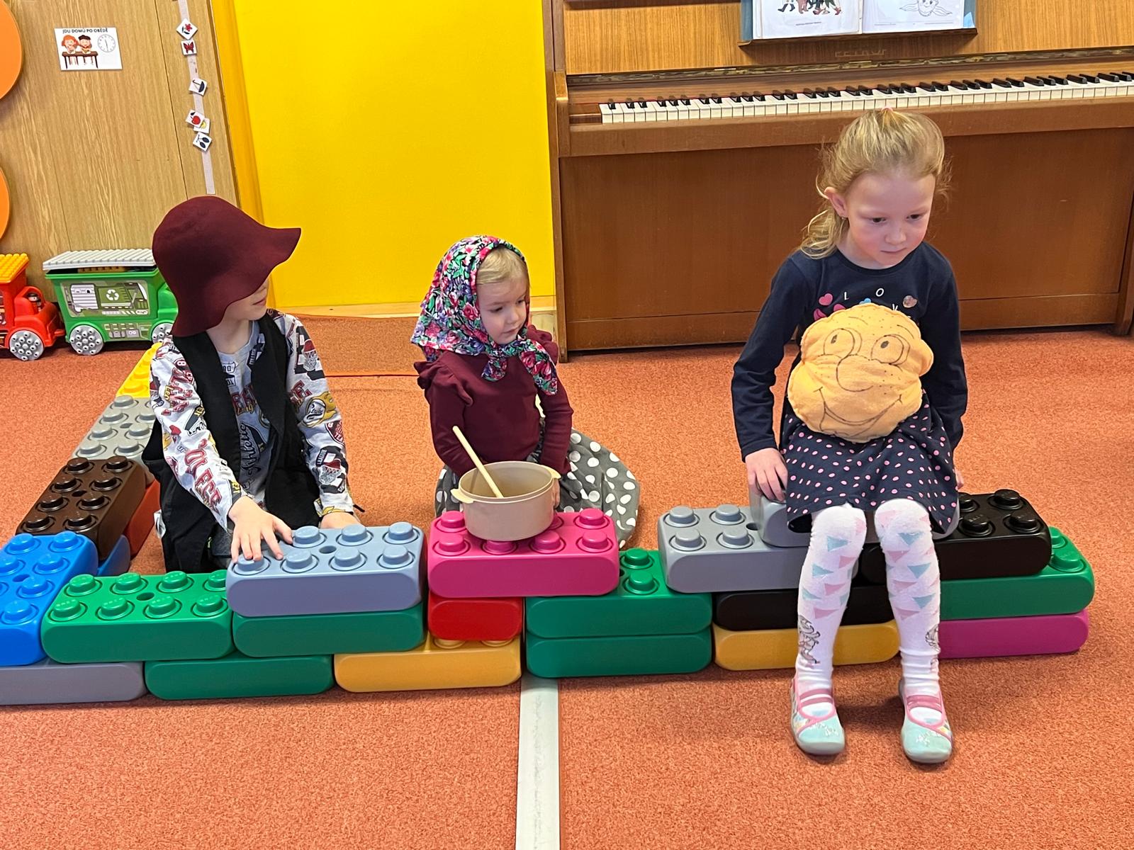 Medvídci se učili veselé karnevalové písničky a s nadšením se zapojili do dramatizace pohádky „O Koblížkovi“. Při jejím ztvárnění rozvíjeli řeč, spolupráci i fantazii a s radostí se vžívali do jednotlivých rolí. Vytvořili také velký model šaška, kterému ozdobili šaty otisky svých ručiček.