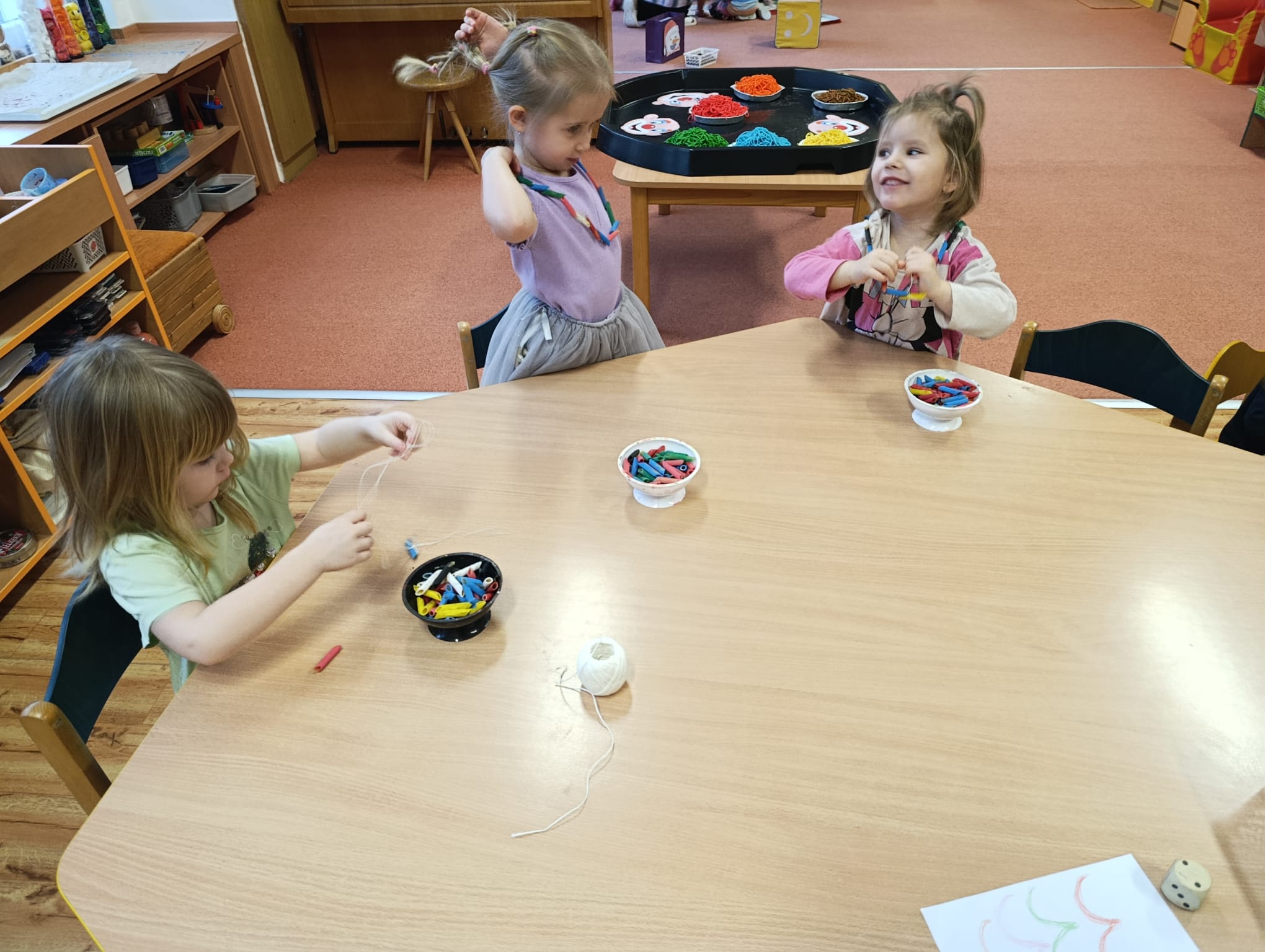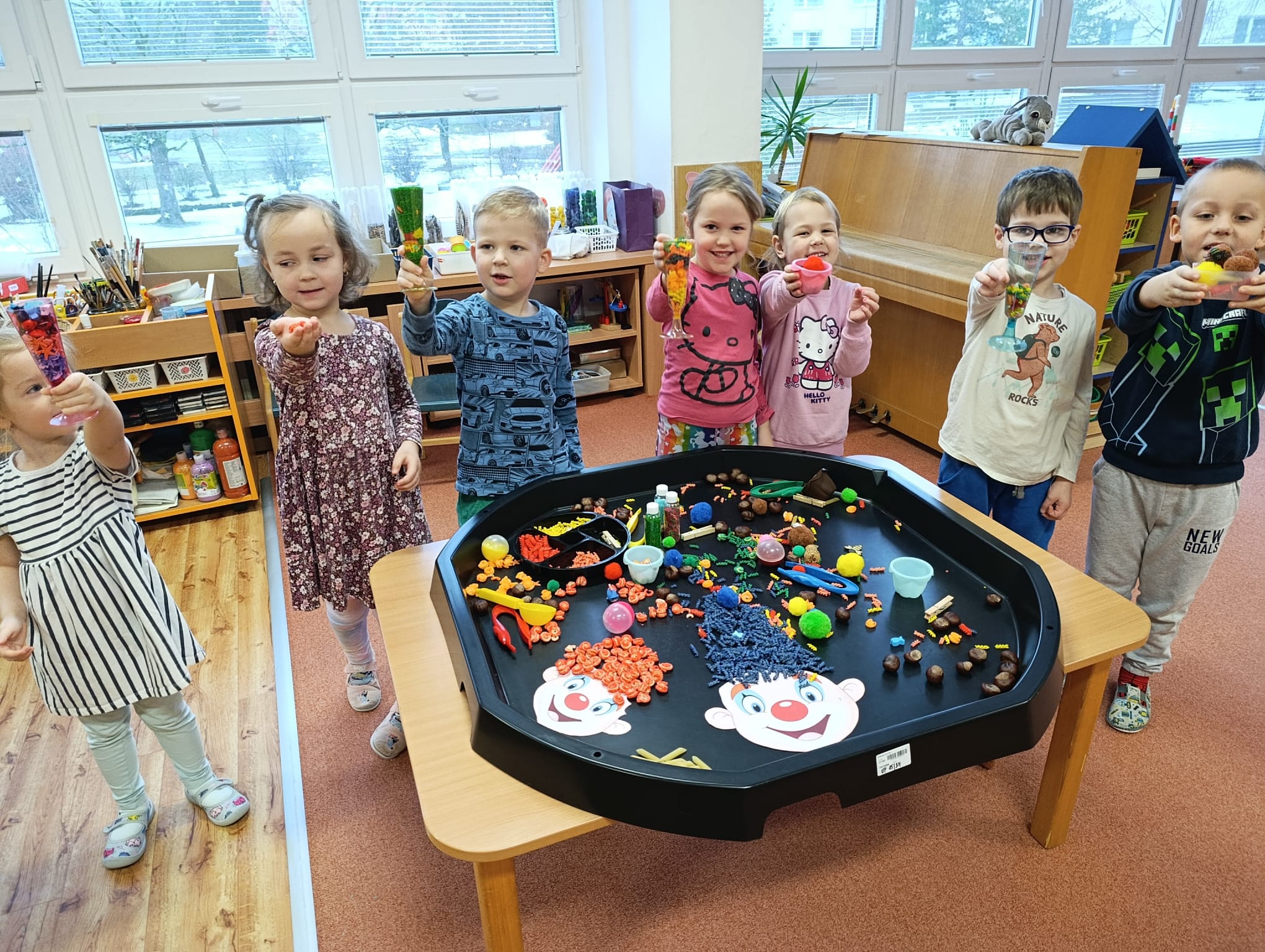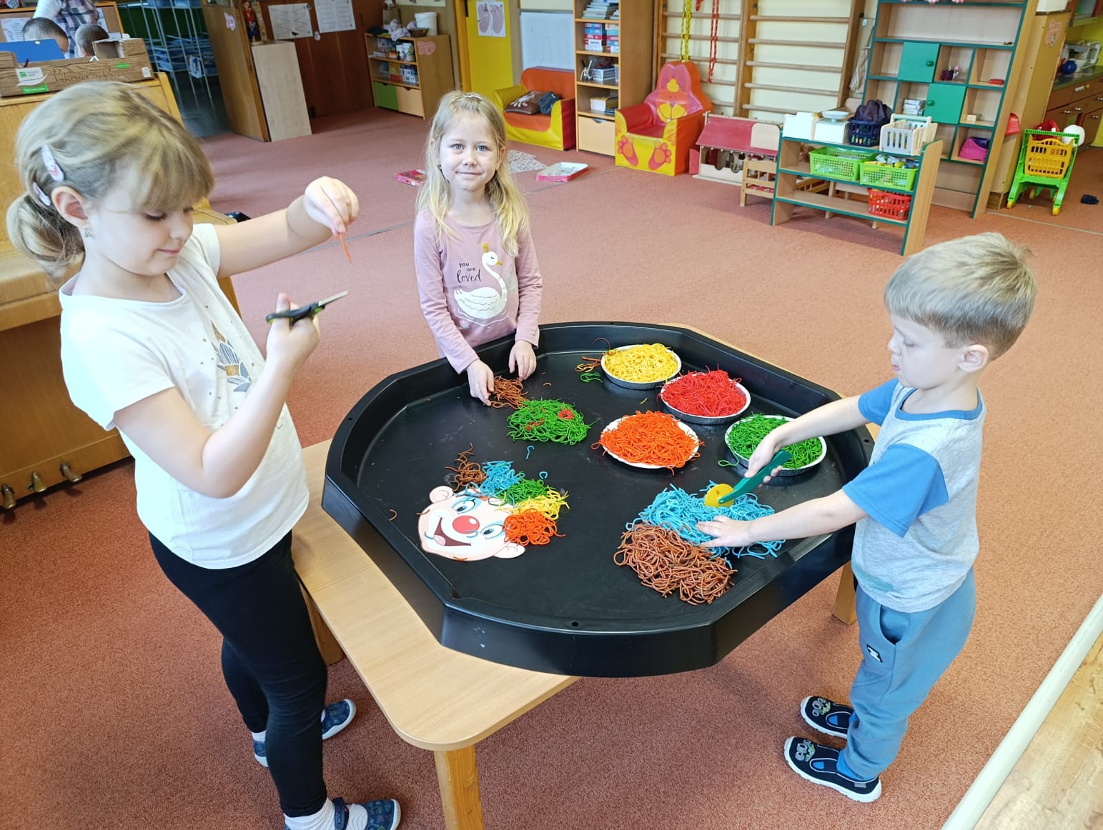 Děti ze třídy Zajíčků objevovaly nové materiály prostřednictvím smyslových her. Tvořily obrázky z barevných špaget, balónky zdobily tiskem, navlékaly korálky z těstovin a vyráběly karnevalová lízátka.