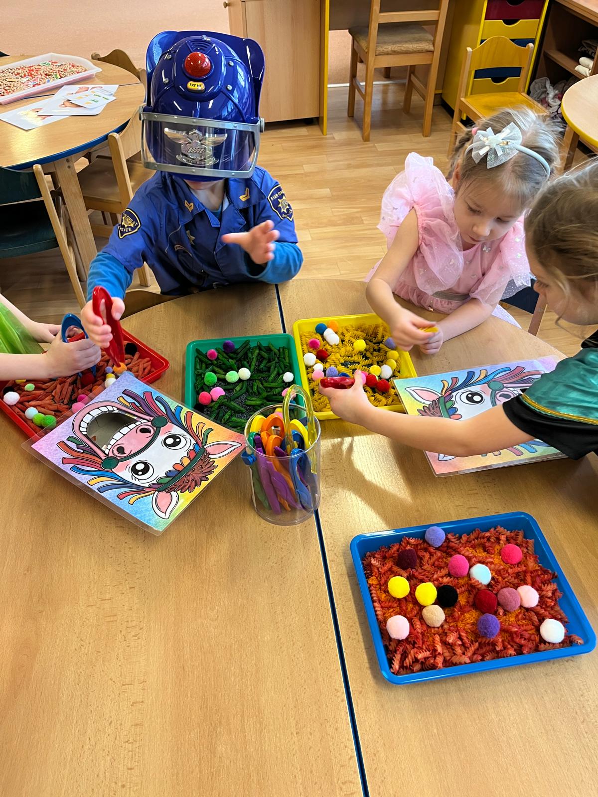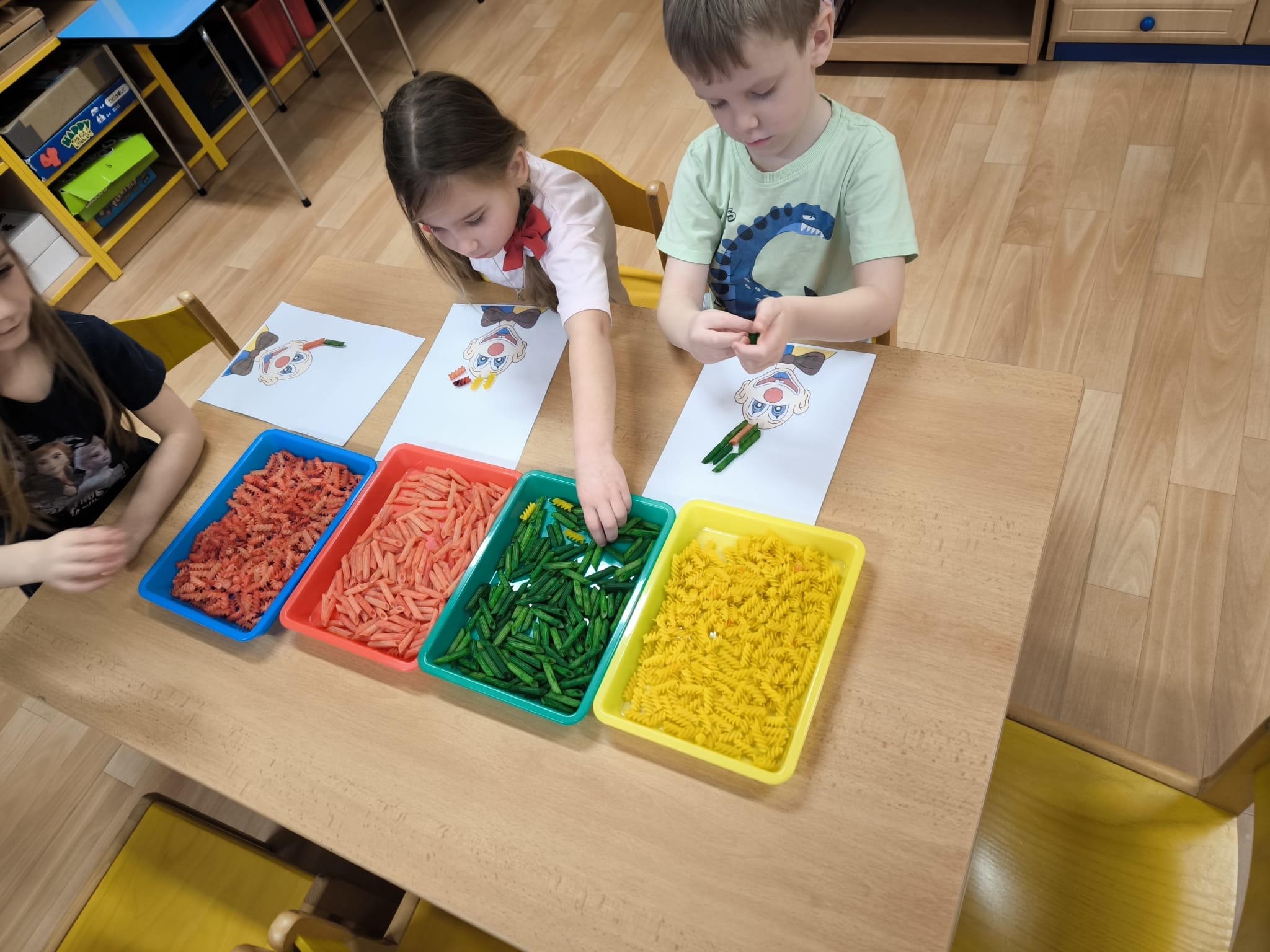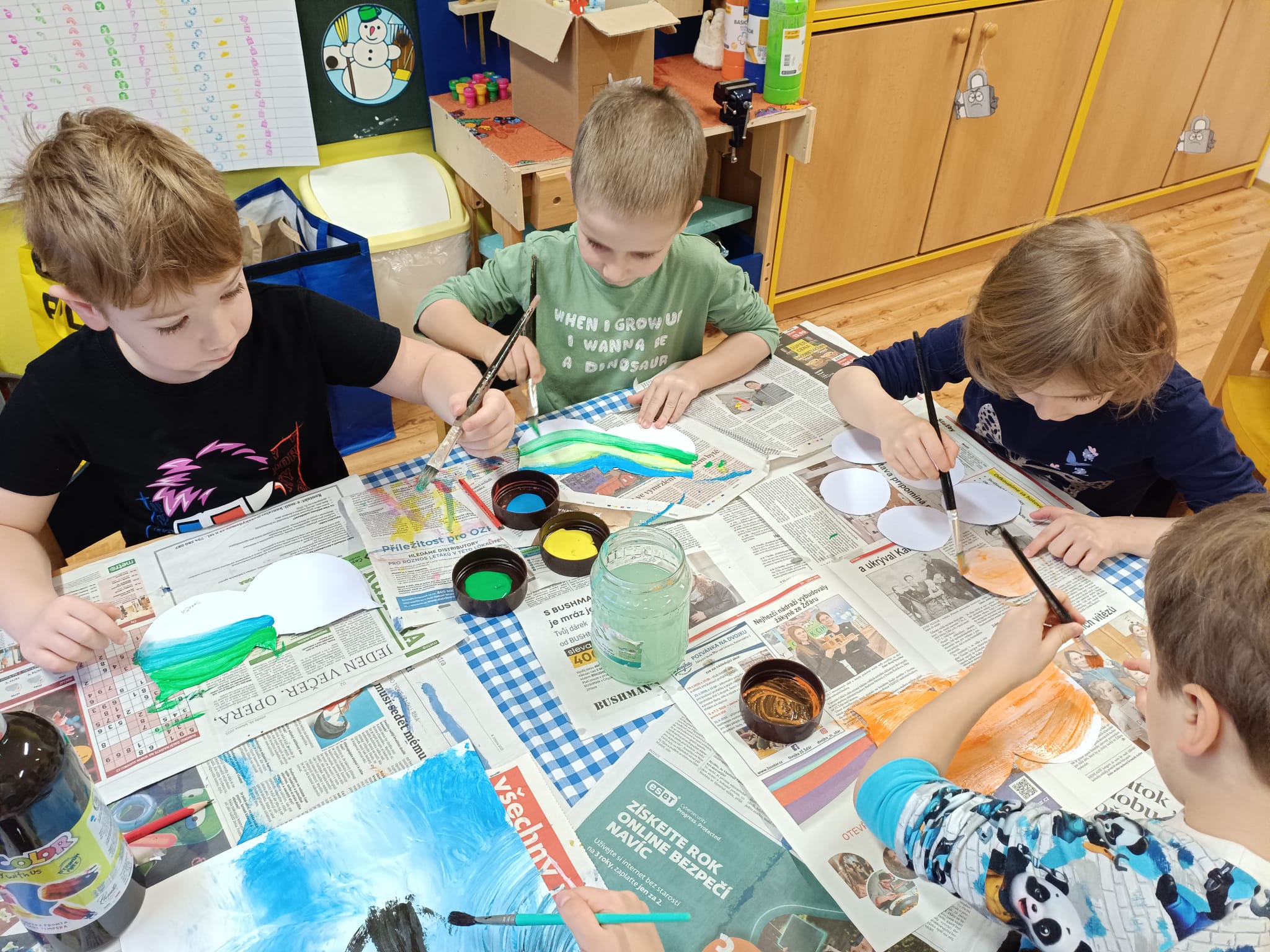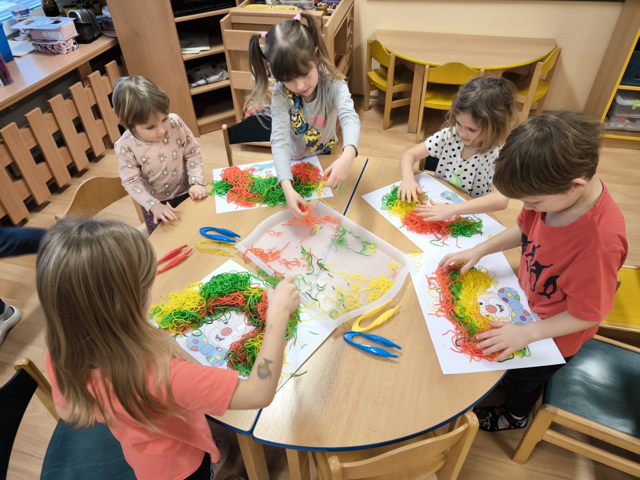 Děti ze třídy Zajíčků objevovaly nové materiály prostřednictvím smyslových her. Tvořily obrázky z barevných špaget, balónky zdobily tiskem, navlékaly korálky z těstovin a vyráběly karnevalová lízátka.
