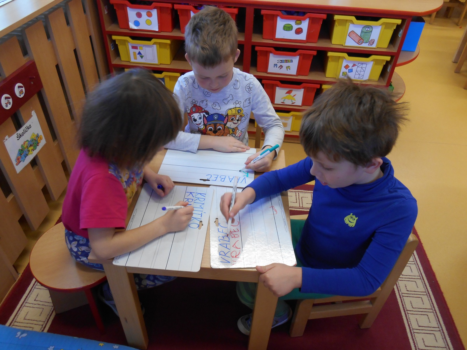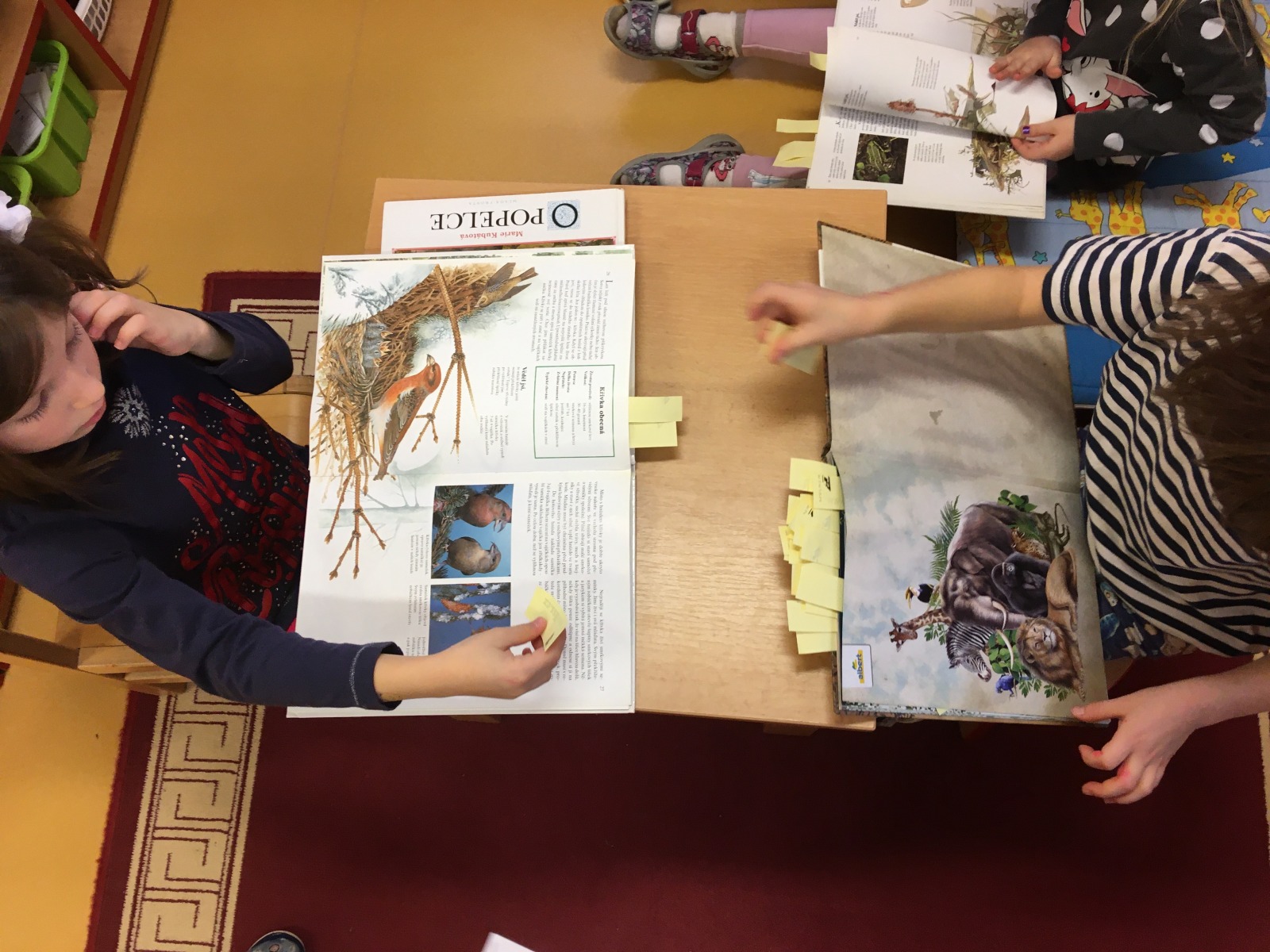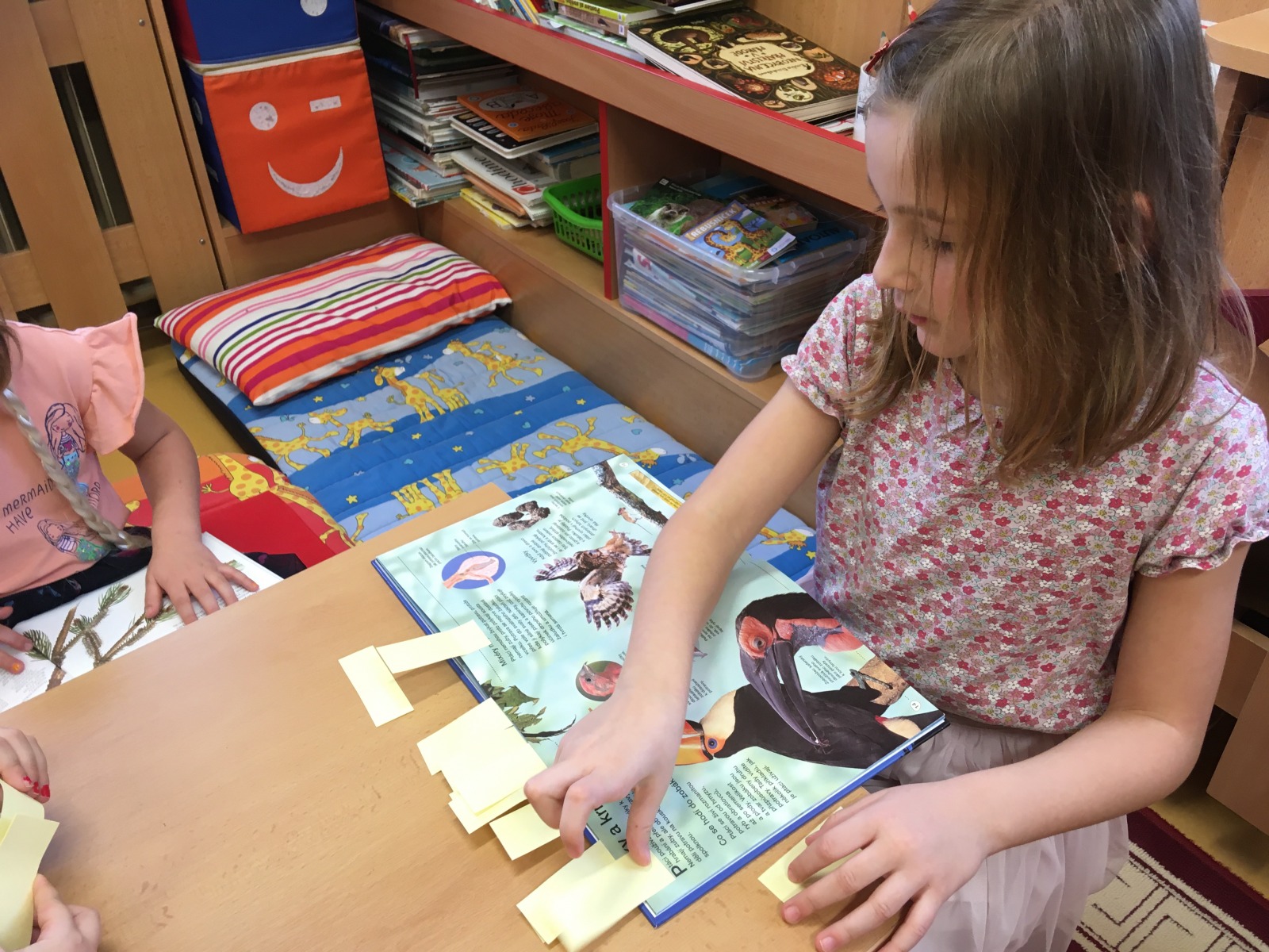 - práce s knihou - vyhledávání ptáků, psaní slov podle předlohy na mazací destičky,