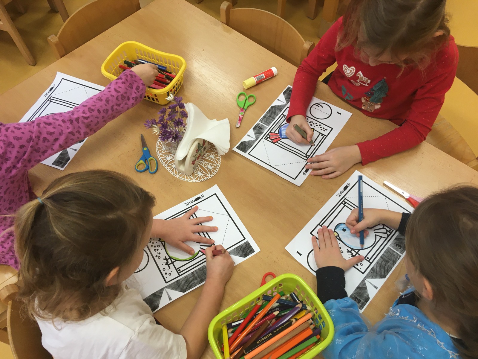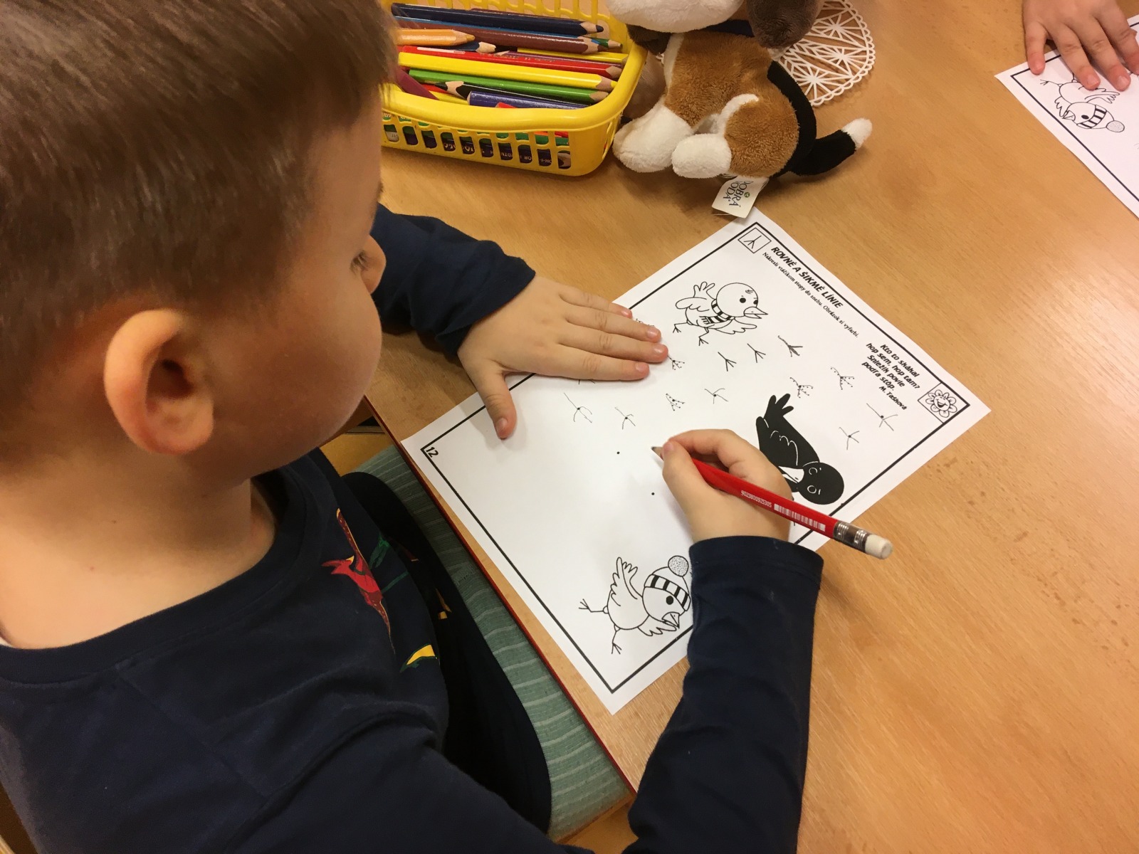 a úchopem tužky při kreslení ptáčků a krmítek.