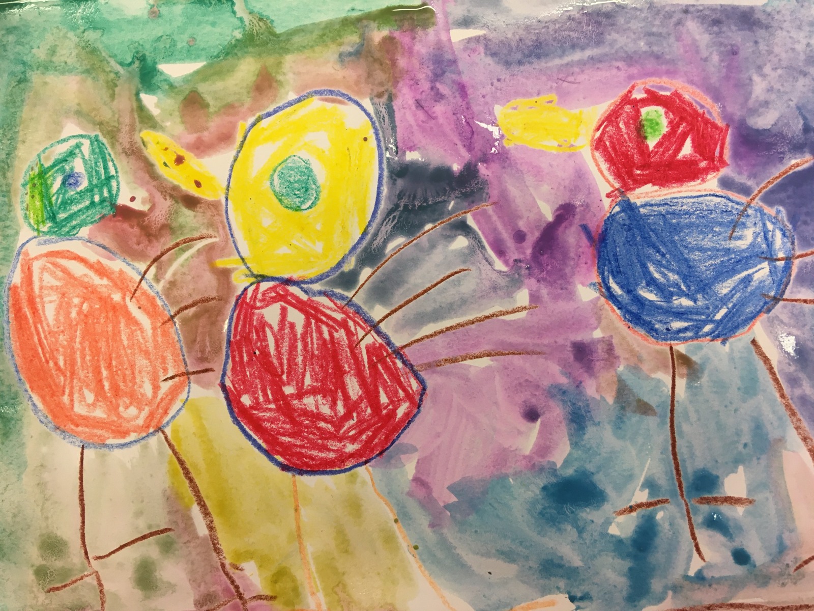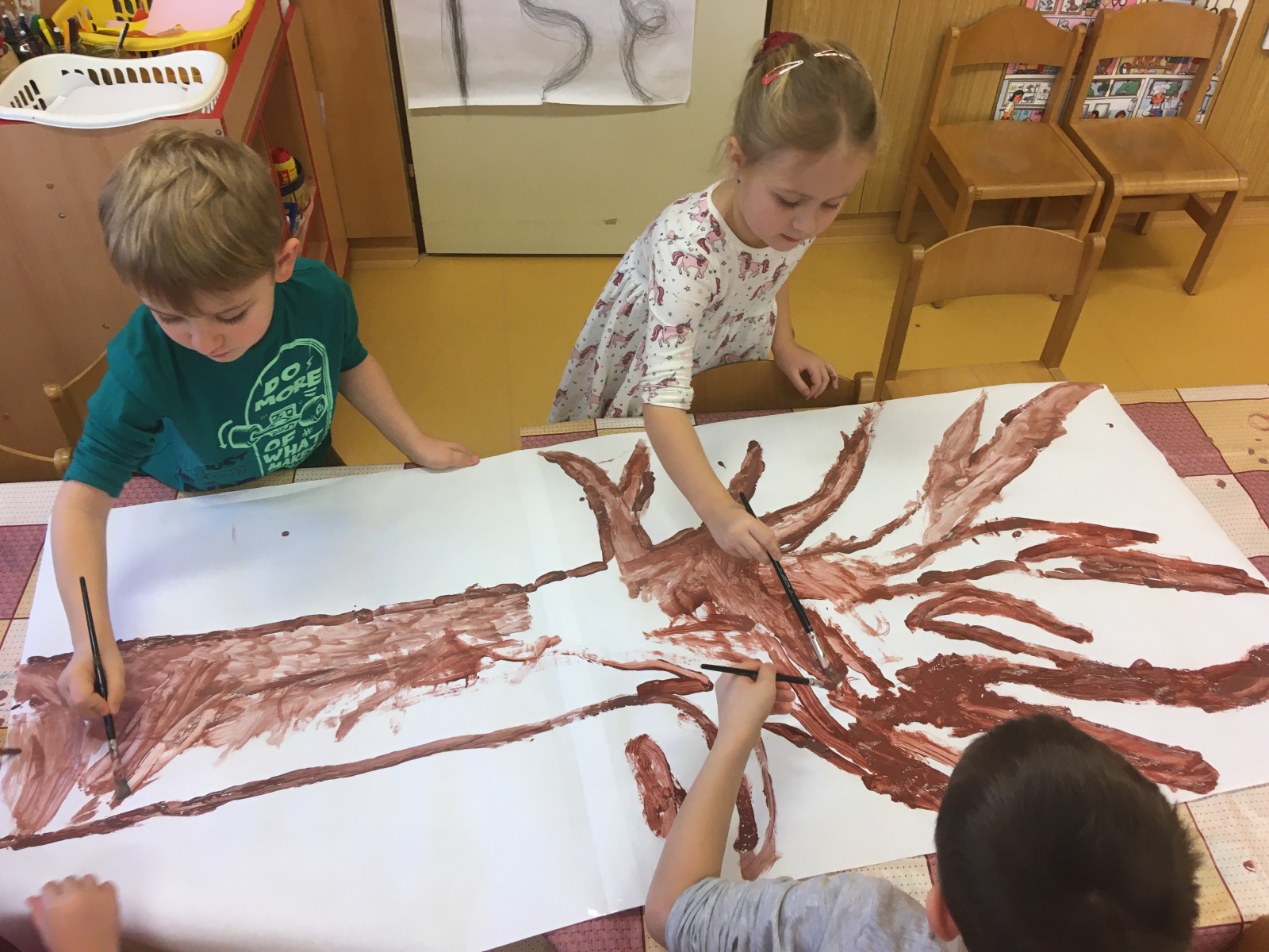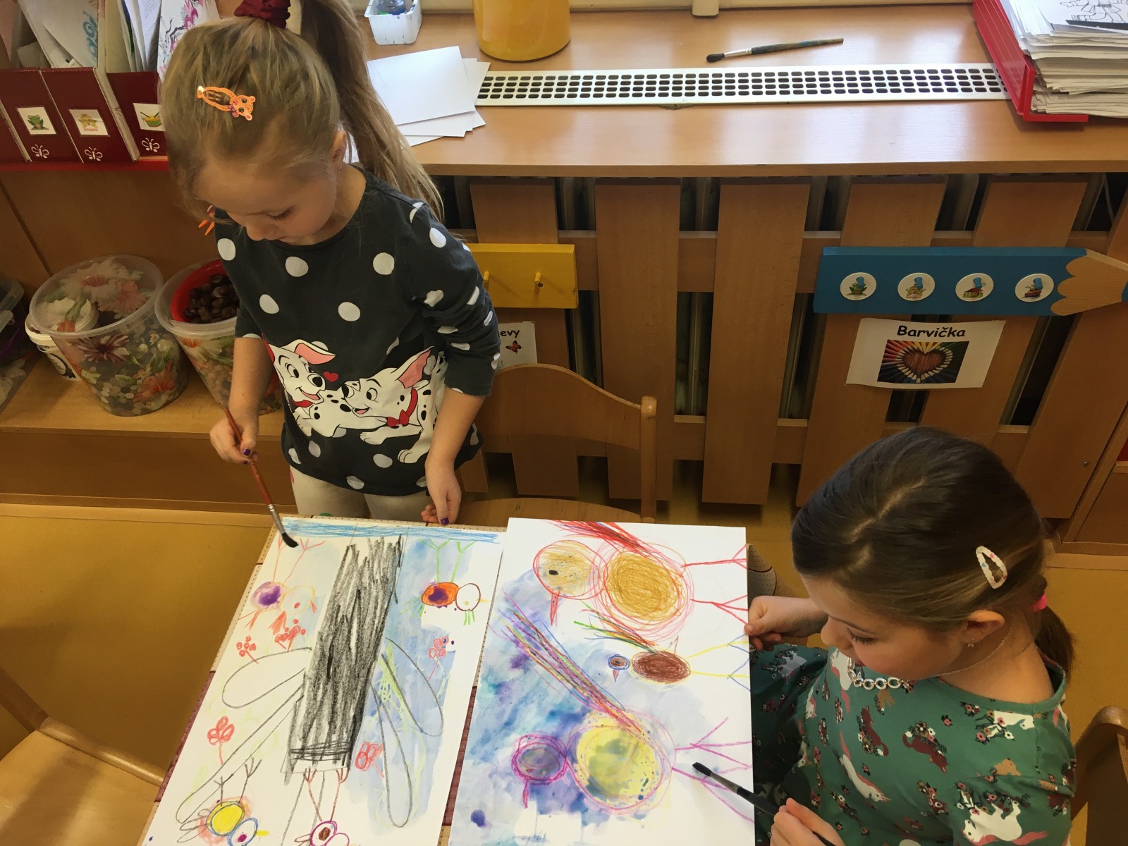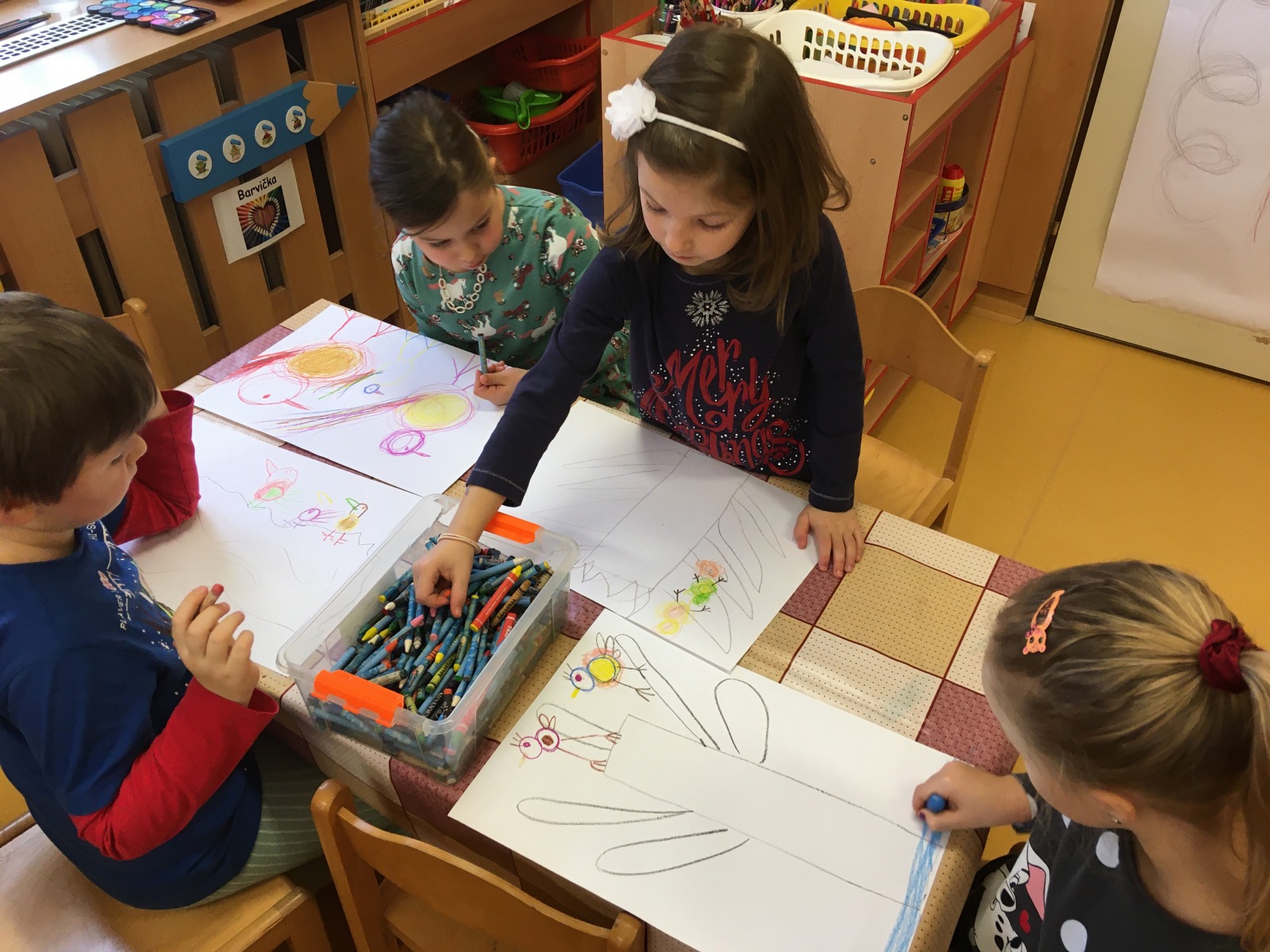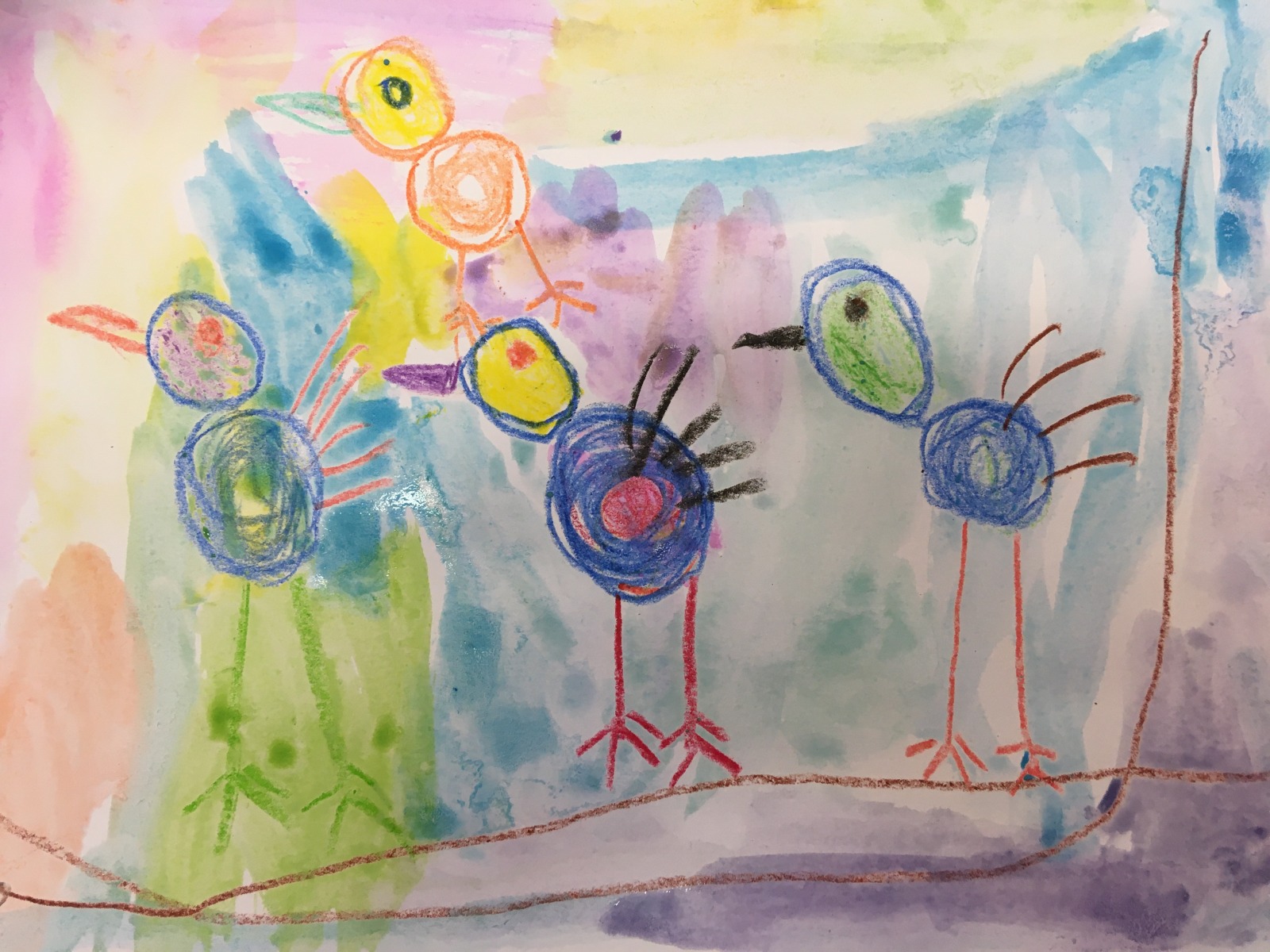 - kreslení ptáčků s využitím voskovek a vodové barvy,