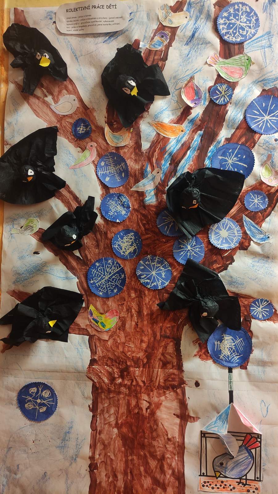 koláž ZIMNÍ STROM S PTÁKY - dolepení ptáků, sněhových vloček a krmítka