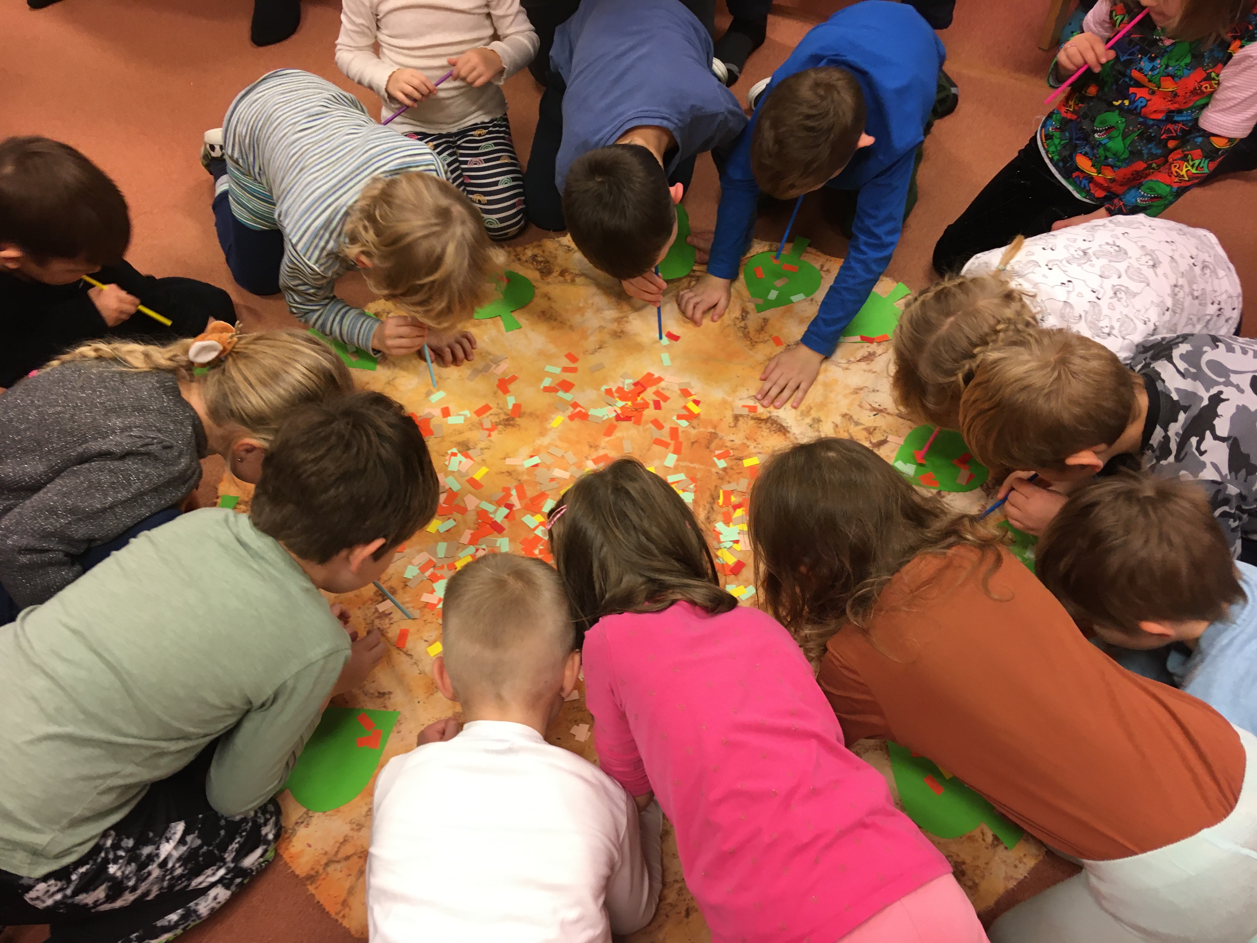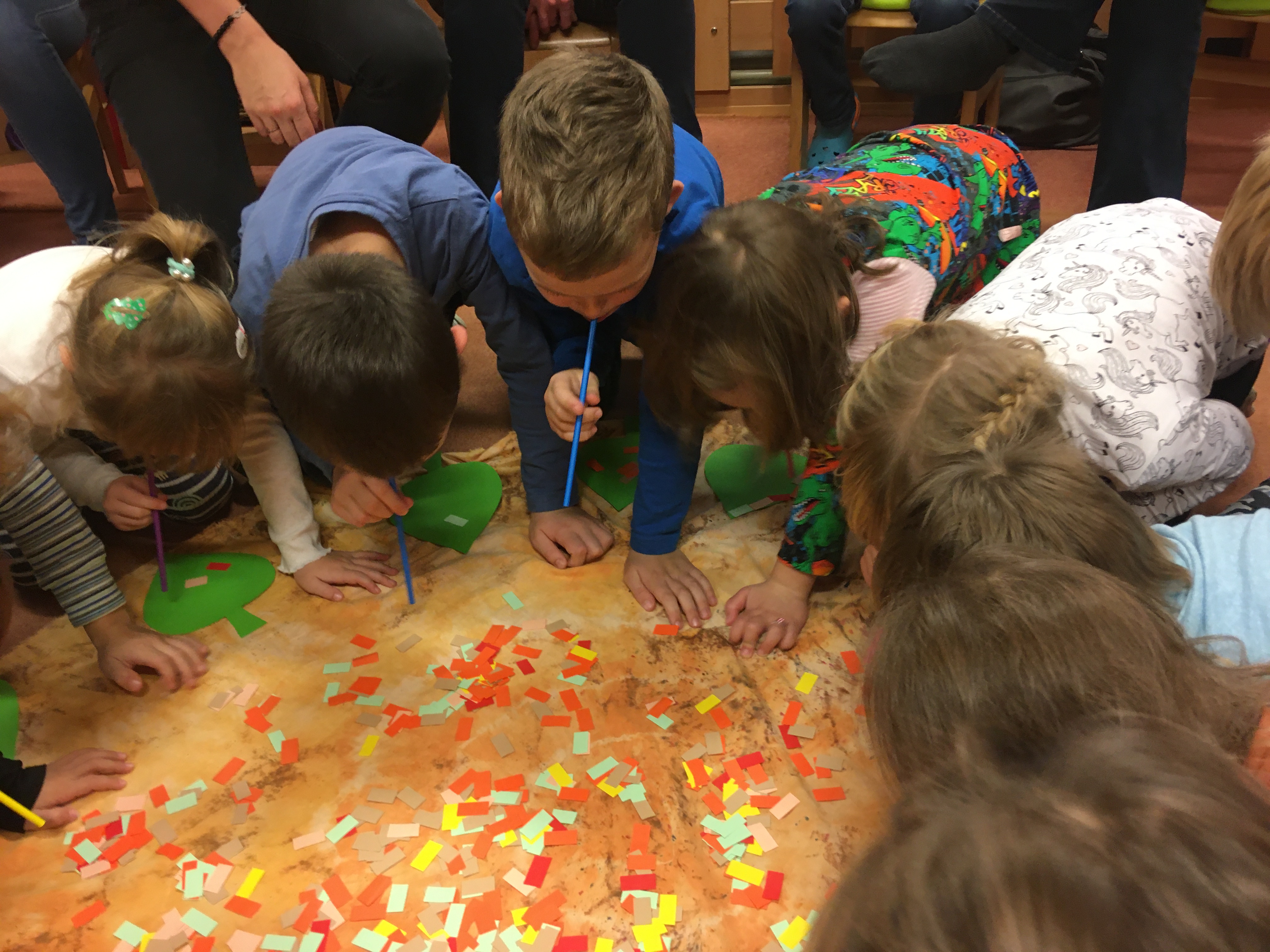 Pomocí brčka a využití dechu přenášely barevné papírky na vystřižený zelený list.