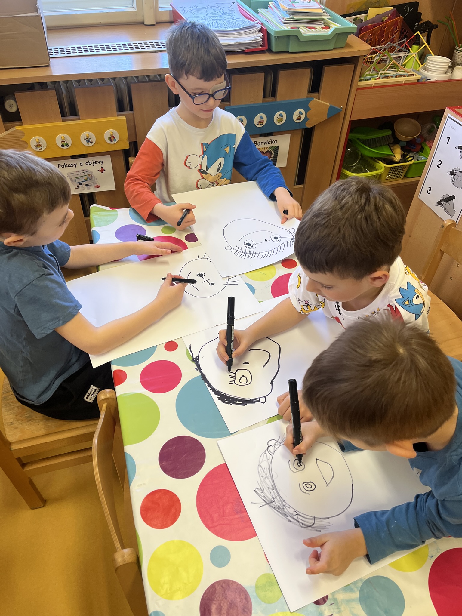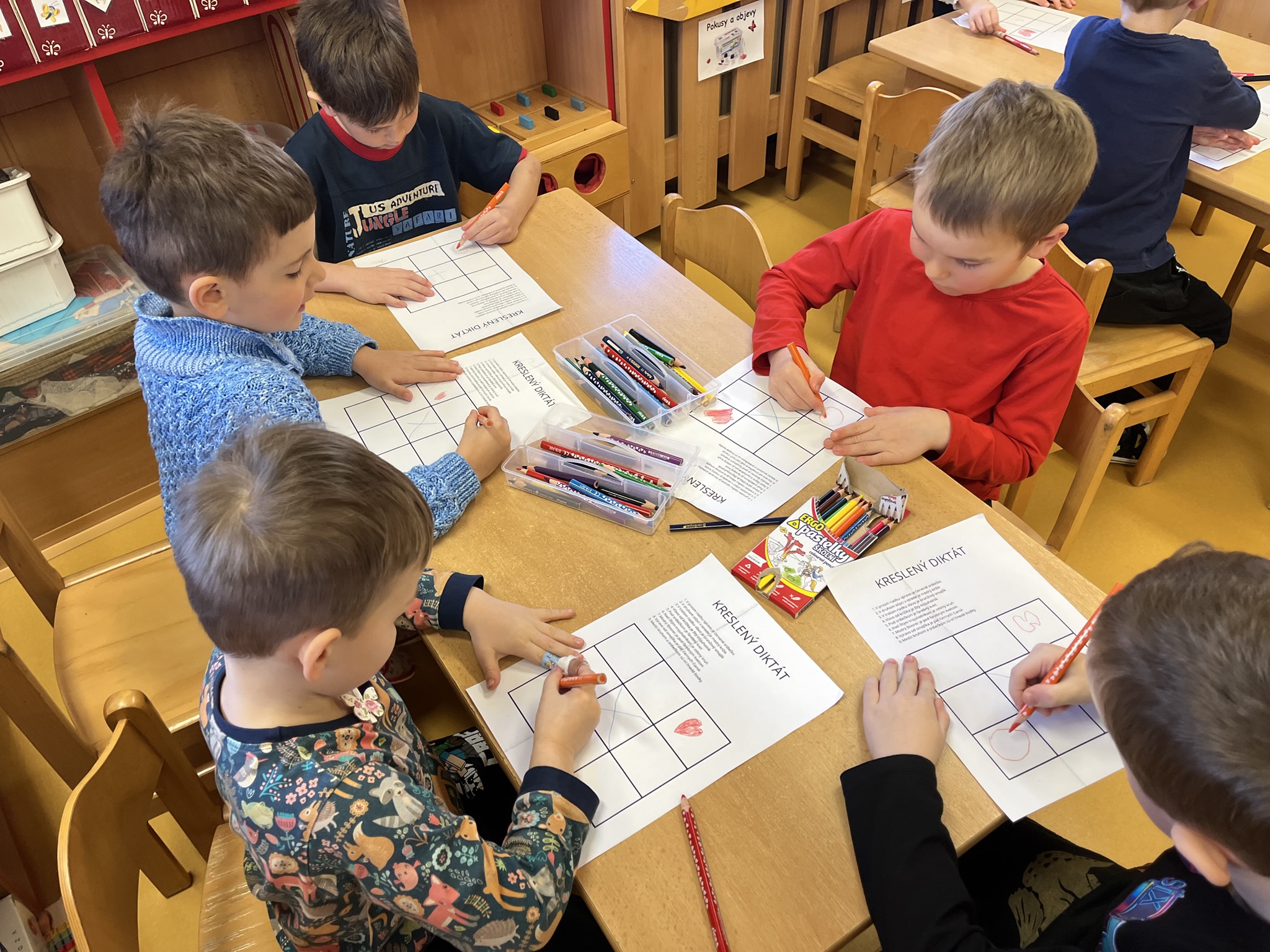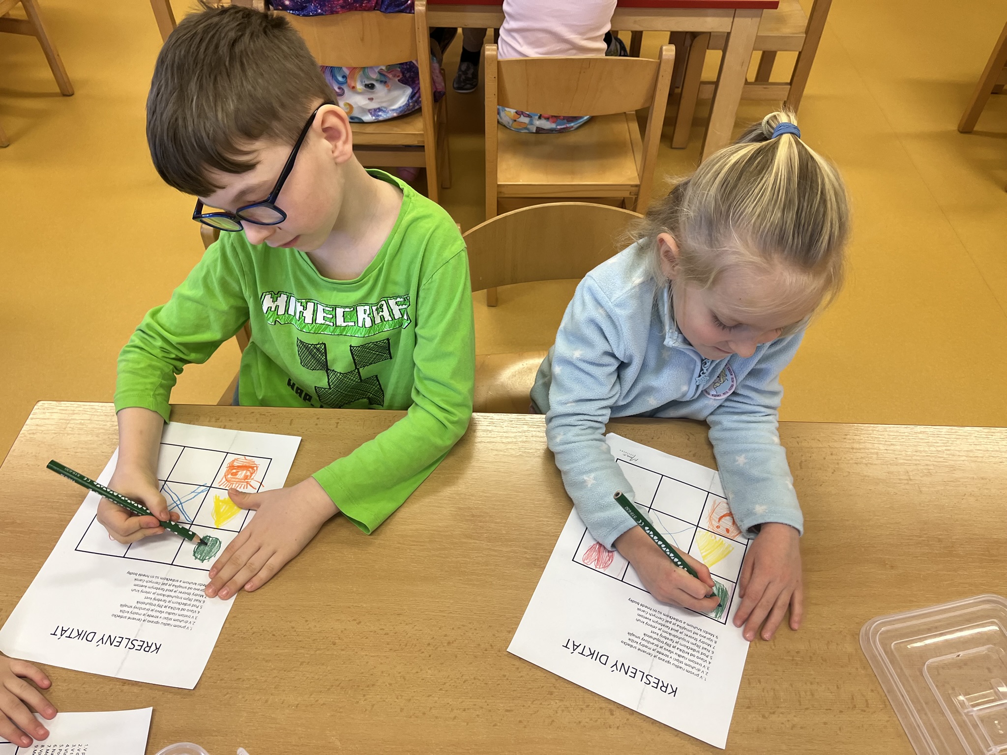 Společně jsme si vyzkoušeli také kreslený diktát, při kterém děti podle slovních pokynů kreslily obrázky do odpovídajících políček.