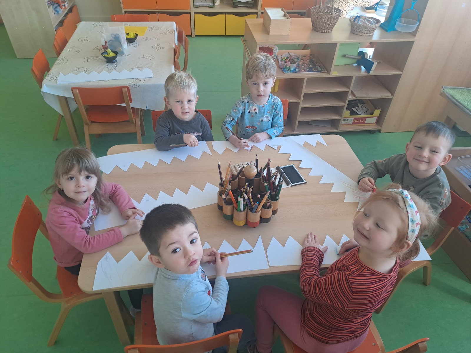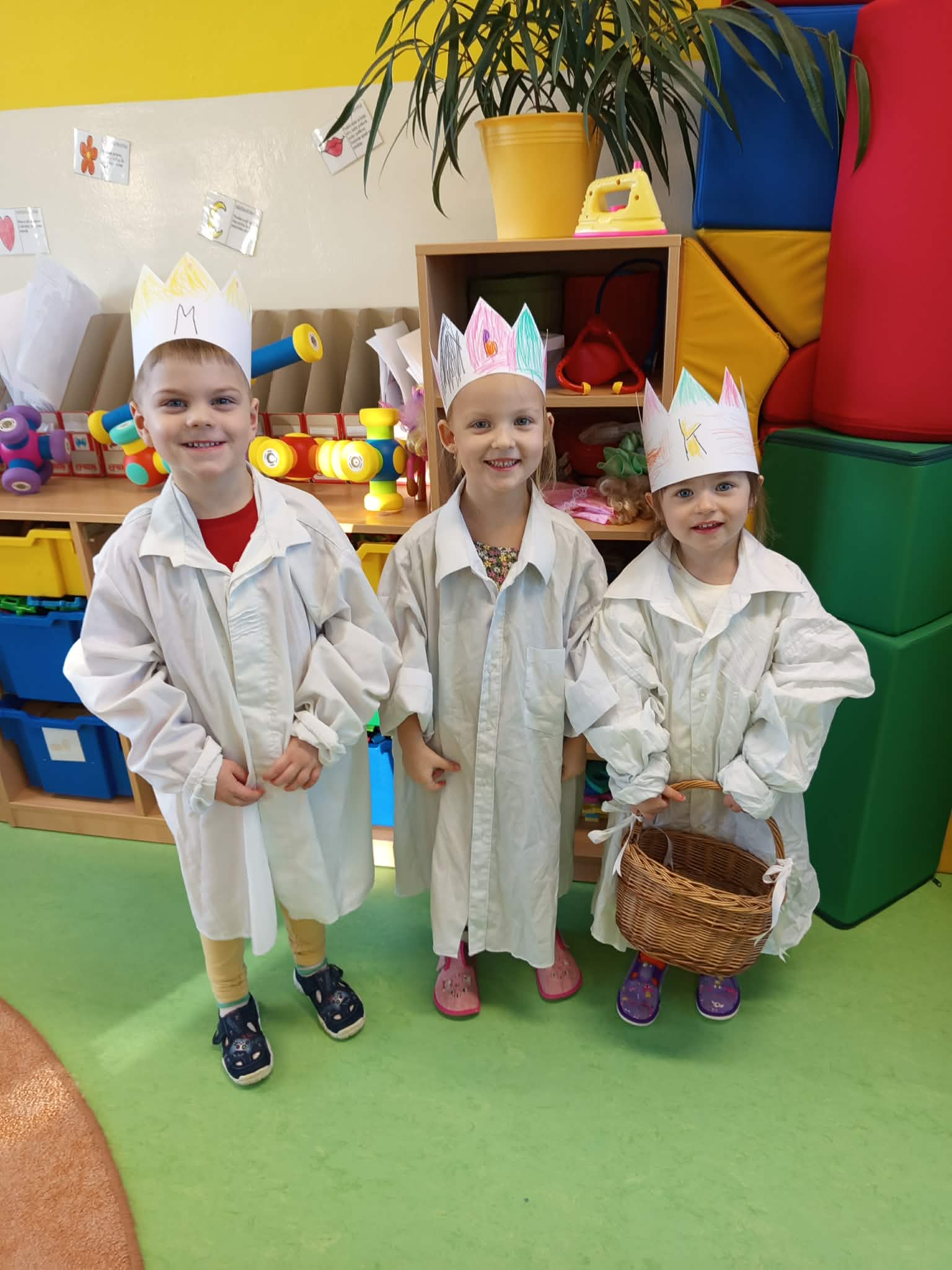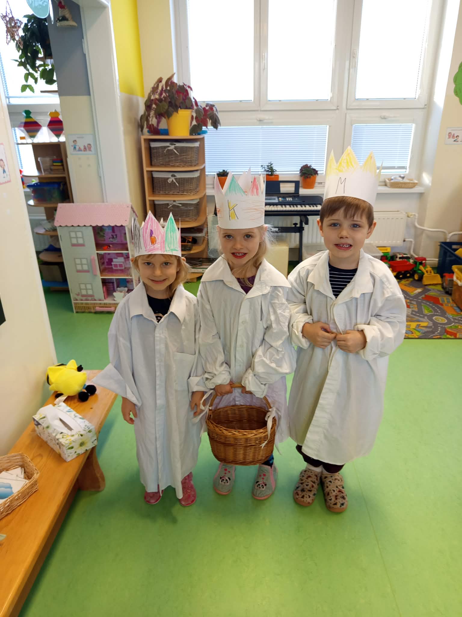 Starší děti vyráběly postavy Tří králů – mačkaly papír, dokreslovaly detaily a zdobily. Při práci si přirozeně rozvíjely jemnou motoriku, sílu prstů a trpělivost. Mladší děti se pustily do výroby komet z papíru, kde si vyzkoušely mačkání krepového papíru, lepení a špetkový úchop. Jemná motorika dostala pořádně zabrat, ale zvládly to s chutí a nadšením. Dále jsme vyťupkávali královské koruny z papíru, při čemž jsme procvičovali barvy a soustředění. Koruny si děti také zdobily korálky, což byla oblíbená činnost a zároveň skvělý trénink koordinace ruky a oka.Nechyběly ani námětové hry, ve kterých si děti hrály na Tři krále, a pohybové hry, aby se pořádně protáhly. Týden jsme doplnili zpěvem písně „My tři králové…“, kterou si děti rychle oblíbily a zpívaly ji s radostí. Týden byl plný tvoření, pohybu, zpěvu a objevování.😊