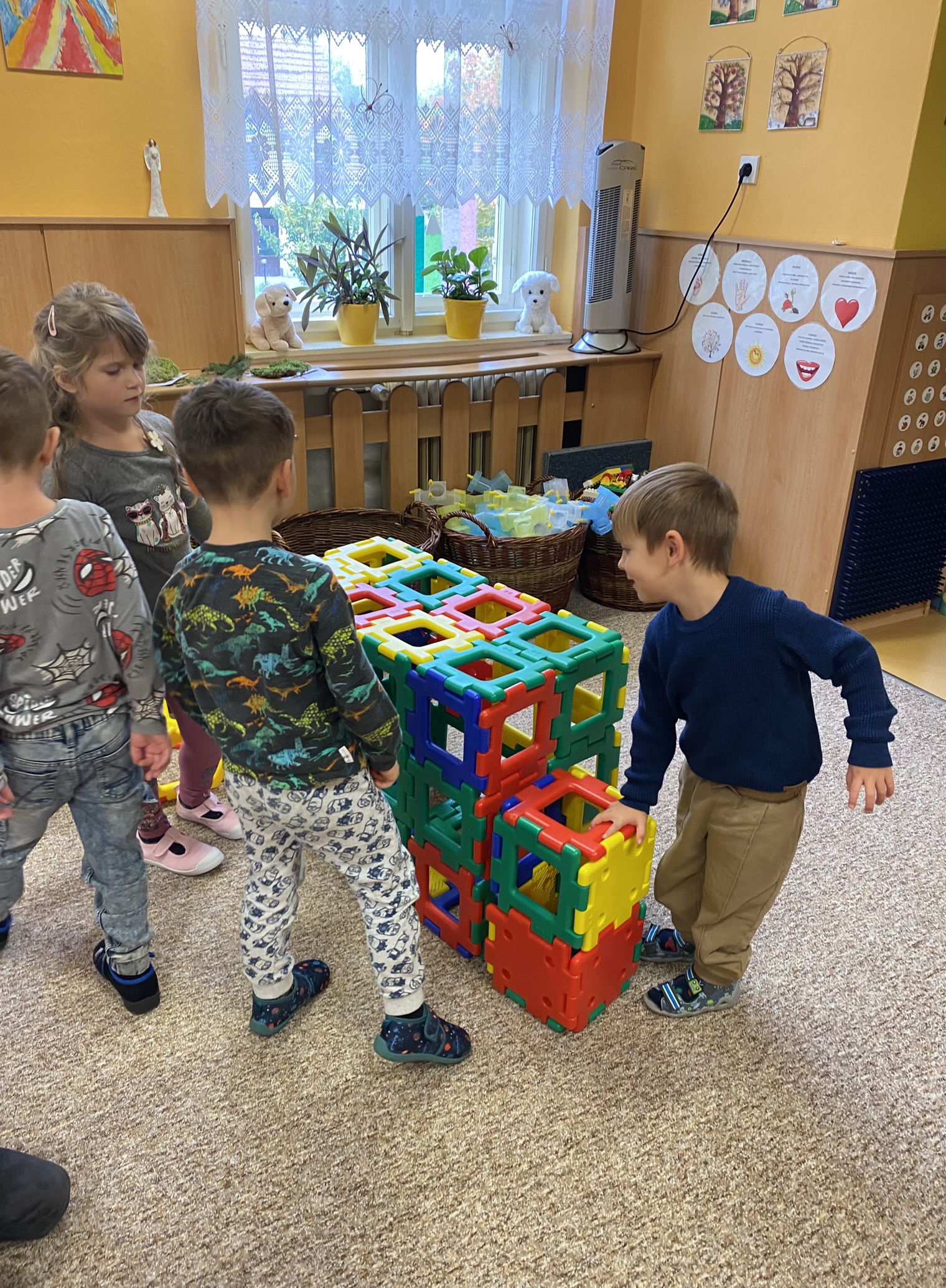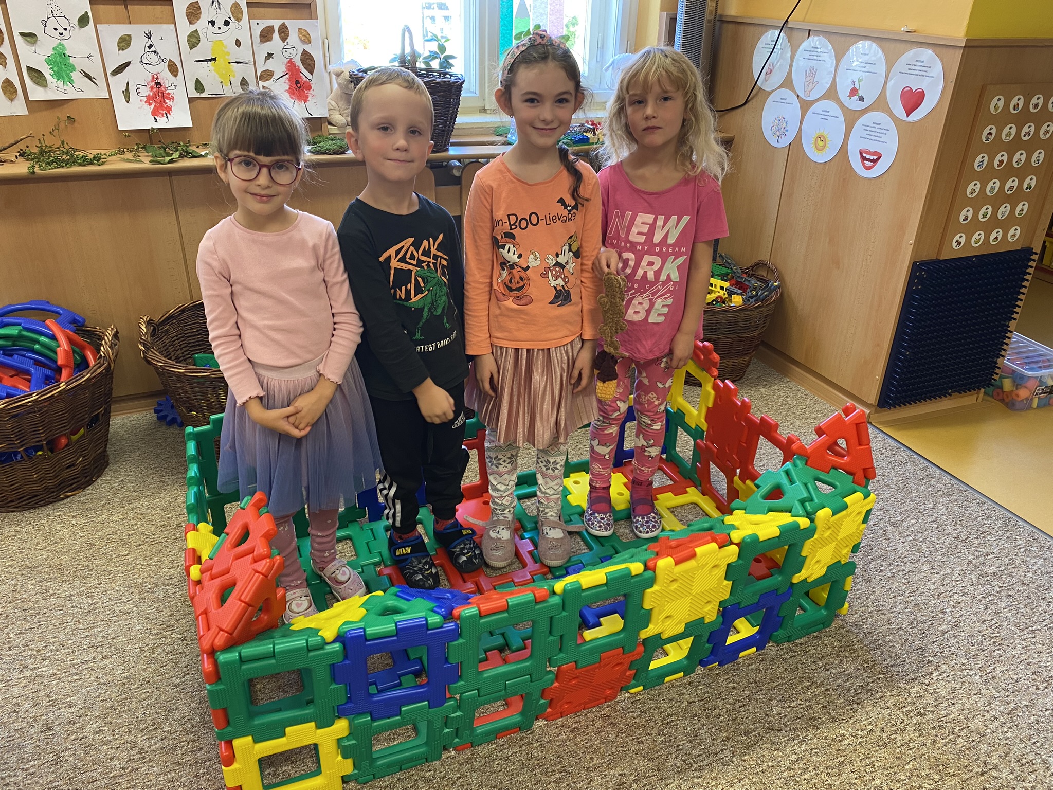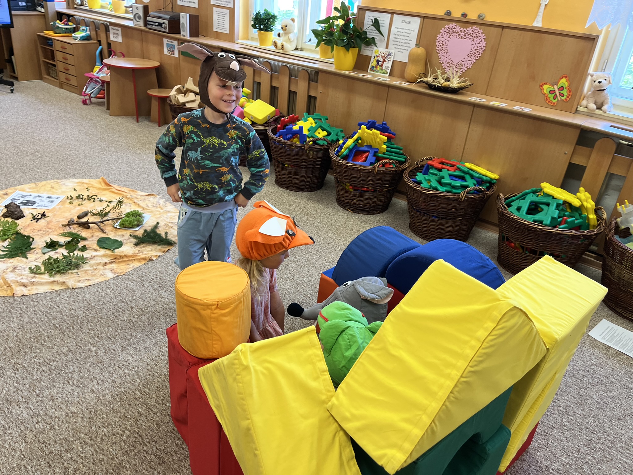 Děti společně postavily domeček pro zvířátka z molitanových kostek, pak se pomocí čepiček proměnily ve zvířátka, zazvonil zvonec a pohádka mohla začít.