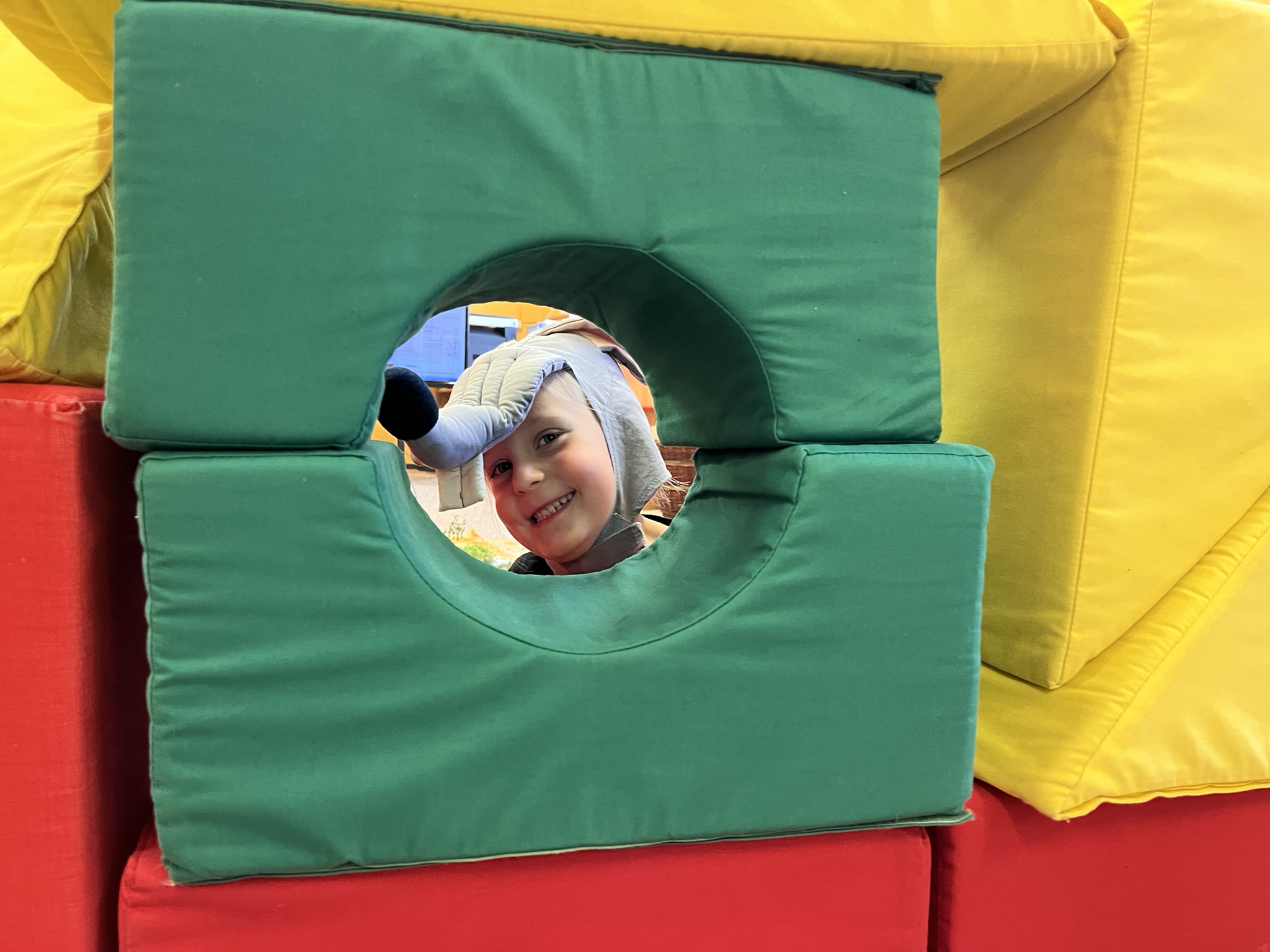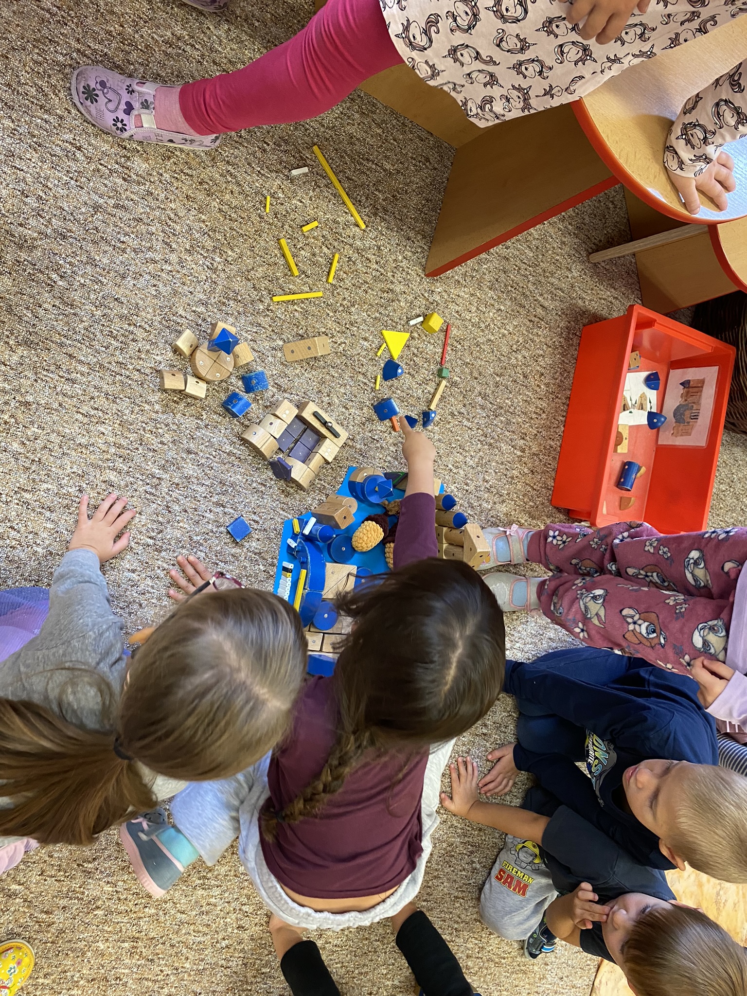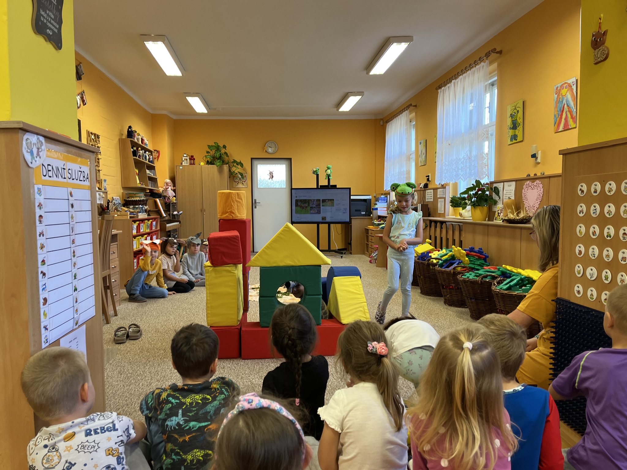 Děti společně postavily domeček pro zvířátka z molitanových kostek, pak se pomocí čepiček proměnily ve zvířátka, zazvonil zvonec a pohádka mohla začít.