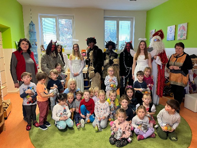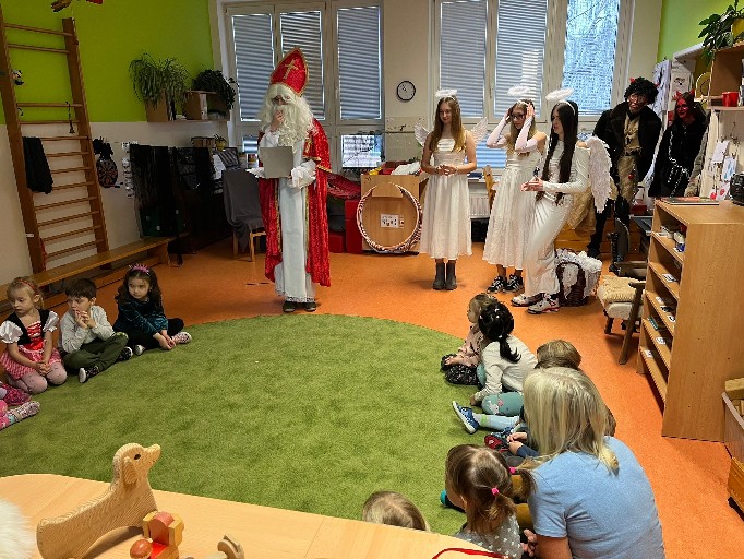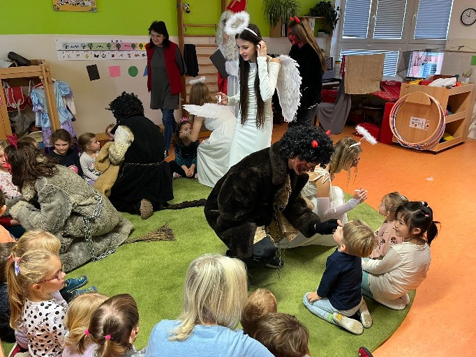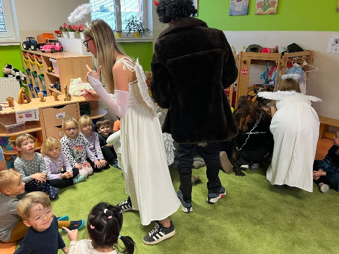 Adventní čas je doba kouzelná, plná očekávání a nezapomenutelných chvil. U nás, u Vrabčáků, začal příchodem mikulášské družiny. Mikuláš otevřel knihu a přečetl pochvaly i malé hříchy. Některé děti měly maličko obavy, ale vše dobře dopadlo . Líbila se i čertovská polka, kterou děti zatancovaly. Andílci a čertíci nám na obličej namalovali kouzelné znaky a děti si převzaly balíčky s perníkem a ovocem. Čertíci se na nás nerozhněvali a my byli za to rádi .