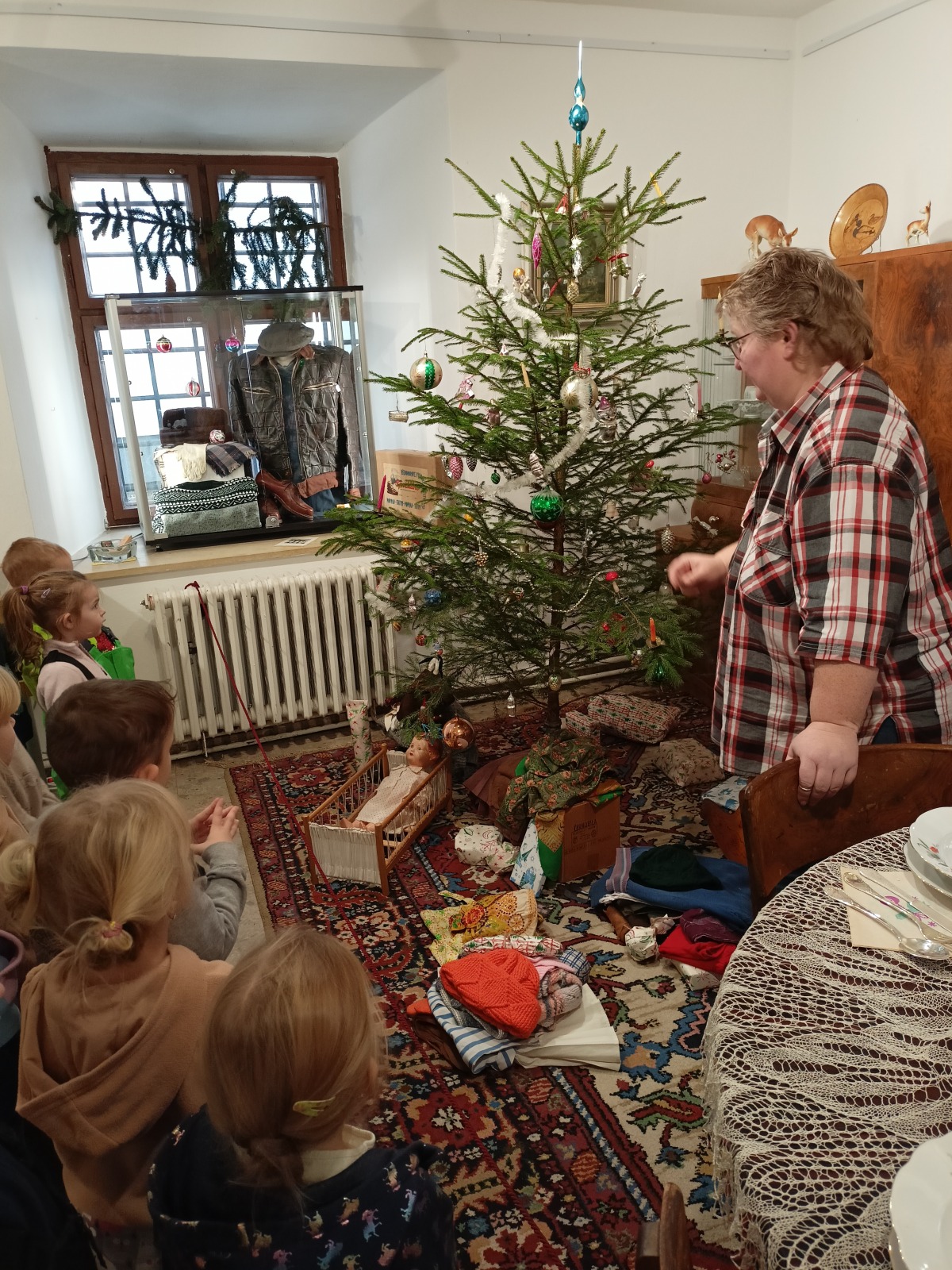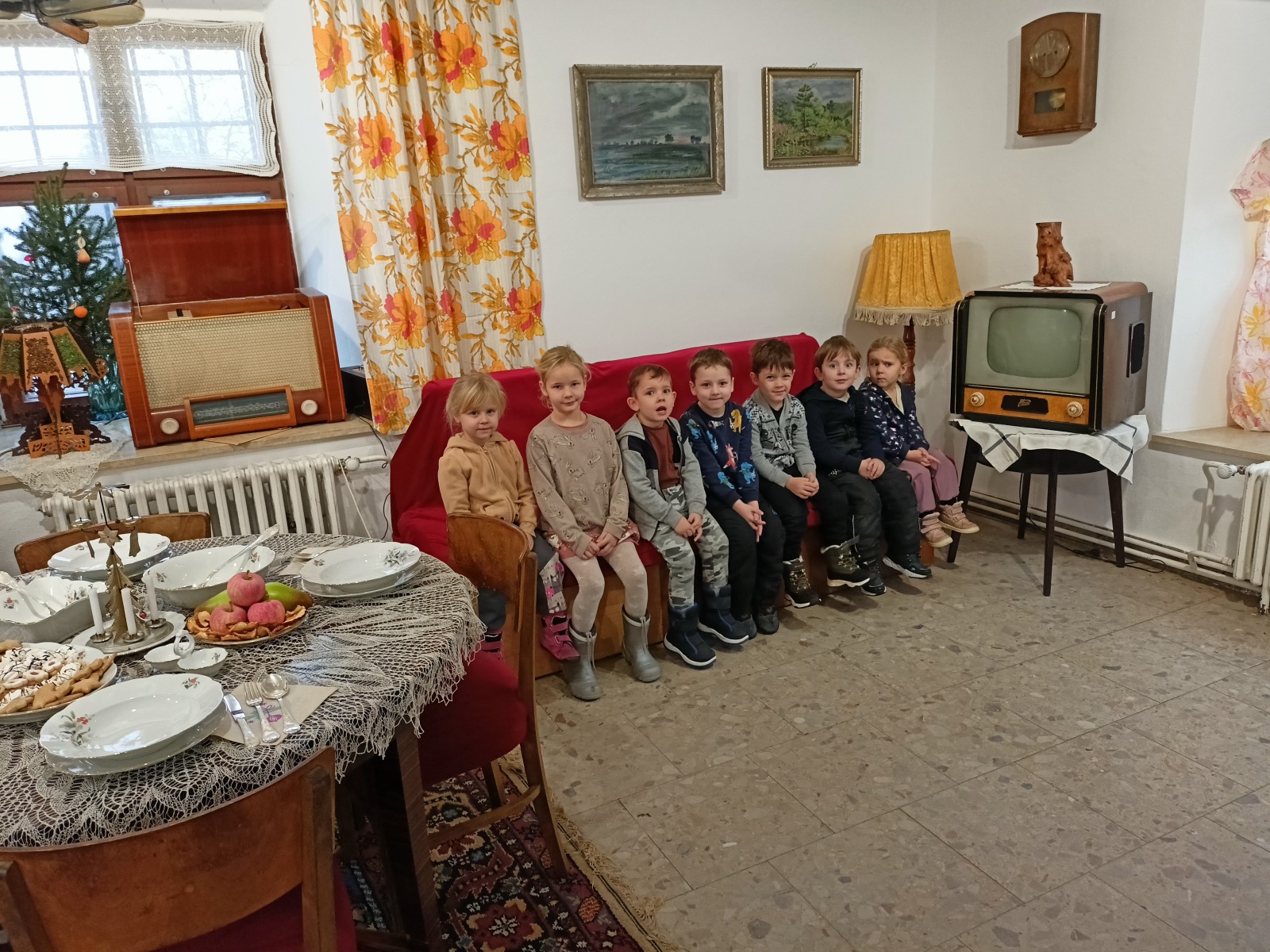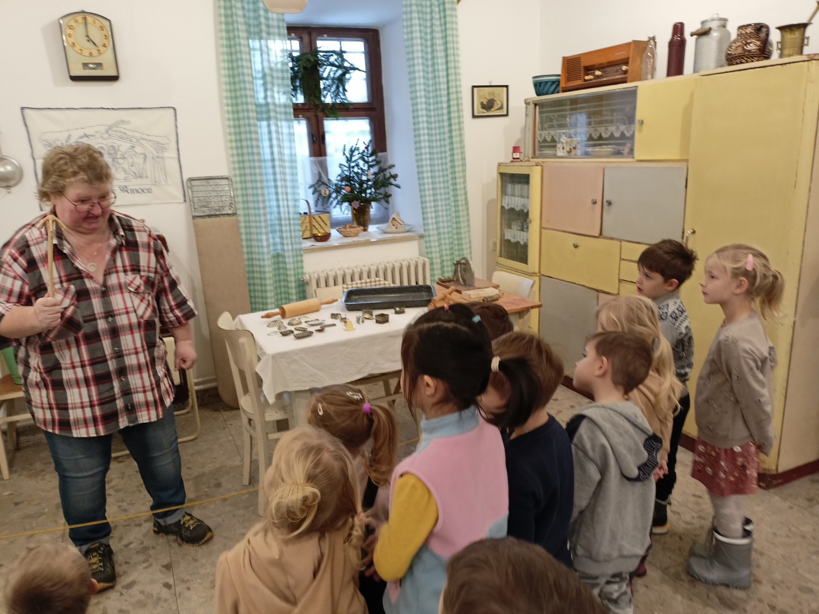 V regionálním muzeu nás výstavou ,,Ježíšek nebo Děda Mráz“ provedla úžasná paní Kamila. S ní jsme se dostali do 50. – 60. let minulého století. Děti poseděly v obývacím pokoji, nahlédly pod stromeček s dobovými ozdobami, dozvěděly se, co tenkrát Ježíšek rozdával za dárky. Podívaly se i do tehdejší kuchyně a mohly porovnat rozdílné vybavení.