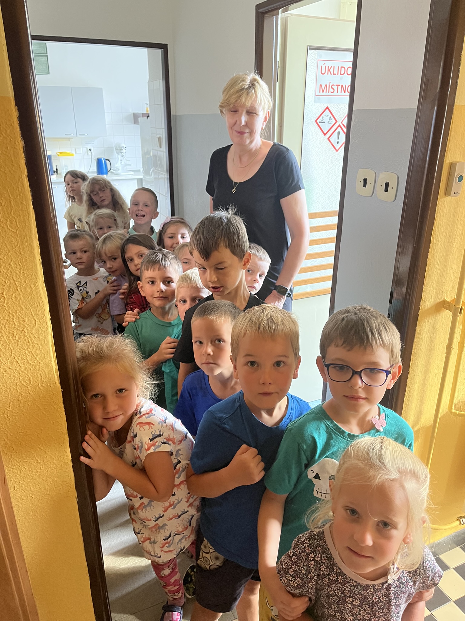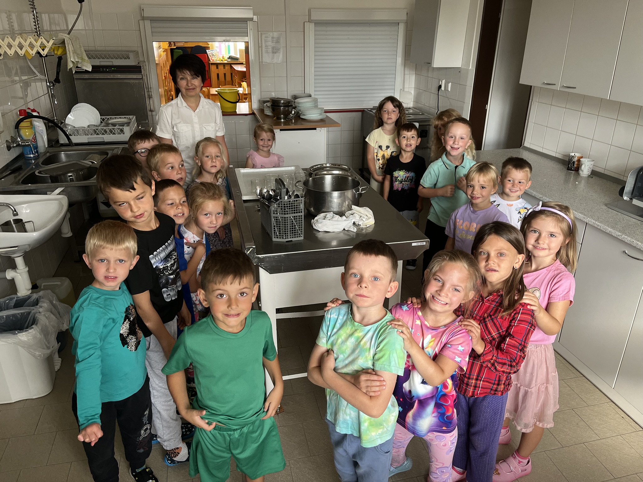 Společně s paní učitelkami si děti prohlédli všechny prostory Pastelky, včetně kuchyně, kde navštívili naší paní kuchařku Irenku a paní školnici Alenku.