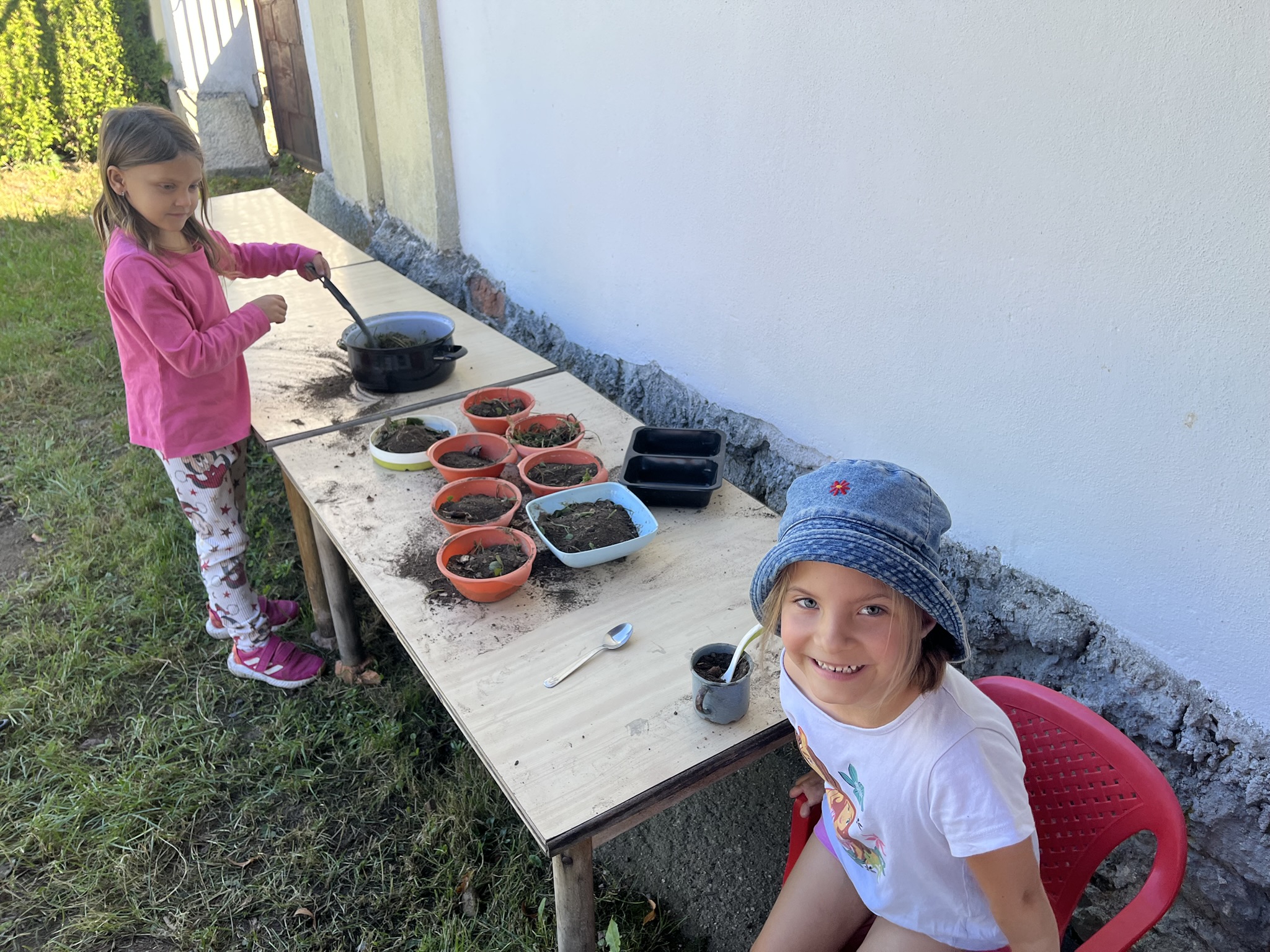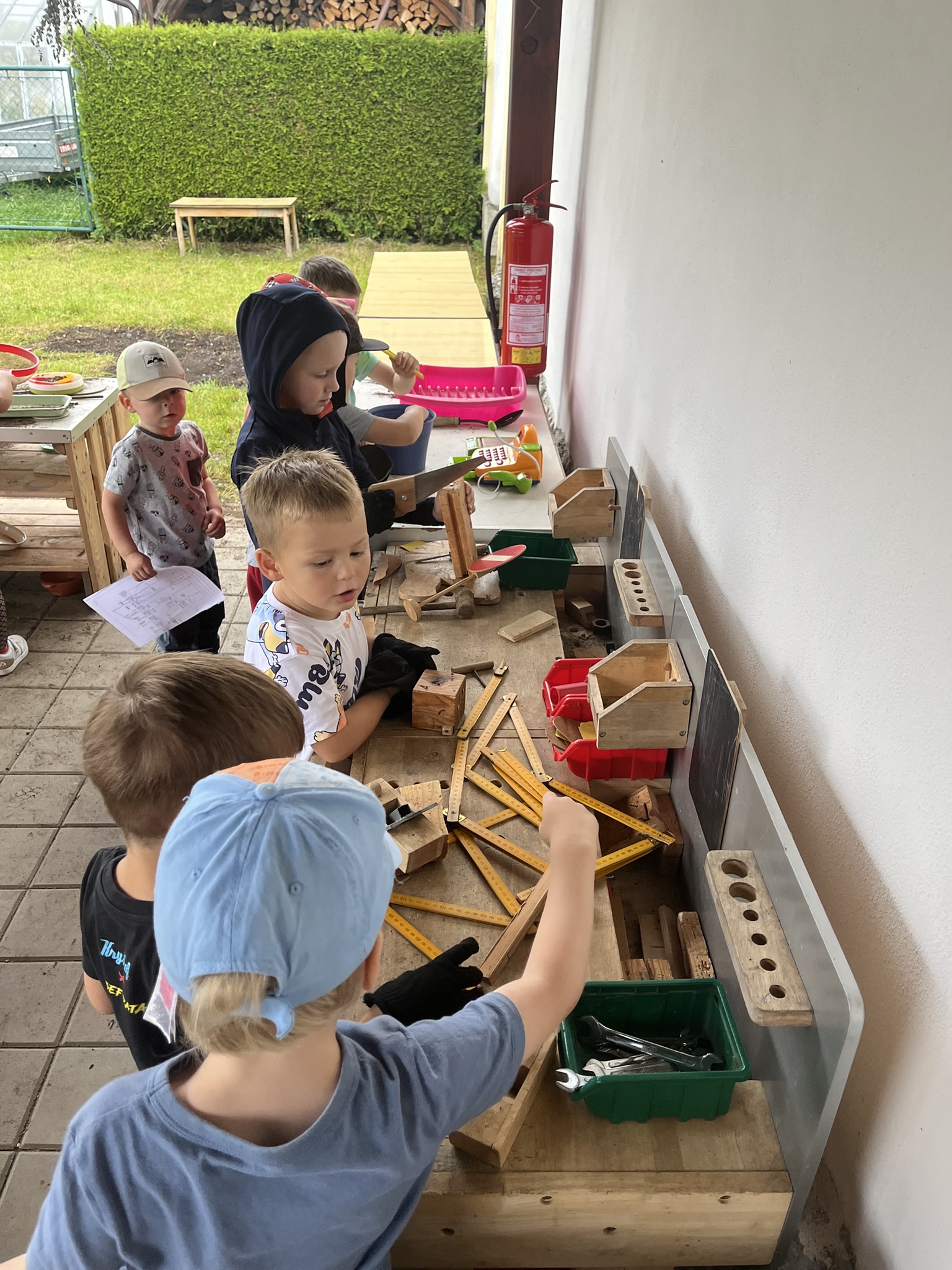 Na školní zahradě si děti hrály v blátivé kuchyňce, v dílničce, u stolečků či na pískovišti.