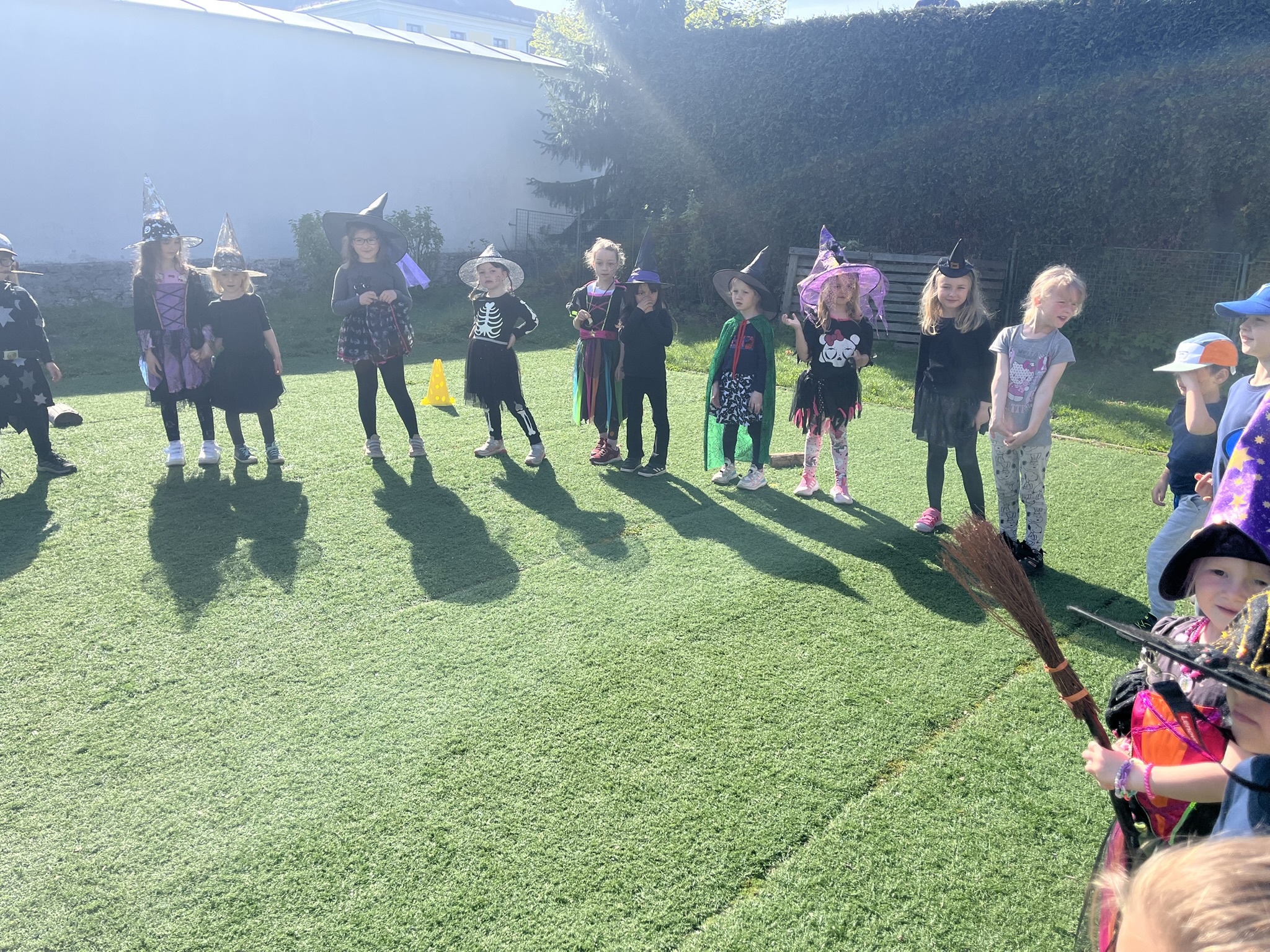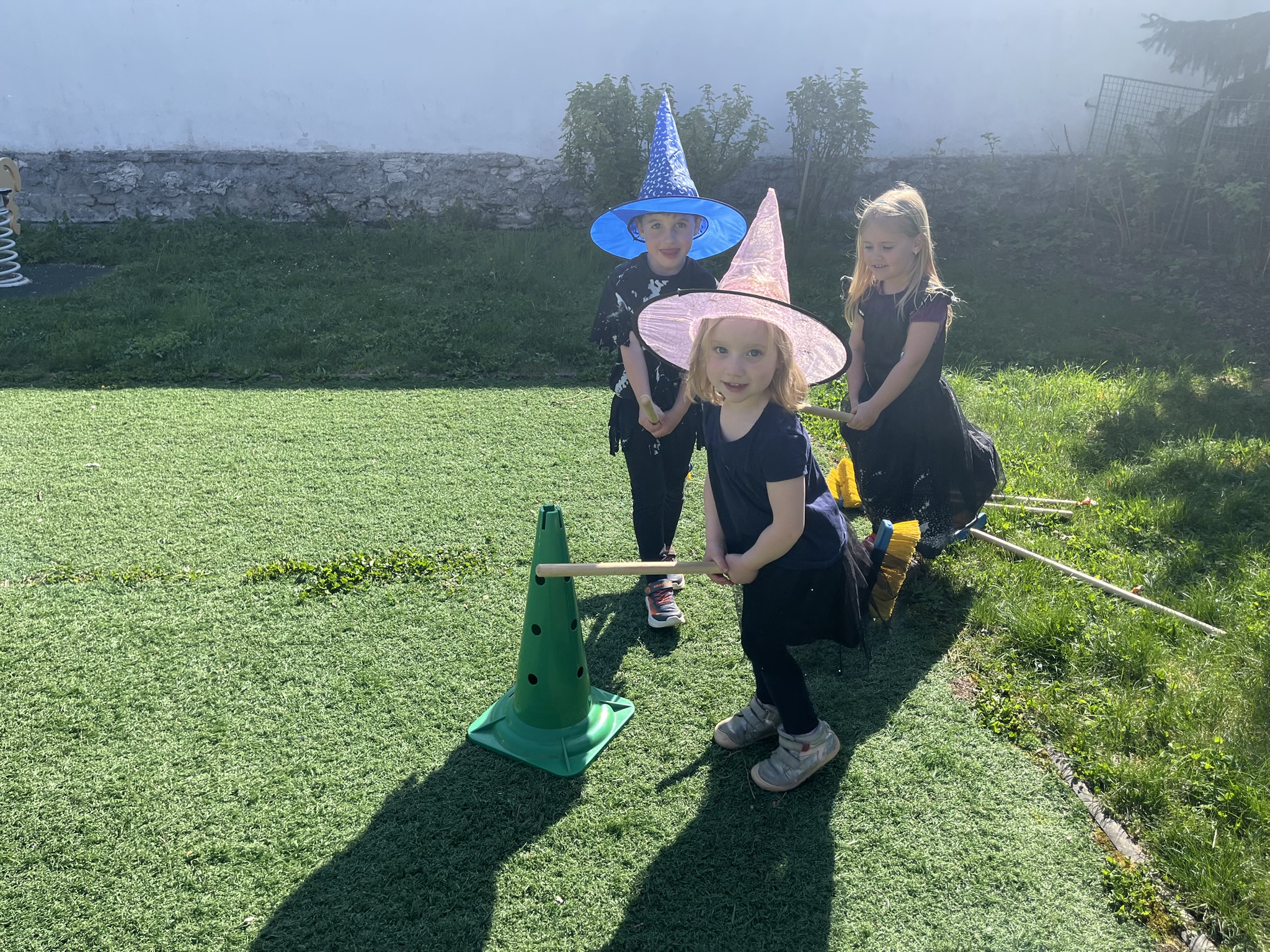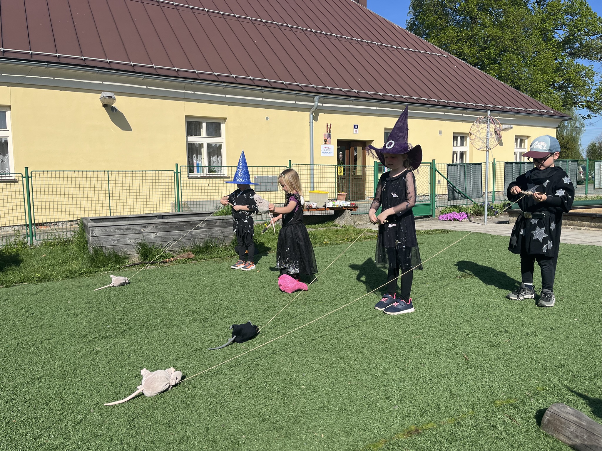 Čarodějnický rej jsme na školní zahradě zahájili kouzelnými zaříkadly a pak děti plnily úkoly - namotávaly havěť, létaly na koštěti, skákaly přes polínka, prolézaly pavučinou,