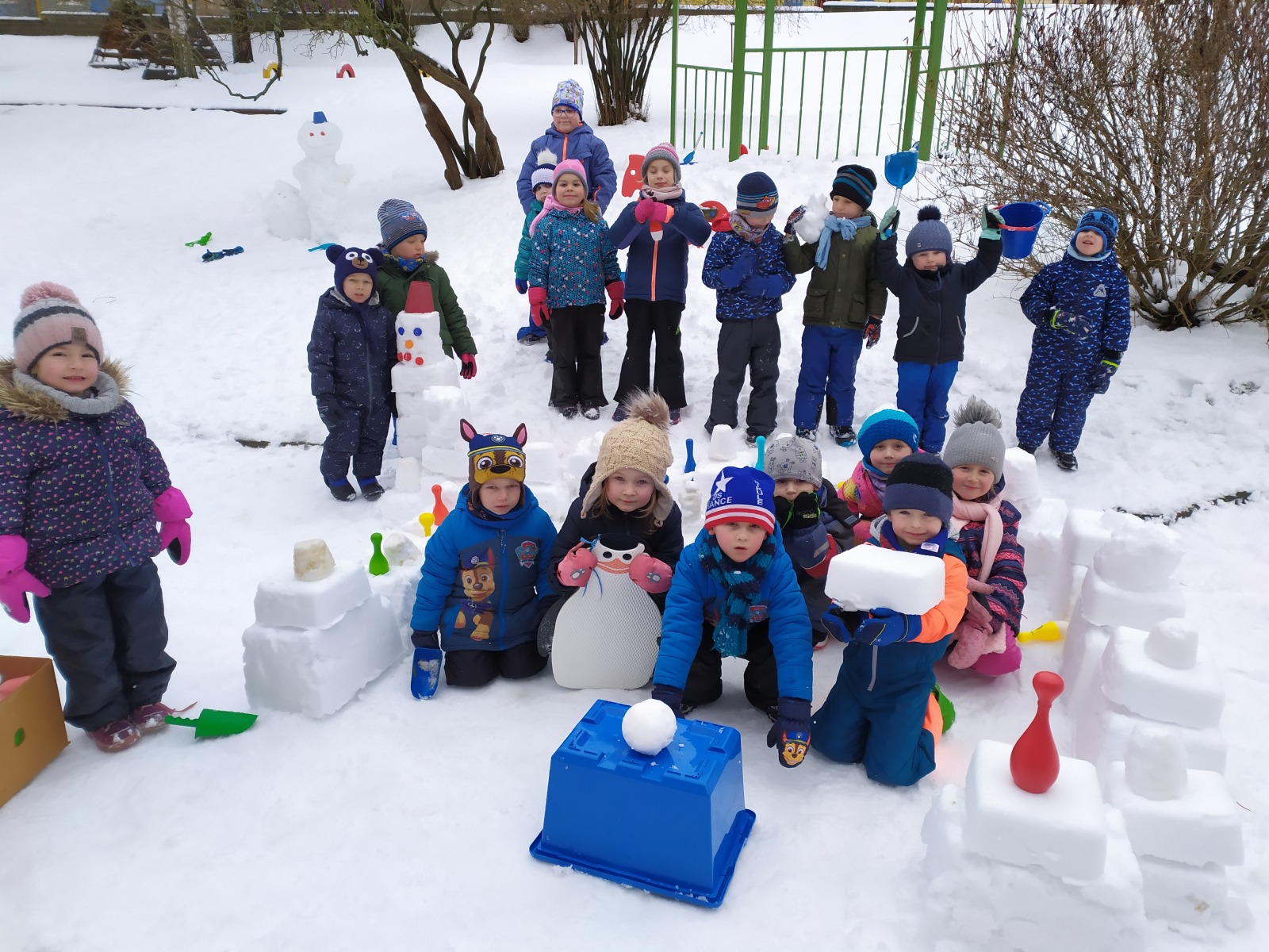 Dnešní sníh zlákal děti z "Koťátka" k tvoření a stavění, a tak kromě obvyklých sněhuláků, se pustily i do společné práce a pomocí bedýnek různých velikostí a jiných tvořítek postavily sněhový hrad.