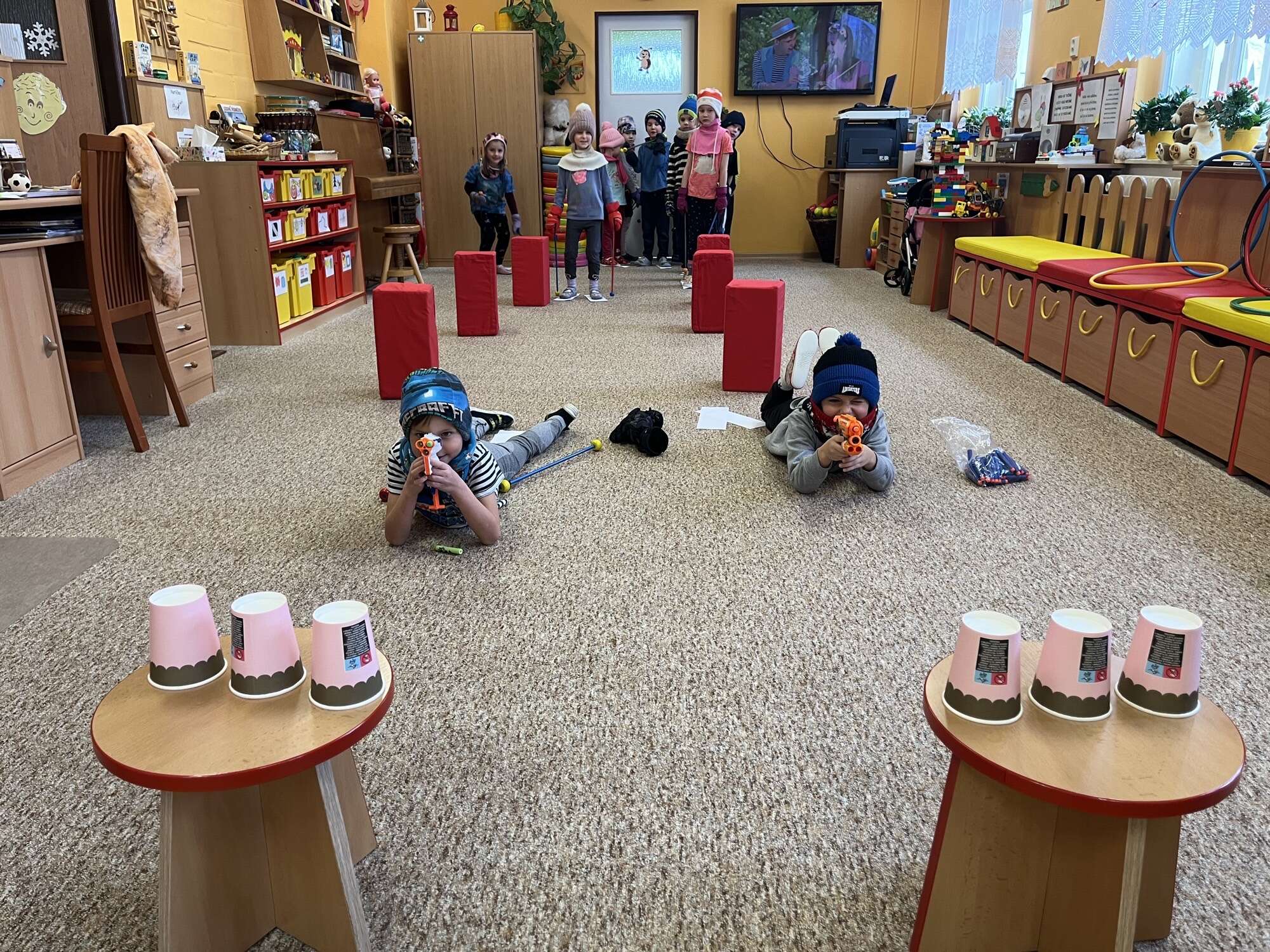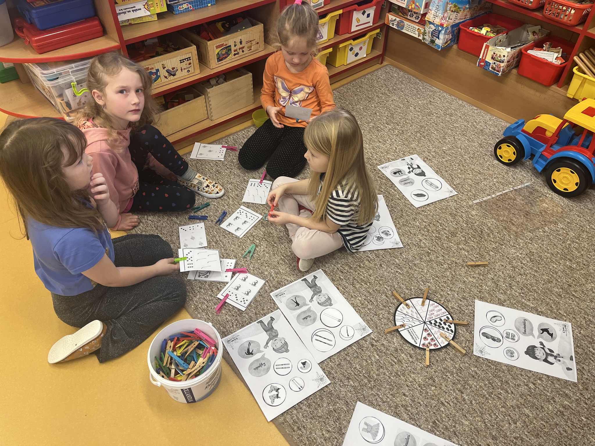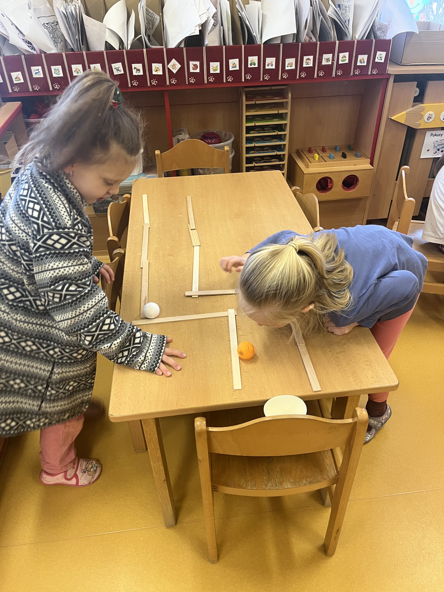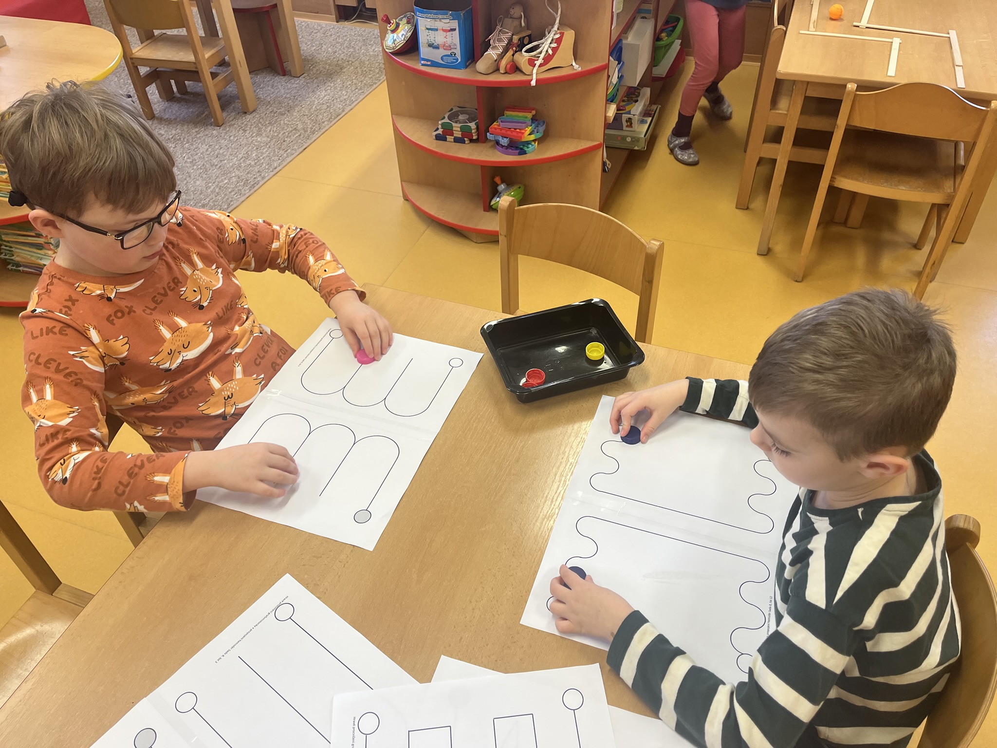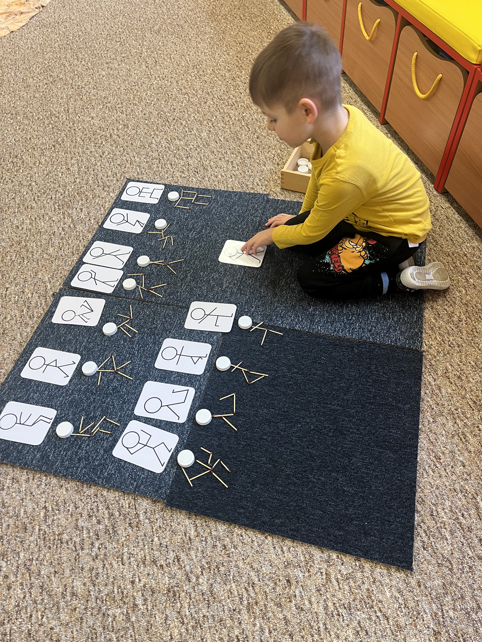 V centru „Kostička“ potom stavěli sportovce podle kartiček z víček a sirek — to byla výzva, která rozvíjela jejich soustředění.