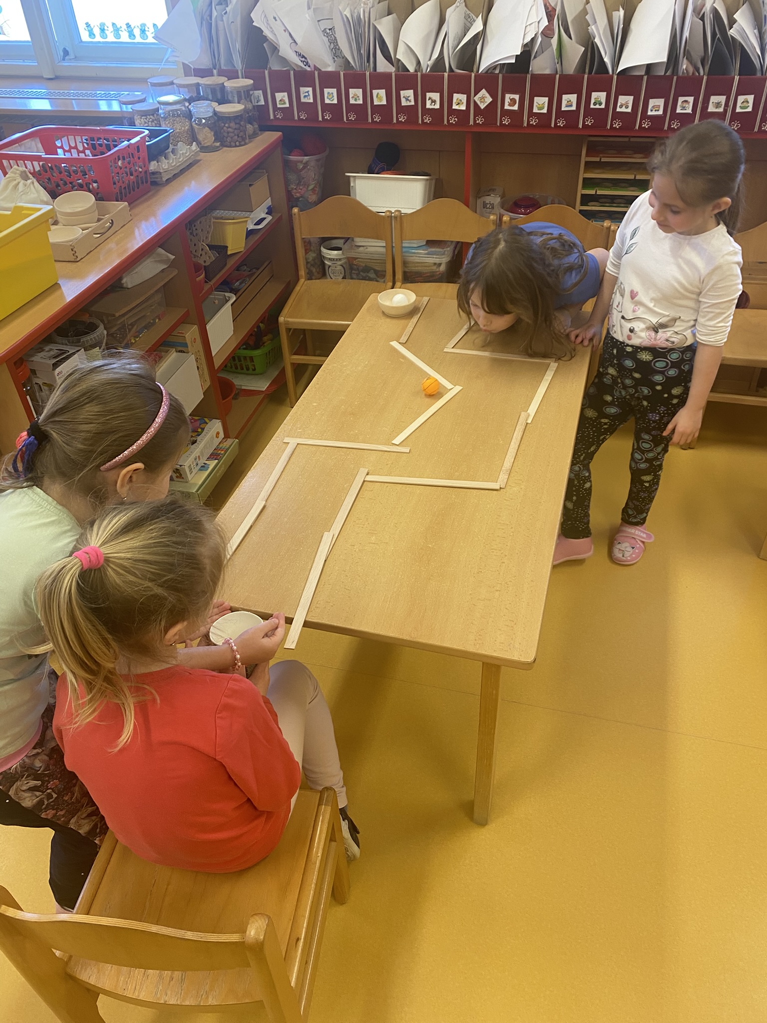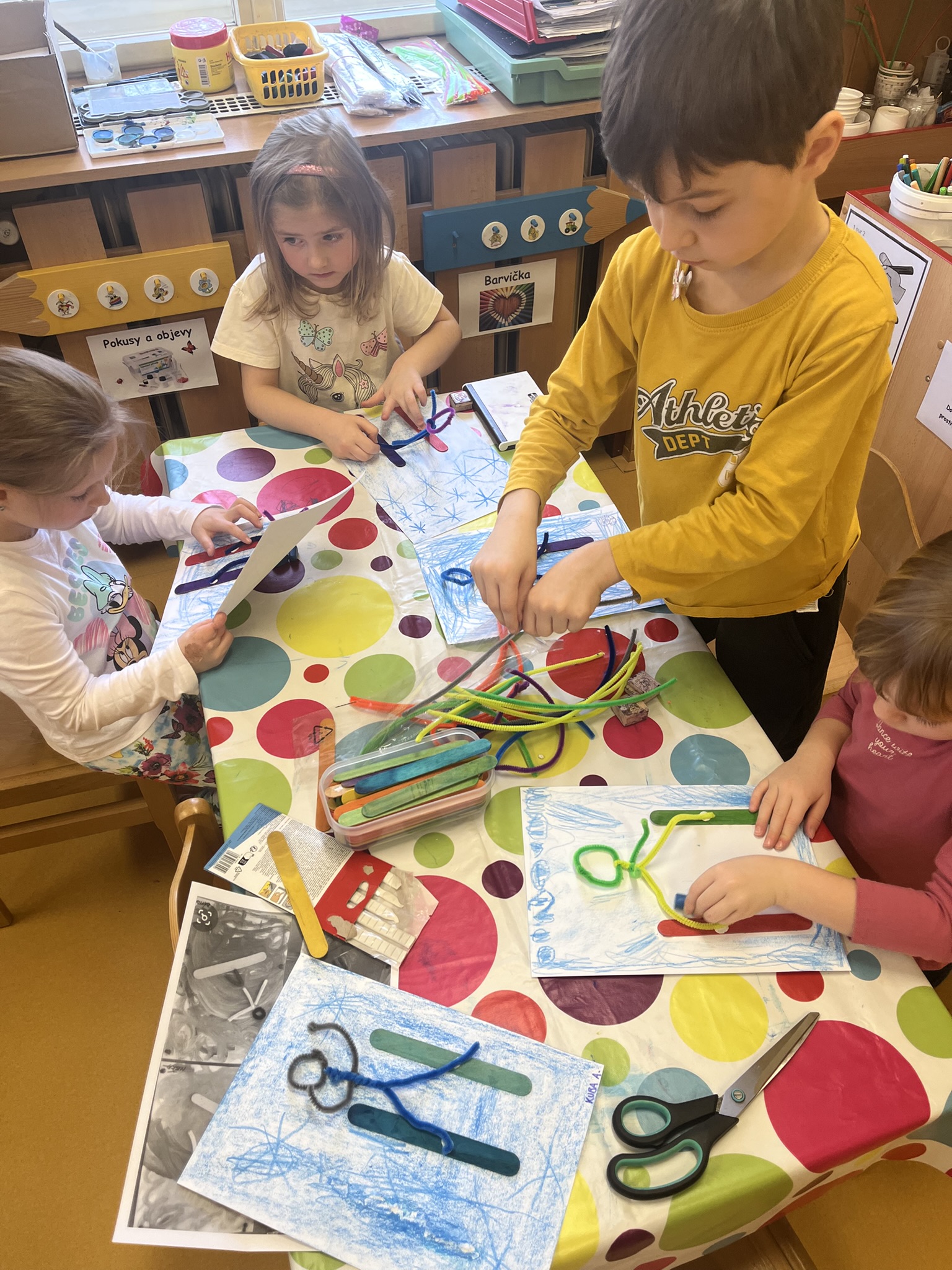 Motýlci vyráběli sportovce z chlupatých drátků a lékařských špachtlí, procvičovali si foukání míčku po dráze do kelímku,