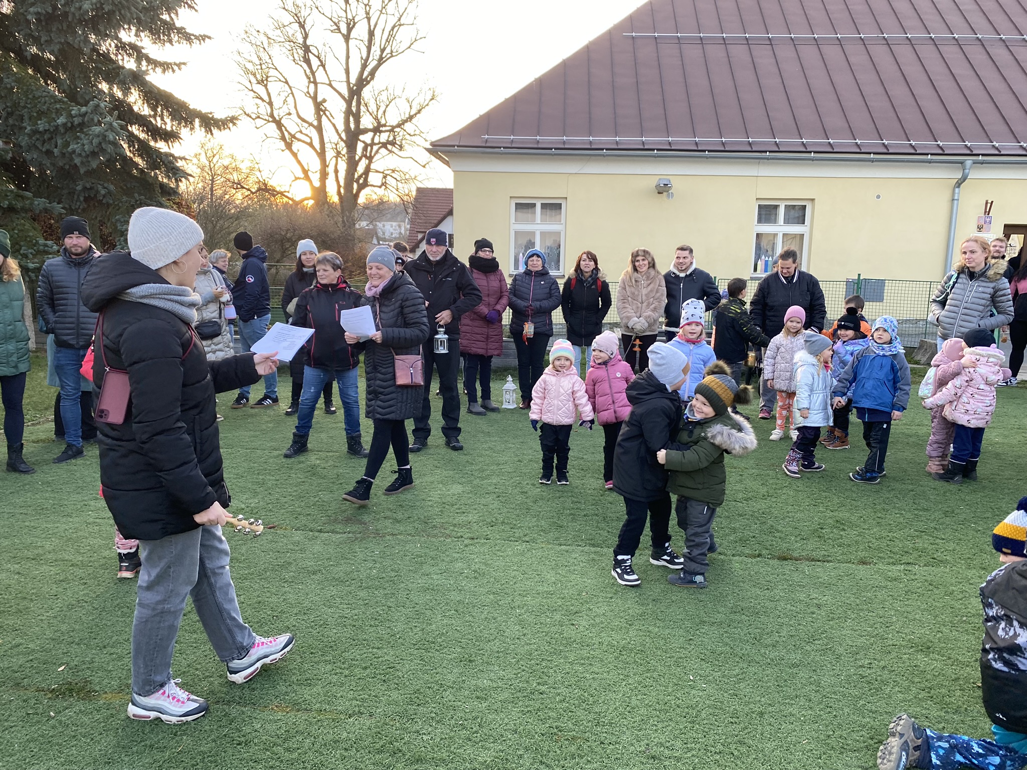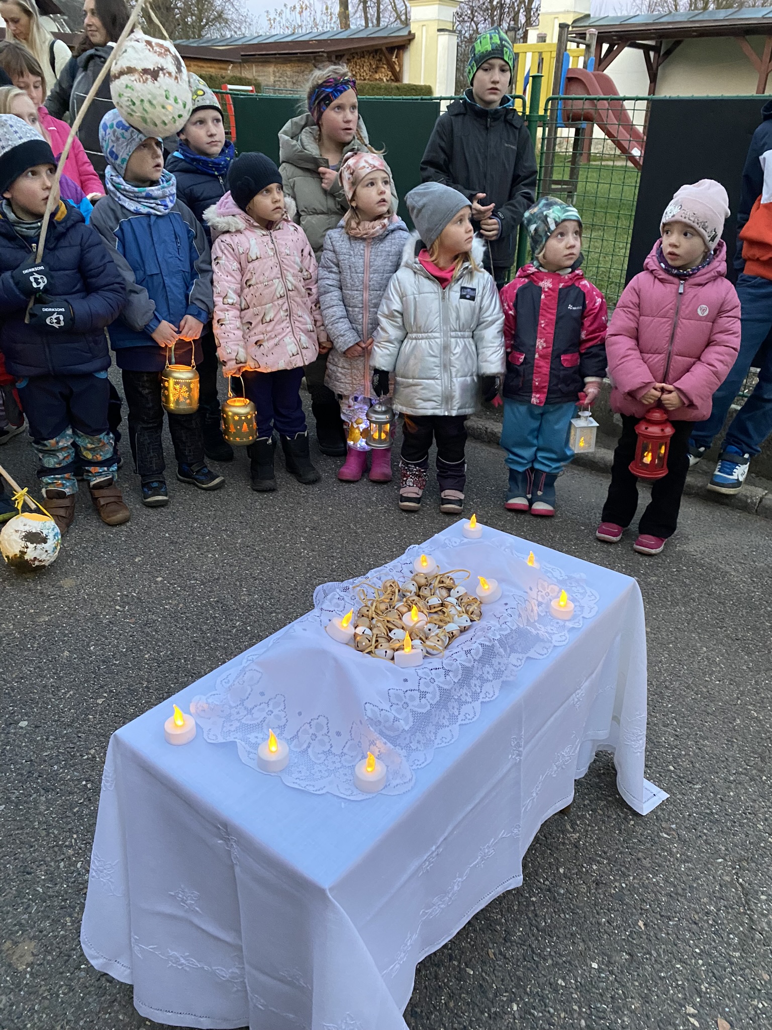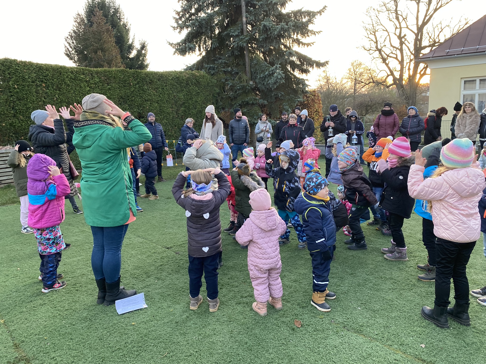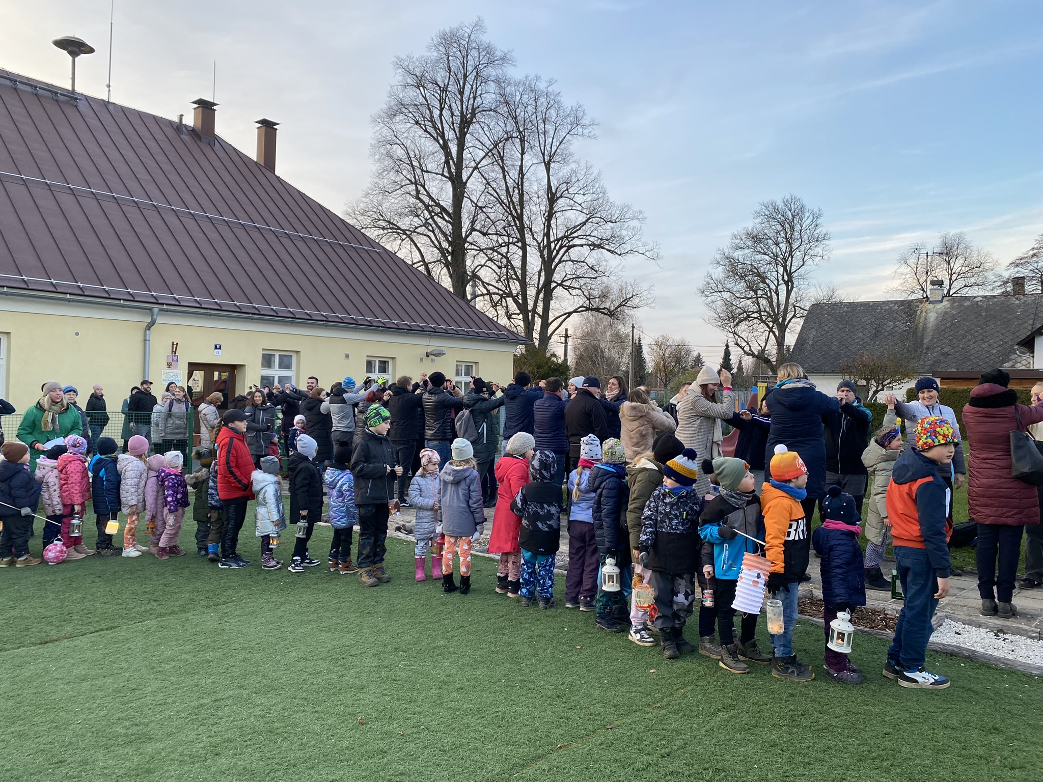 Rodiče dětem vytvořili zimní bránu a děti s lampiony či lucerničkami procházeli školní zahradou a pokračovali do okolí školky.
