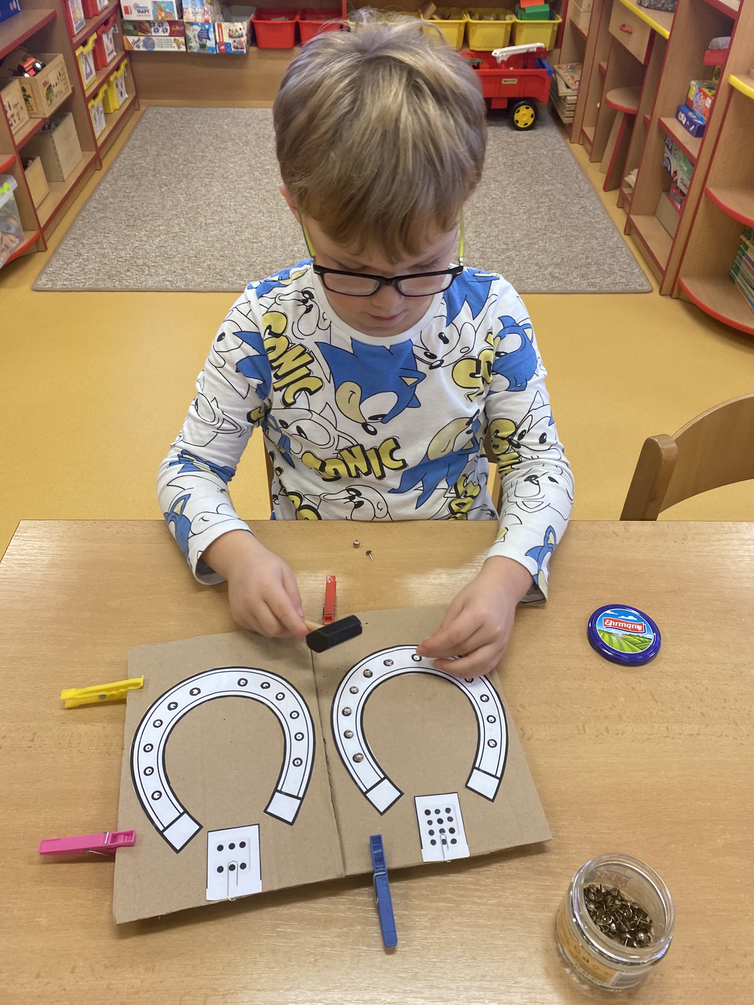 - hra na kováře a trénink zatloukání hřebíčků do podkovy,