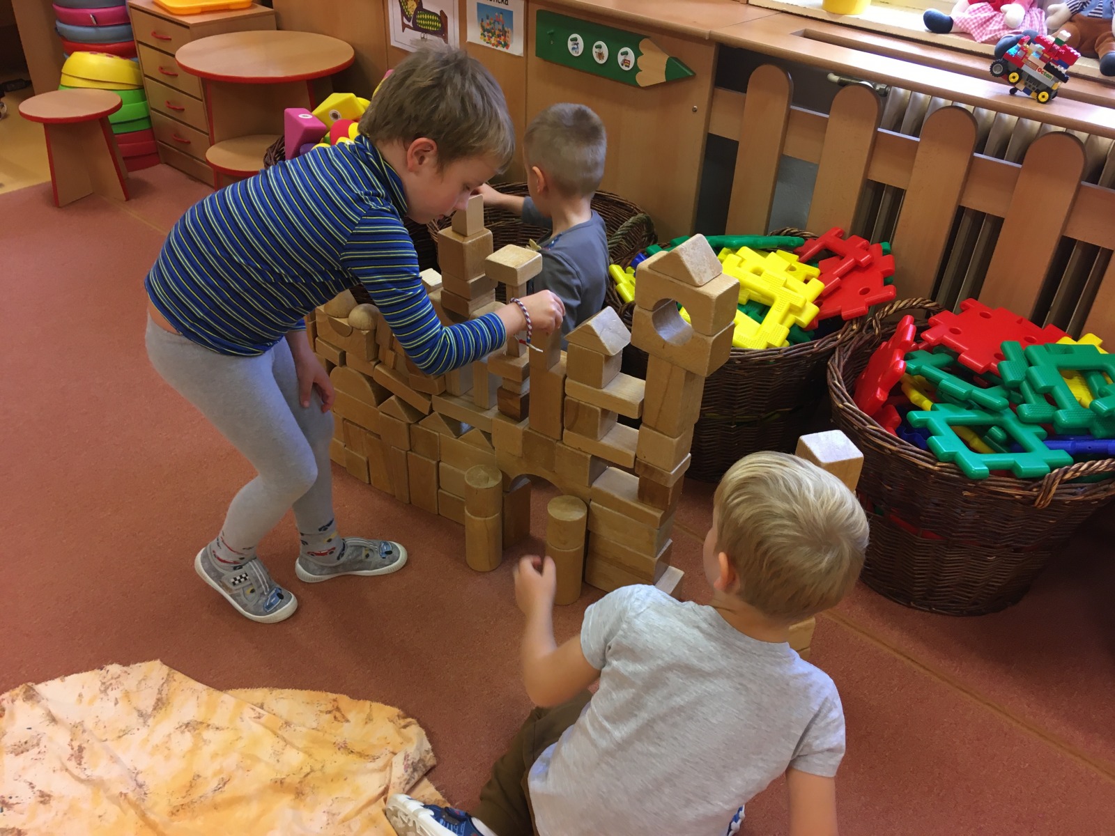 V centru KOSTIČKA stavěly město s bránou a také zkusily vytvořit meč pro Martina.