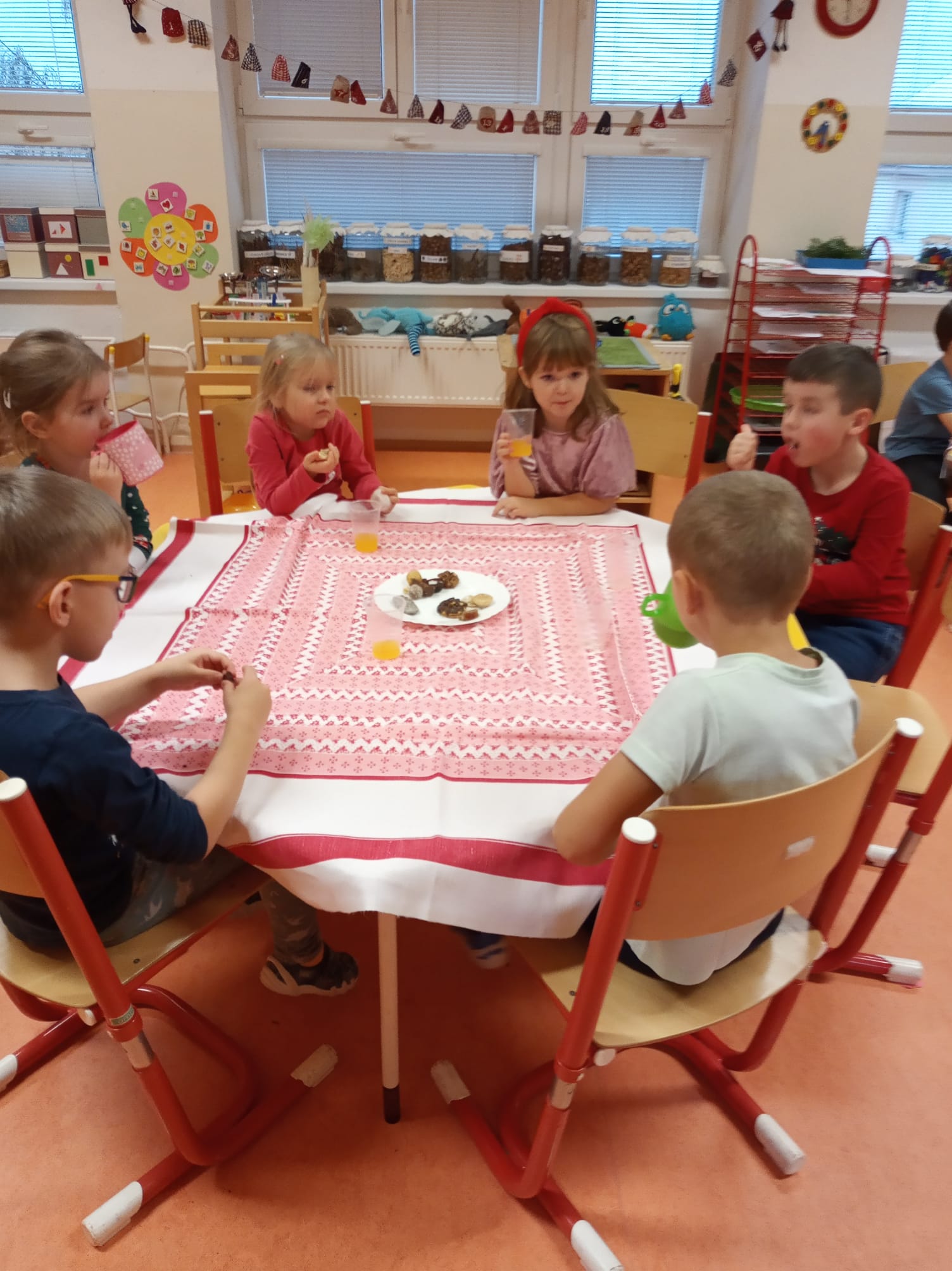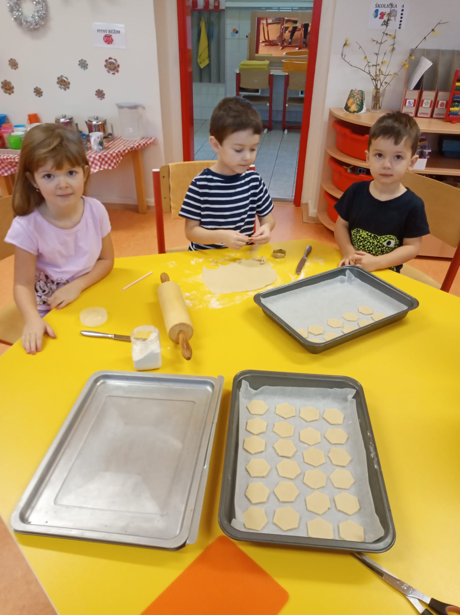 V pondělí jsme si s dětmi upekli z připraveného lineckého těsta cukroví. Během úterý jsme se pustili do promazávání cukroví a při pobytu venku jsme navštívili kapli sv. Barbory, kde byla krásná výstava betlému. Nejvíce děti zaujal betlém vyrobený z lega. Dále jsme se přesunuli na náměstí, kde byla spousta krásné vánoční výzdoby. Každé z dětí si zazvonilo na vánoční zvoneček a myslelo přitom na své tajné přání. Ve středu nastal dětmi očekávaný den, navštívil nás Ježíšek a přinesl spoustu dárků. Děti si pohrály s novými dárky, pochutnaly si na výborném cukroví a zazpívaly si koledy. Děkujeme maminkám za výborné cukroví.