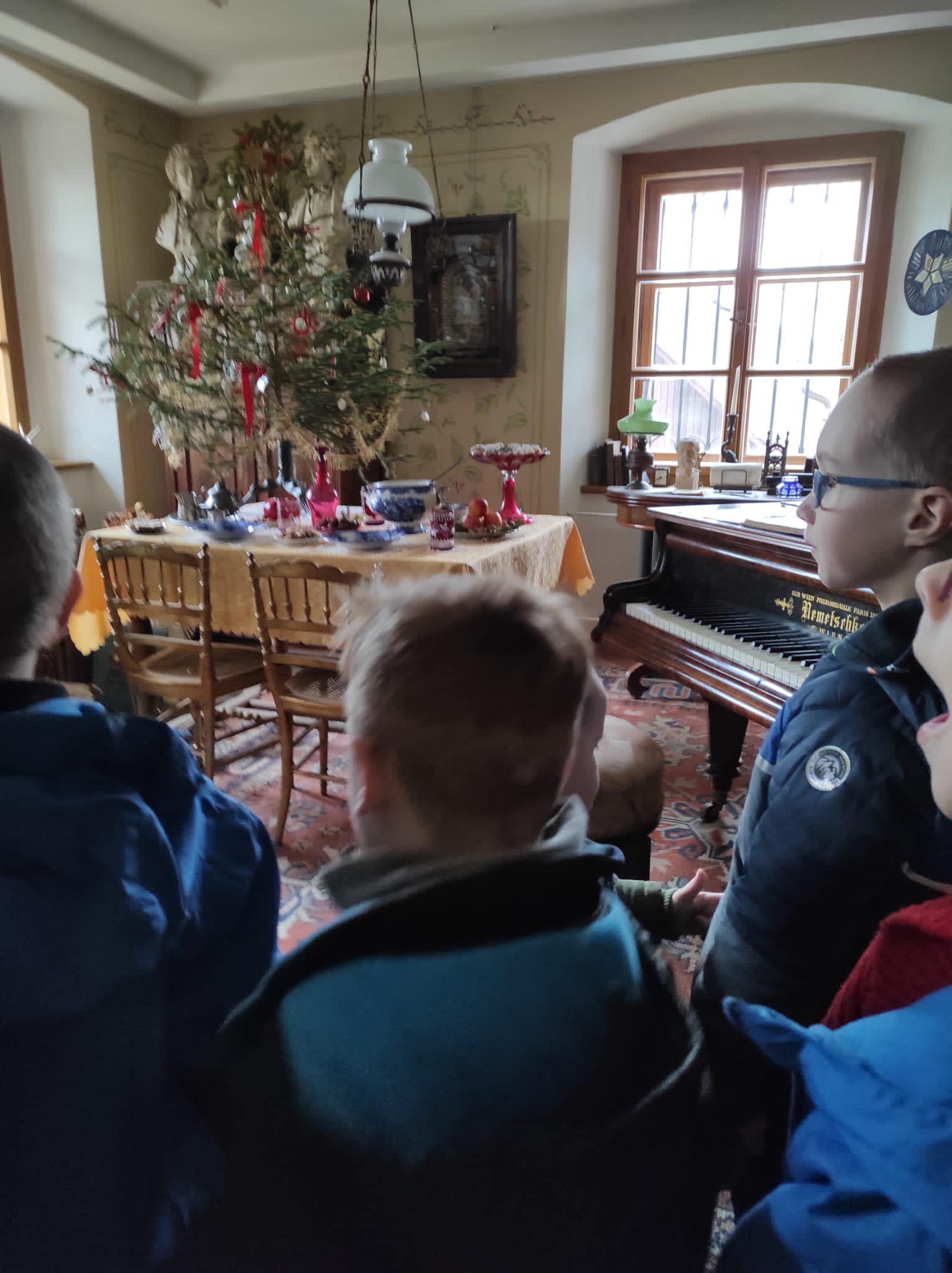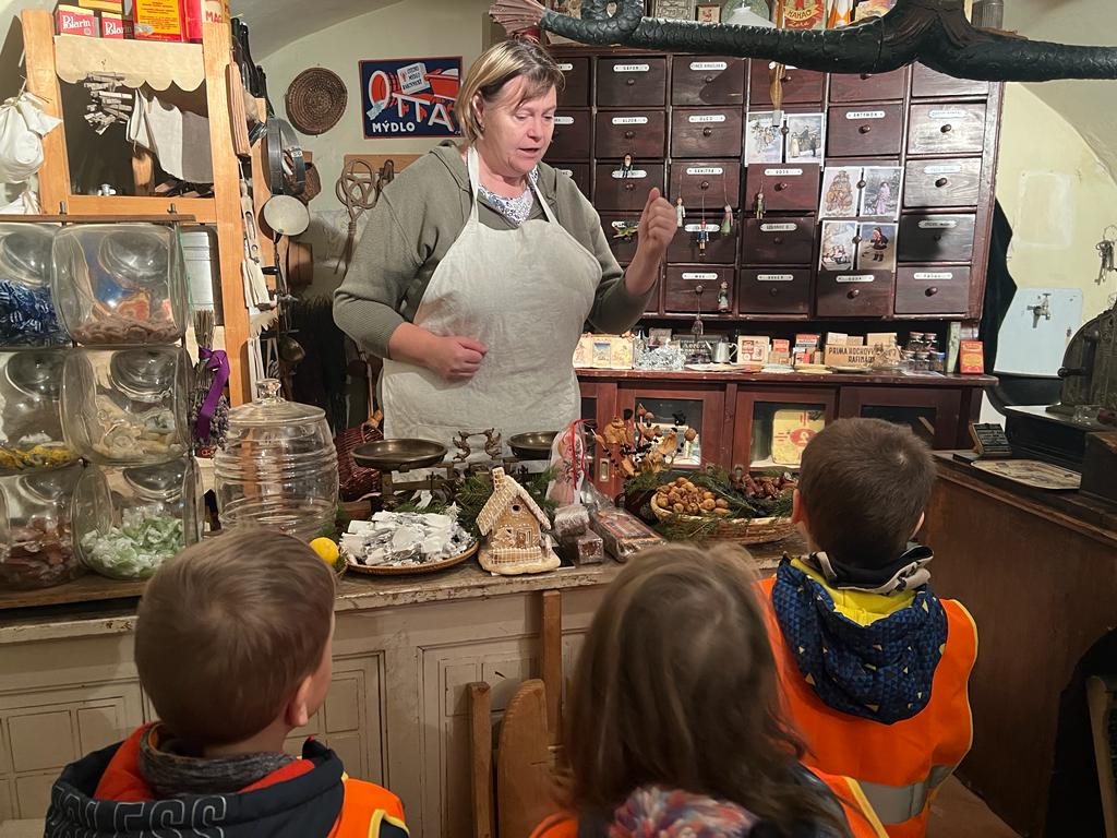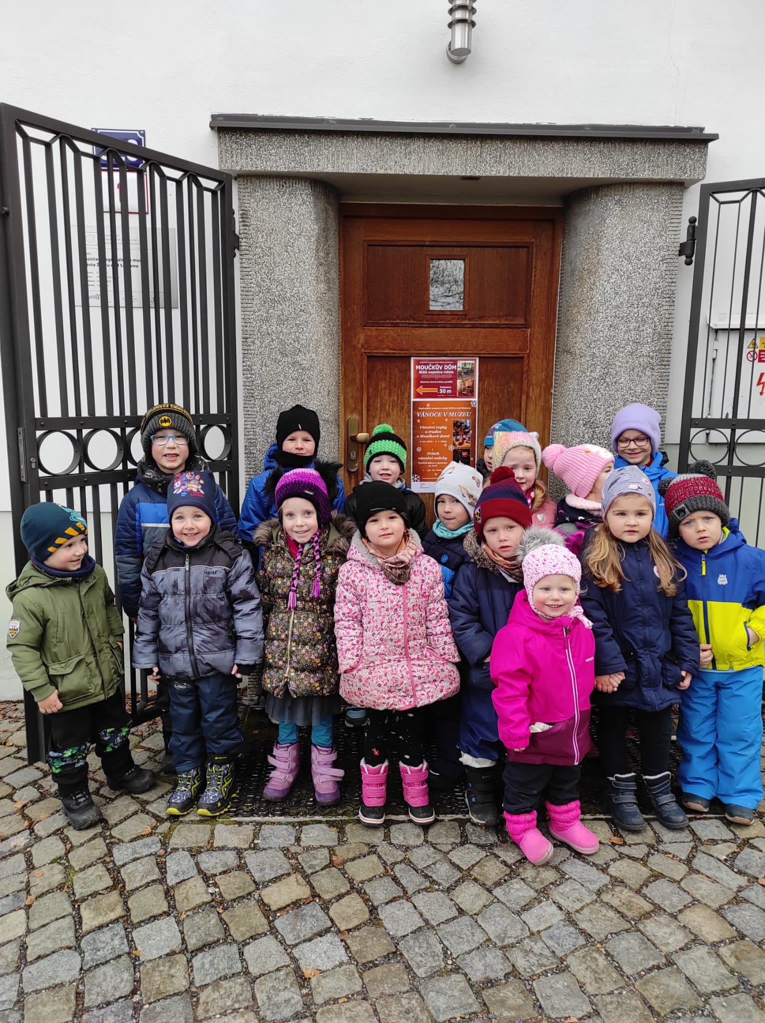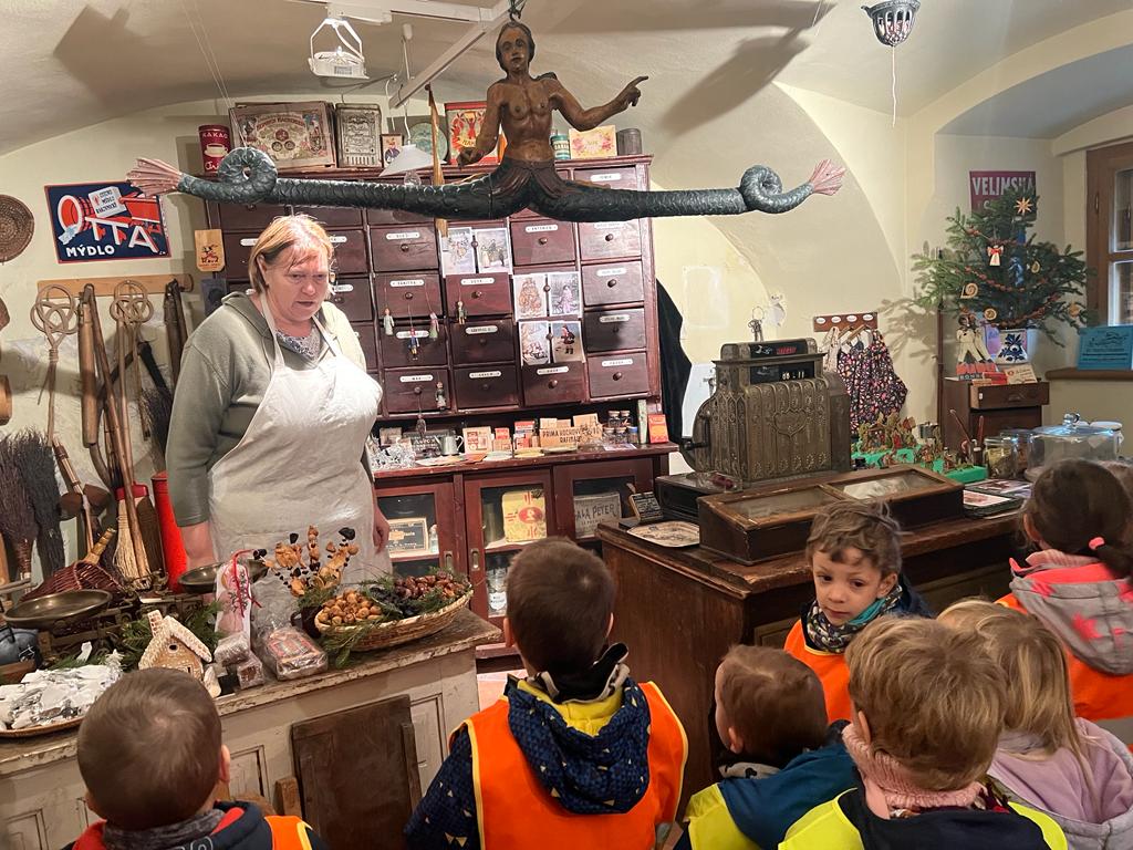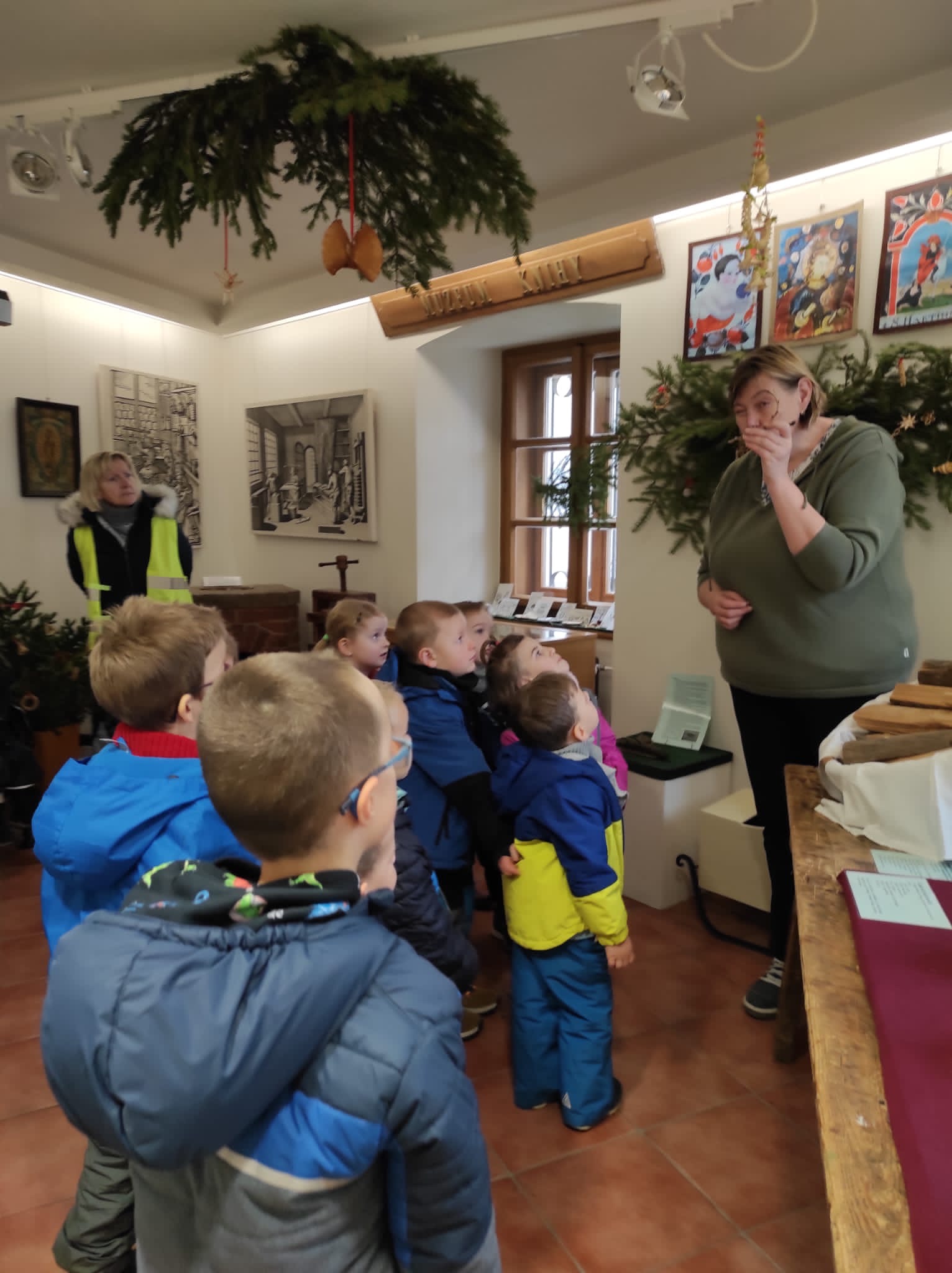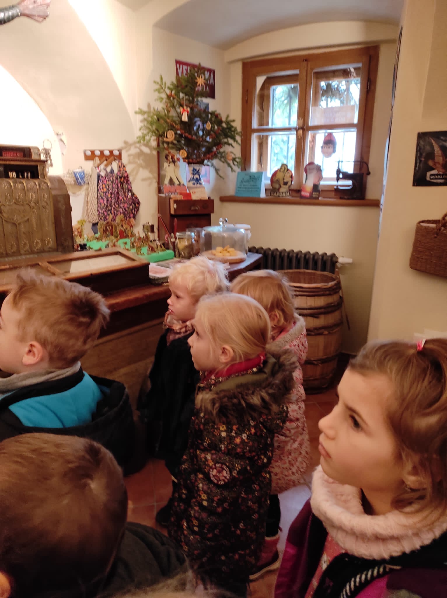 Dne 19.12.2023 jsme navštívili adventní výstavu v Moučkově domě. Měli jsme možnost prohlédnout si jak dříve vypadal obchod, kde lidé nakupuvali na Mikuláše a Vánoce. Následně jsme byli zavedeni do tradiční domácnosti. Prohlédli jsme si vánoční výzdobu, štědrovečerní pohoštění a dozvěděli jsme se jak dříve Štědrý večer probíhal. Nakonec nás paní průvodkyně seznámila s tradicemi. Kromě pouštění lodiček a lití olova, jsme se dozvěděli o tahání polínek nebo obracení hrníčků, které si děti i vyzkoušely.