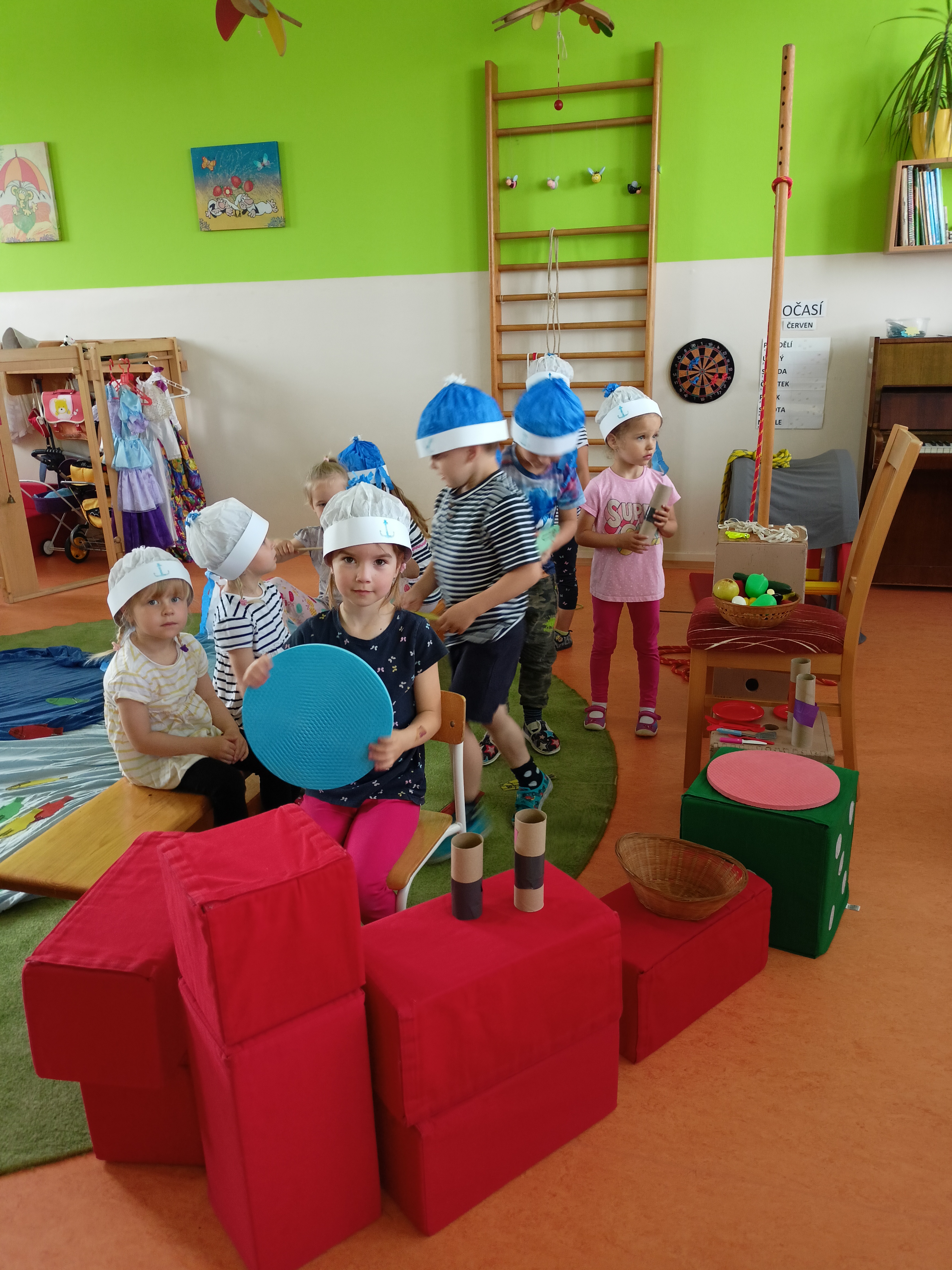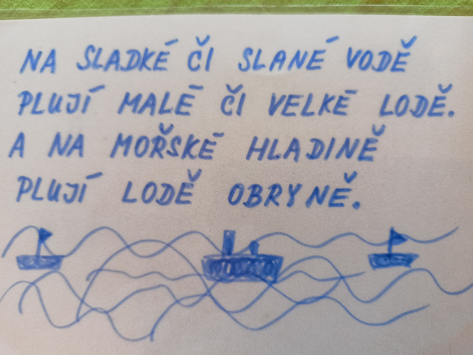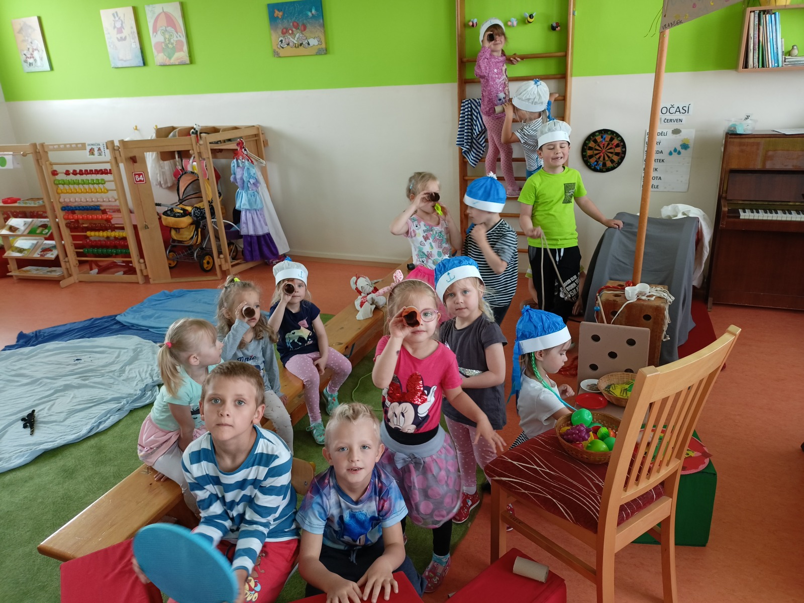 V týdnu s námořníky jsme byli většinu času na lodi, kterou jsme si postavili ve třídě. Kapitán vždy zodpovídal za loď, námořníci plnili povely, ujali se kormidla, uklízeli loď, vyhlíželi pevninu, chytali ryby a grilovali je . Tvořivá dramatika byla součástí naší hry – děti zažily bouři, velké vlny, staly se potápěči lovící mušle, zažily výcvik námořníků.