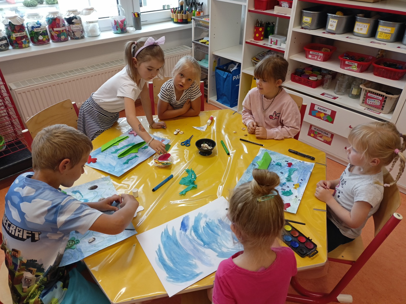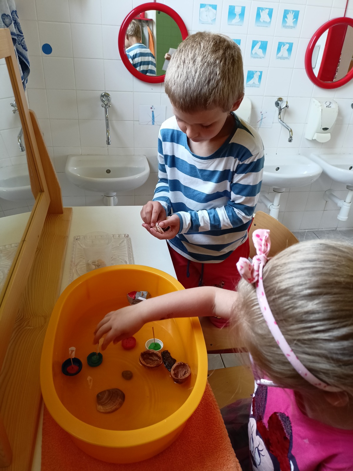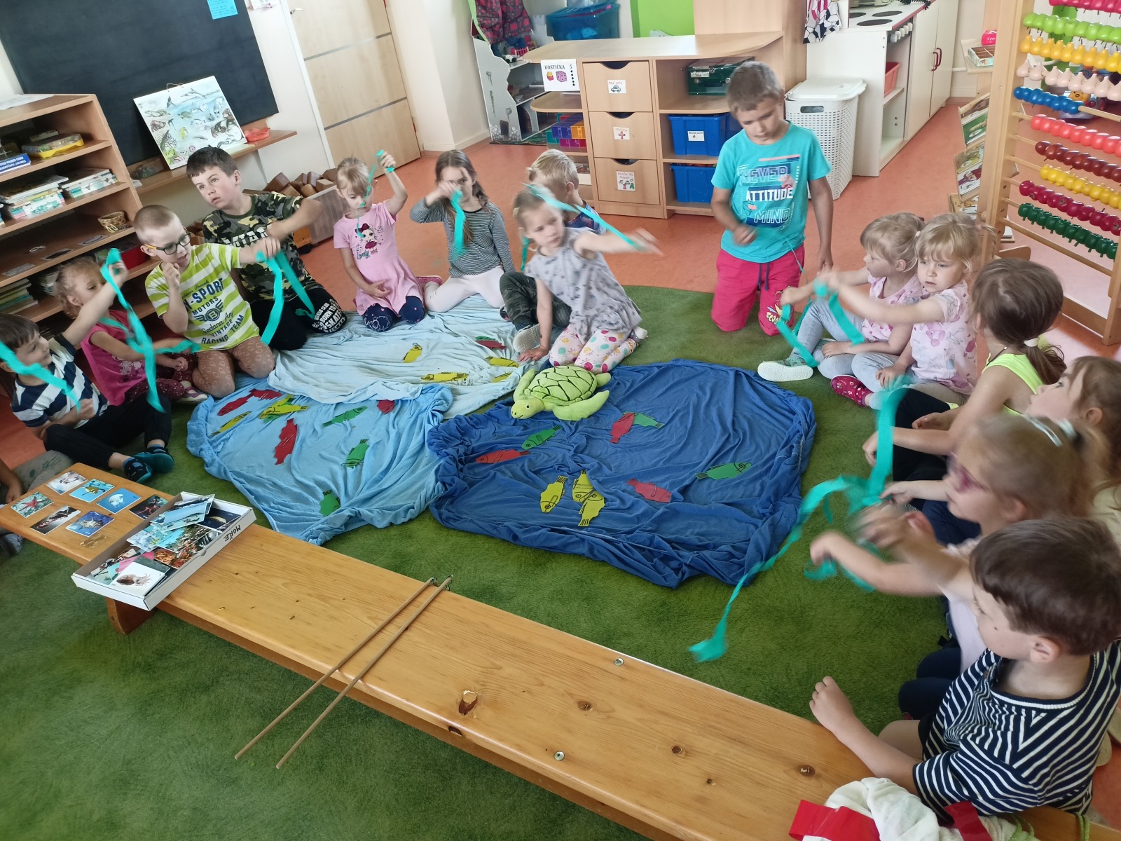 V centrech aktivit si zkusily postavit pyramidy, tvořily moře s rybkami a želvami, lupou prozkoumávaly škebličky, pouštěly vyrobené loďky po vodě, cvičily výstup na žebřiny při pozorování krajiny a ostrovů. Předškoláčci si vyzkoušeli lámat špejle (sestavovali z nich kostry ryb) a správné zavazování uzlíků. Děti z Vrabčáků získaly základní poznatky o moři a životu v něm, krátká říkadla si osvojily při rytmizaci.