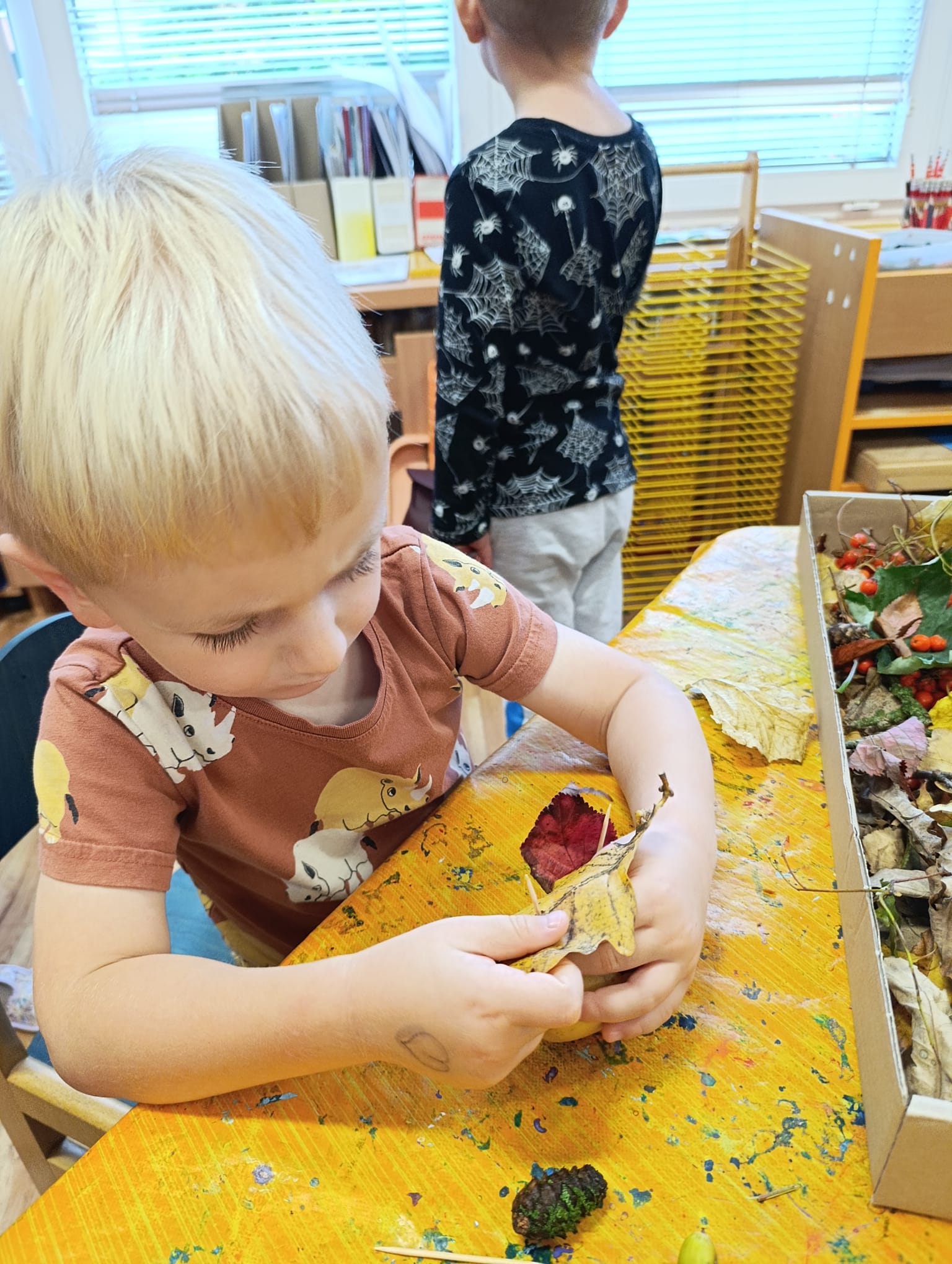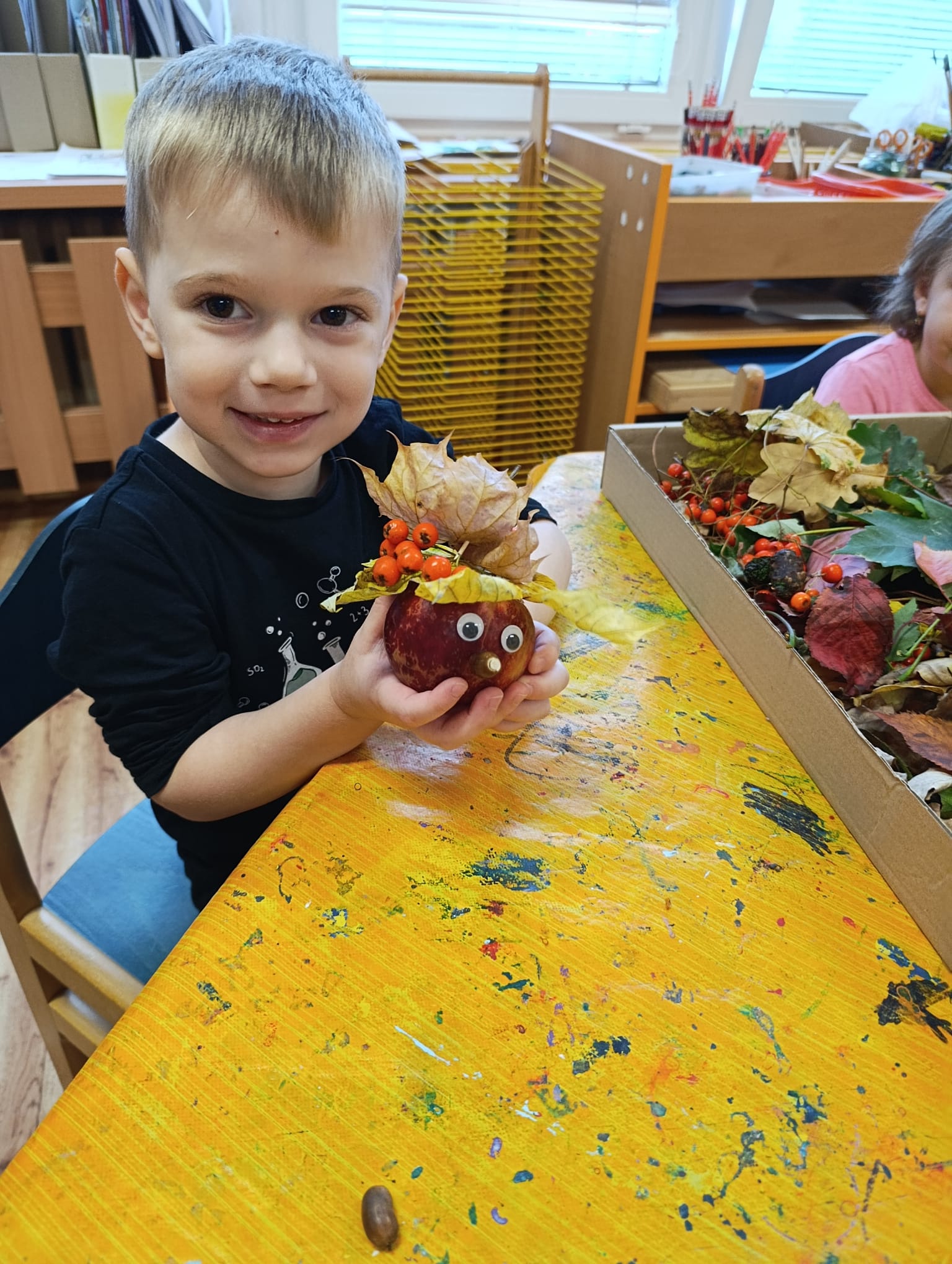 Začali jsme vyrábět první barevné dekorace z listů a přírodnin, které jsme si přinesli z procházek.